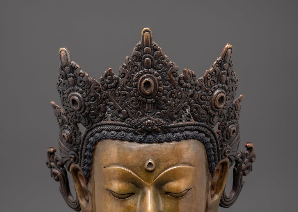 This Tibetan Buddha Head Sculpture symbolizes Buddhist tranquility and creative excellence. Crafted from oxidized copper, this revered bust showcases exquisite craftsmanship in the crown, elongated earlobes adorned with elegant earrings, and a serene, contemplative gaze. This sculpture, measuring 37 cm in height and 38 cm in breadth, and weighing 7.06 kg, constitutes a significant and commanding presence for any sacred place, altar, or display setting.