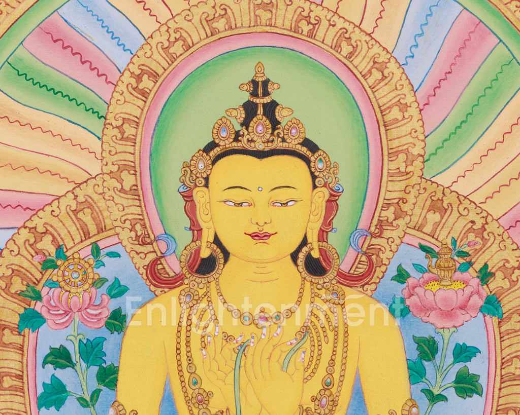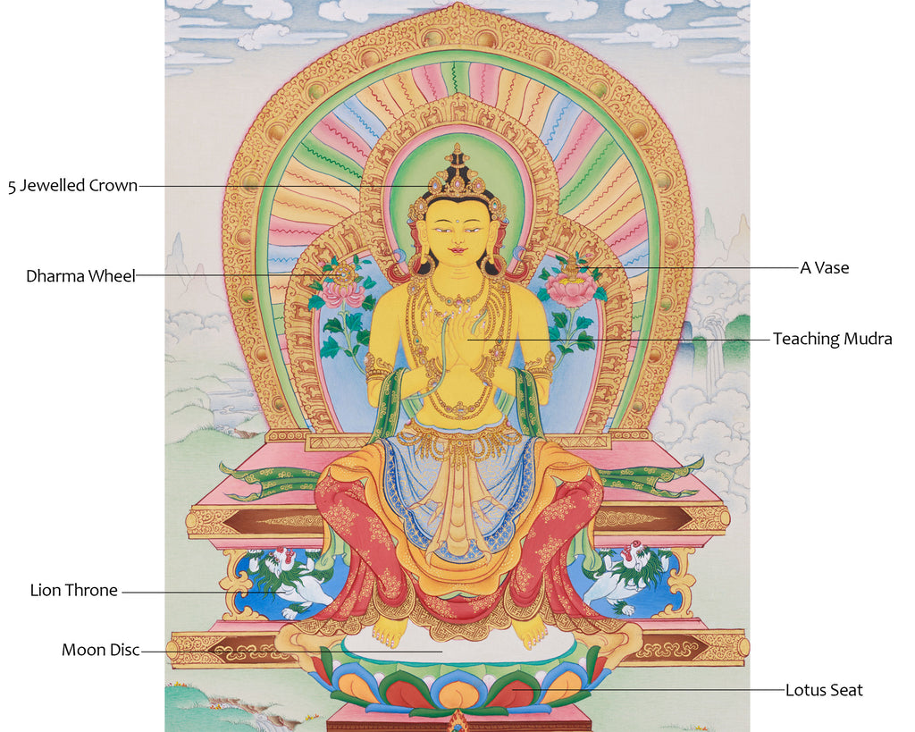 Maitreya, the future Buddha, is shown seated on a throne, symbolizing purity and enlightenment. His hands form the Dharmachakra Mudra, a gesture symbolizing the Wheel of Dharma, while grasping a blossoming lotus stem. The Dharma Wheel on the right lotus represents his upcoming role as a teacher who will rejuvenate the Dharma. The left lotus holds a vase, representing long life, spiritual abundance, and the realization of hopes. Maitreya wears a five-jeweled crown, ornate earrings, necklaces, and flowing silk robes. A multi-layered halo and rainbow-colored aureole surround him, set within an intricately patterned throne. The throne's base is guarded by mythical snow lions, symbolizing fearless protection and the power of enlightenment.