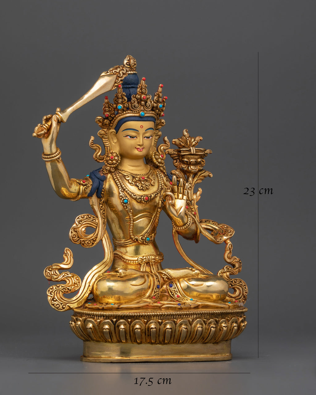 Tibetan Buddhism Manjushri is expertly fashioned from 24K gold gilded materials. Standing 9.1 inches tall, this intriguing sculpture represents the expertise of experienced artisans from Patan, a historic city noted for its superb metal craftsmanship. The statue's copper body is wonderfully embellished with gold and acrylic paintings, highlighting delicate details that add to its spiritual presence.