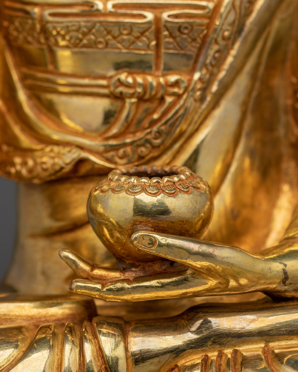 Shakyamuni Buddha is depicted sitting in the lotus pose (padmasana), indicating his steady concentration and mastery over the distractions of the material world. His right hand stretched toward the earth in the bhumisparsha mudra, representing his moment of enlightenment, as he invited the earth to witness his awakening. The left hand, lying gently in his lap in dhyana mudra holding an alms bowl, depicts the profound state of meditation and mindfulness that leads to insight and clarity.
