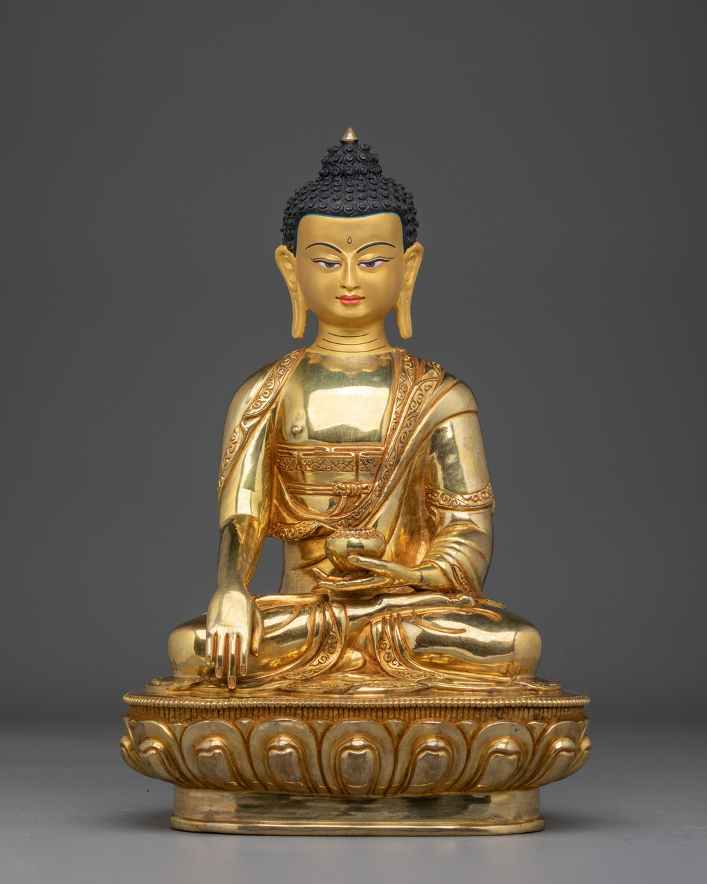 The Tibetan Buddhist Artwork of Shakyamuni Buddha stands 12.8” (32.5 cm) tall, with an 8.9” (22.5 cm) base, and weighs 3.46 kg. Made from copper, 24K gold gilding, and gold and acrylic paintings. Ideal for altars, meditation spaces, or as a spiritual gift, this statue radiates peaceful energy and serves as a profound reminder of the path to awakening.