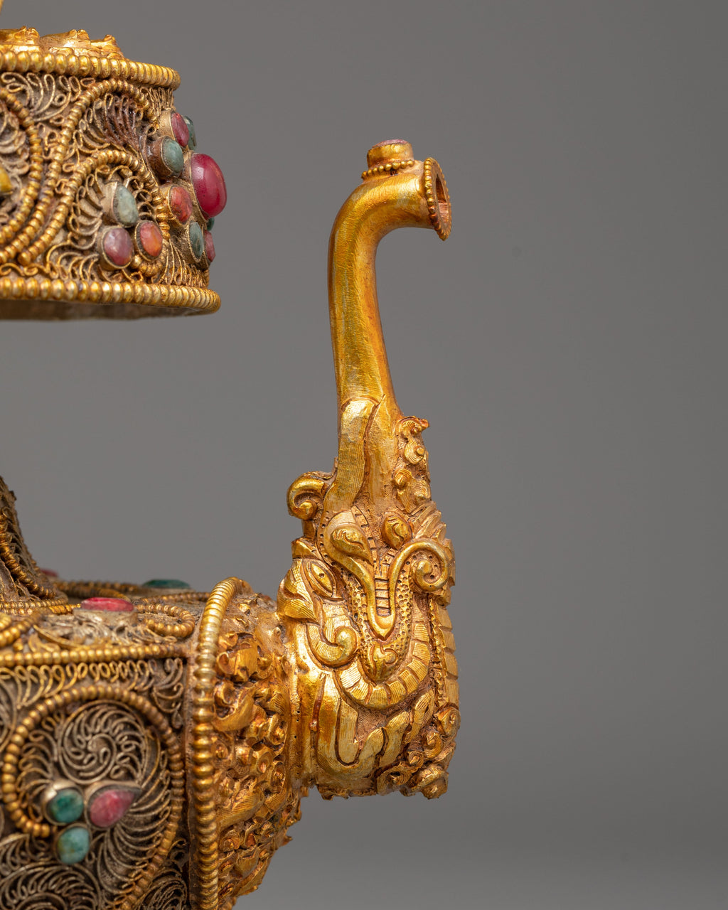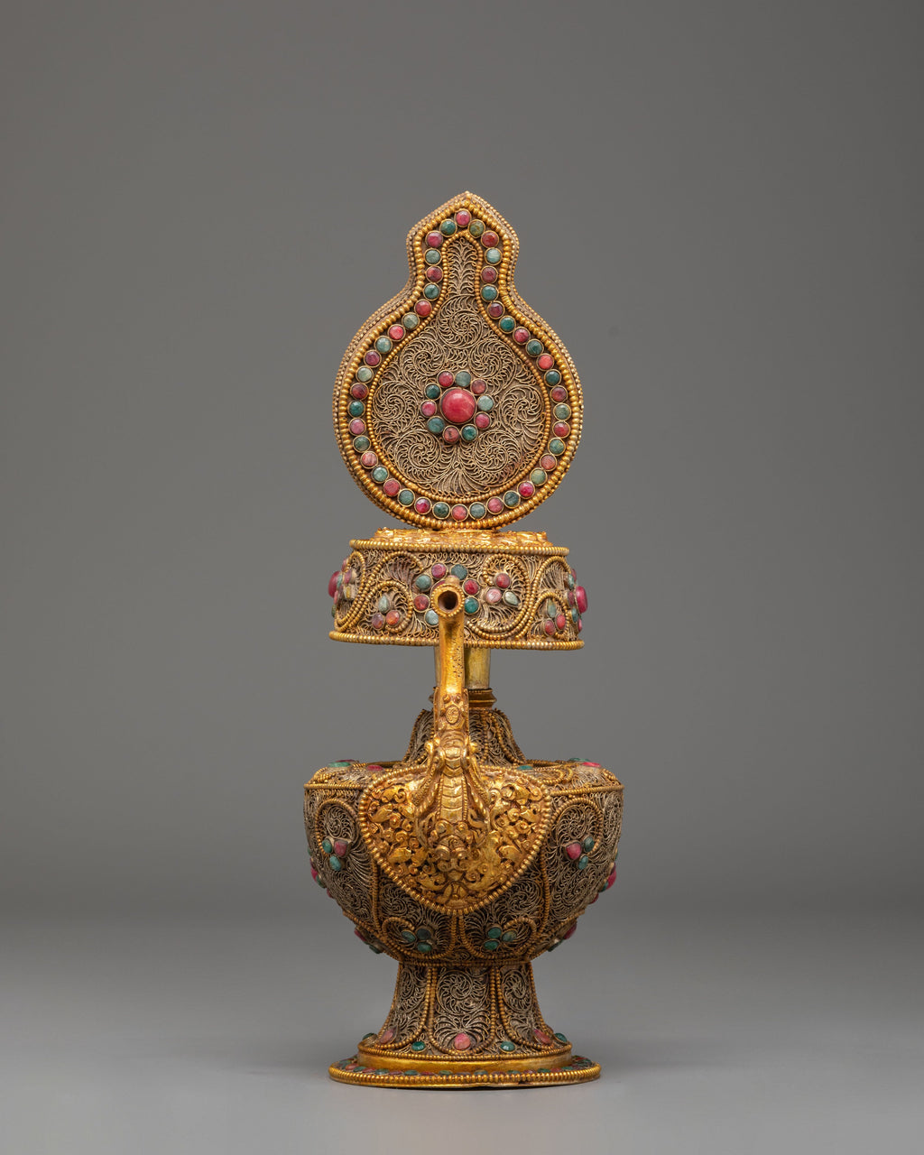 The Bhumba's design features intricate copper craftsmanship, with gold-plated accents that highlight the vessel’s importance in spiritual rituals. The decorative motifs include lotus flowers and flame-like designs that symbolize enlightenment, purification, and the continuity of life. The coral and turquoise stones are placed strategically, with coral symbolizing strength and turquoise representing wisdom and protection. These vibrant stones enhance the Bhumba's spiritual potency, making it a significant object in any Buddhist altar or meditation space.