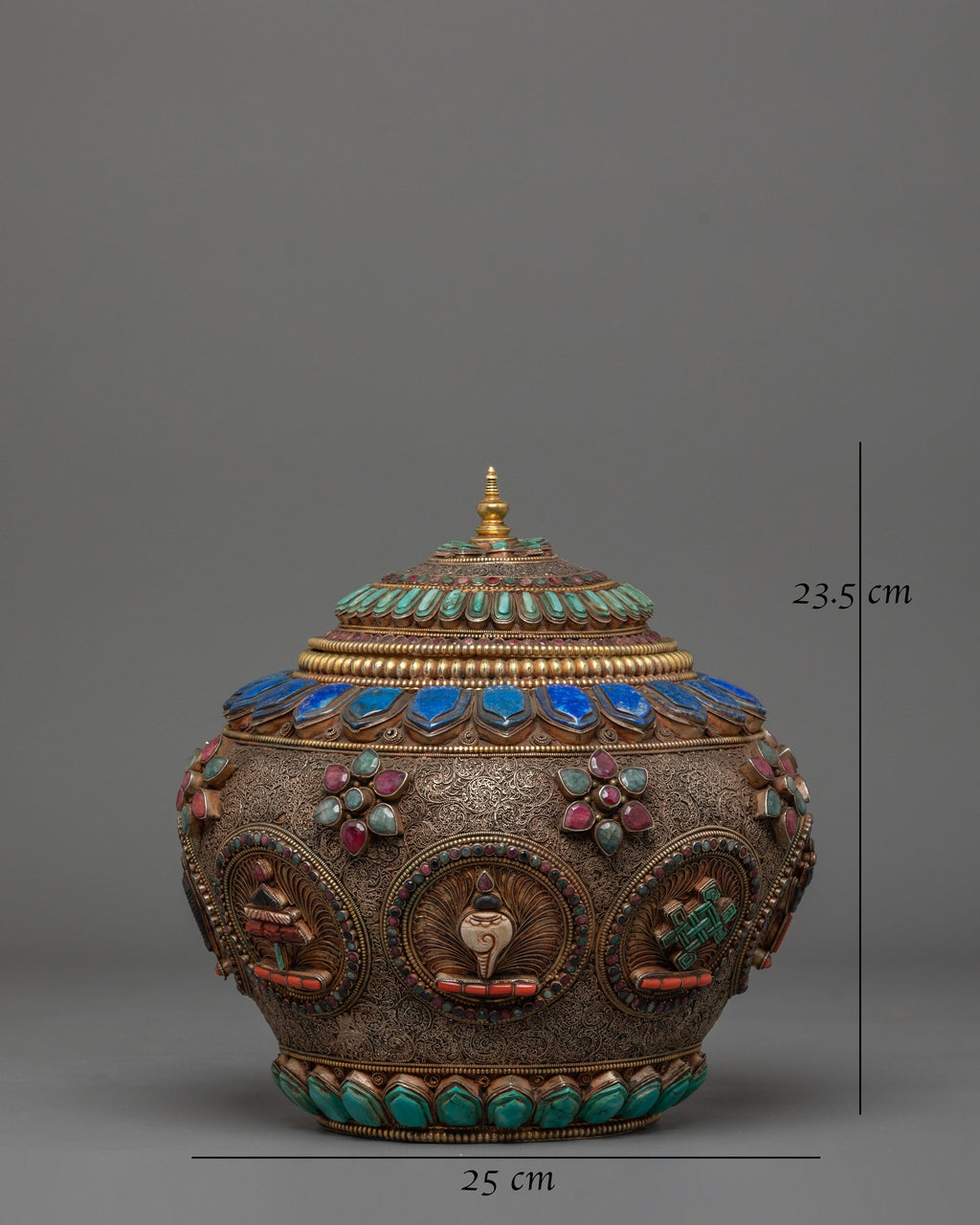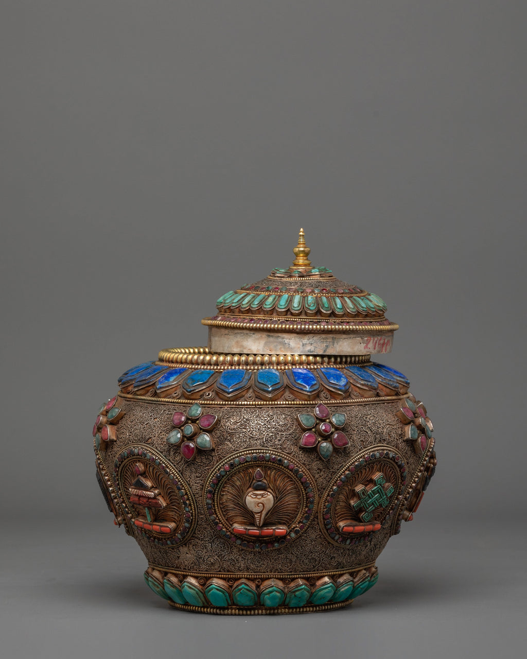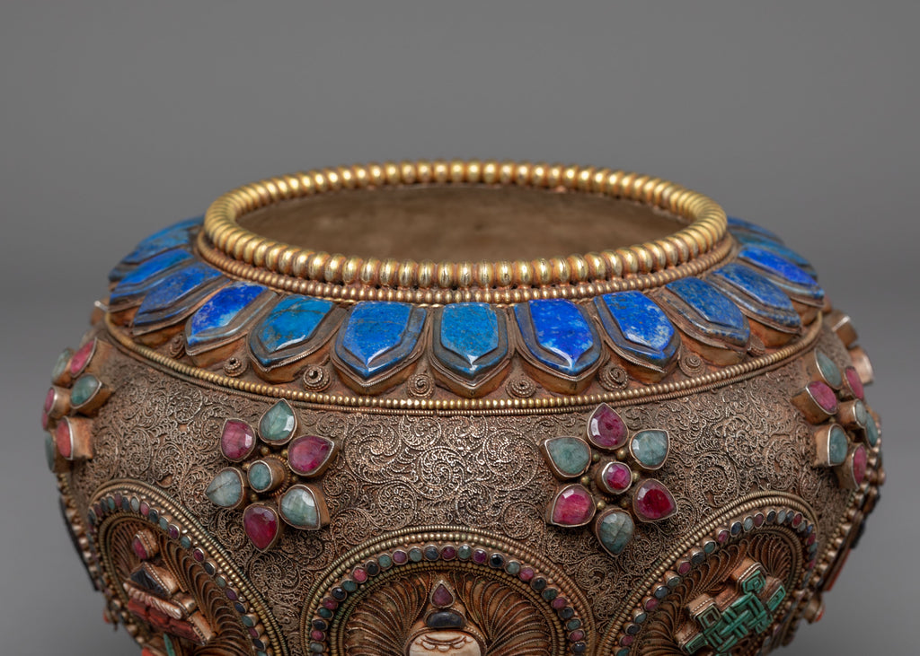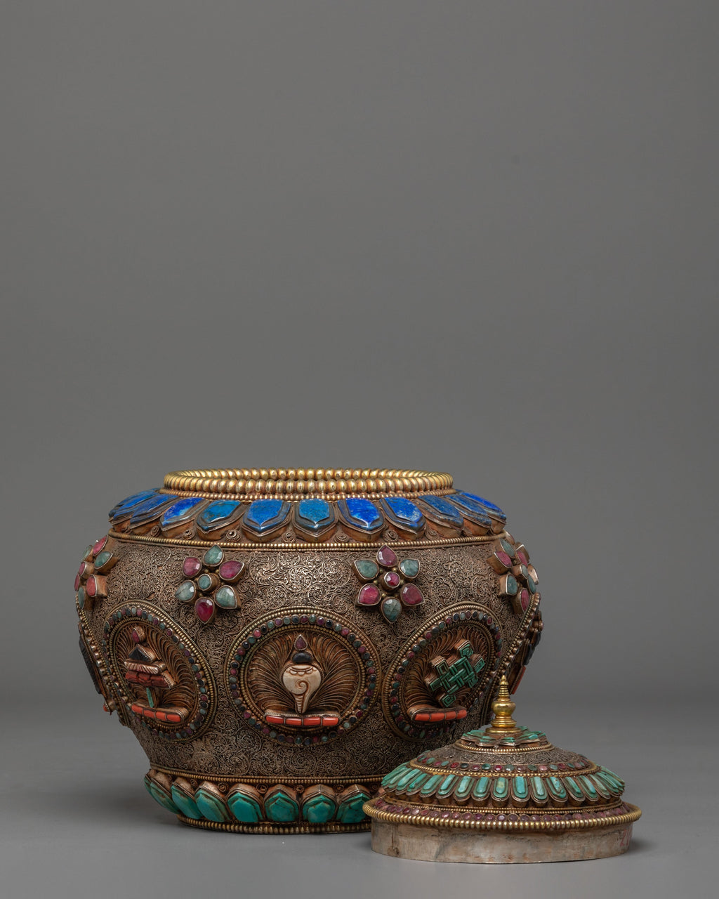Sacred Tibetan Buddhist Dhupur Rice Pot | Gemstone Inlaid Buddhist Altar Decor