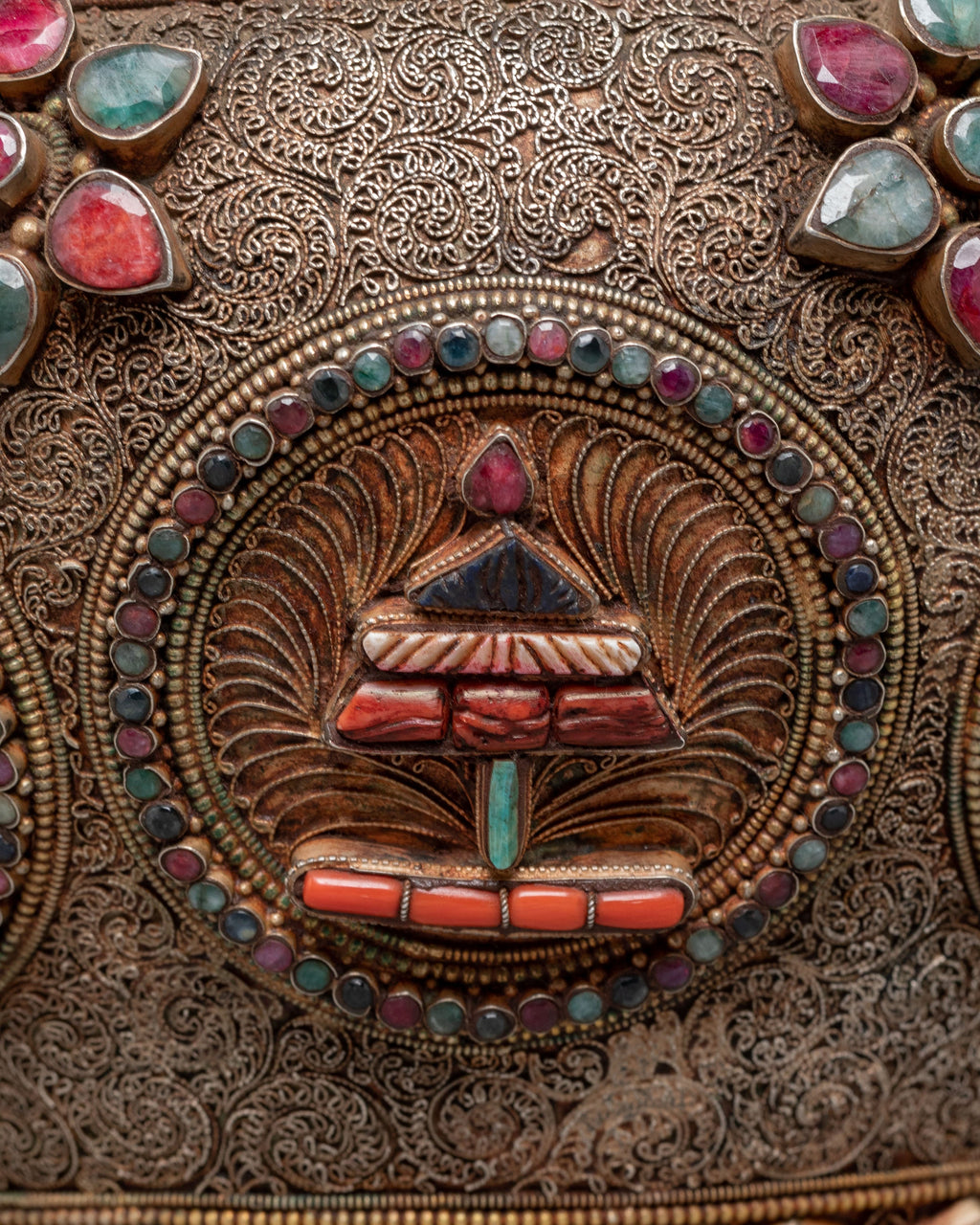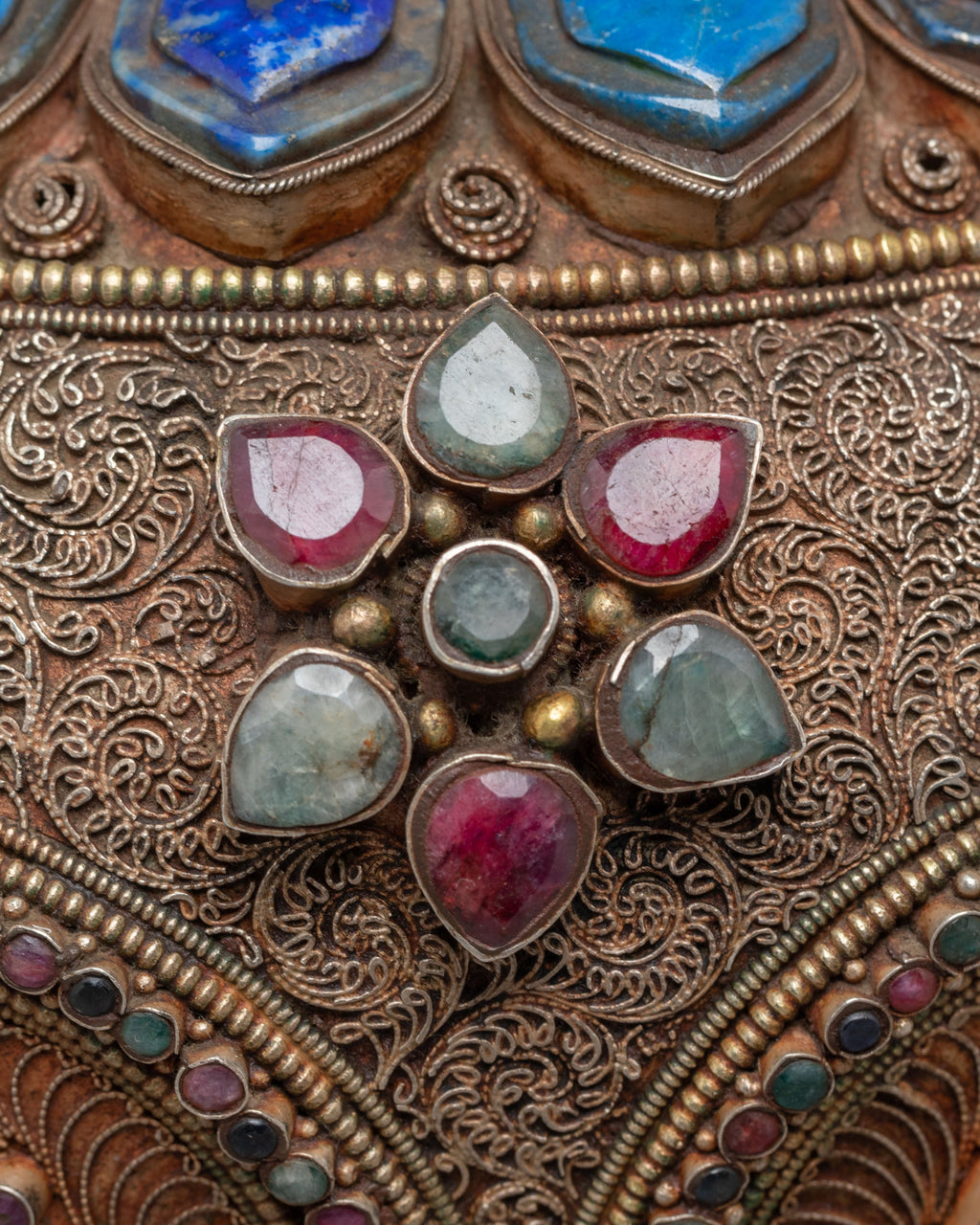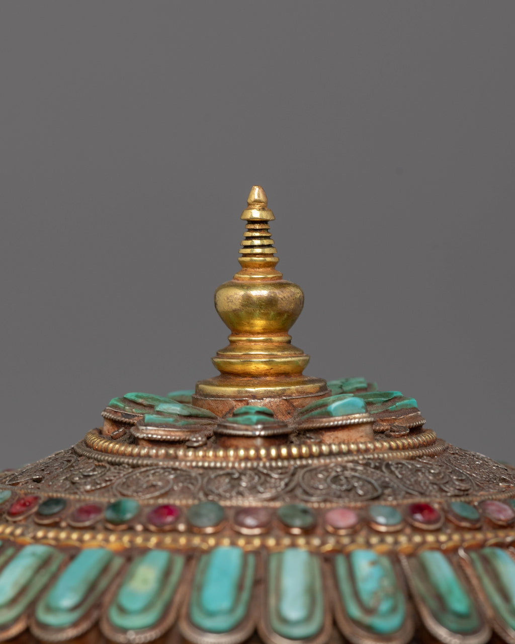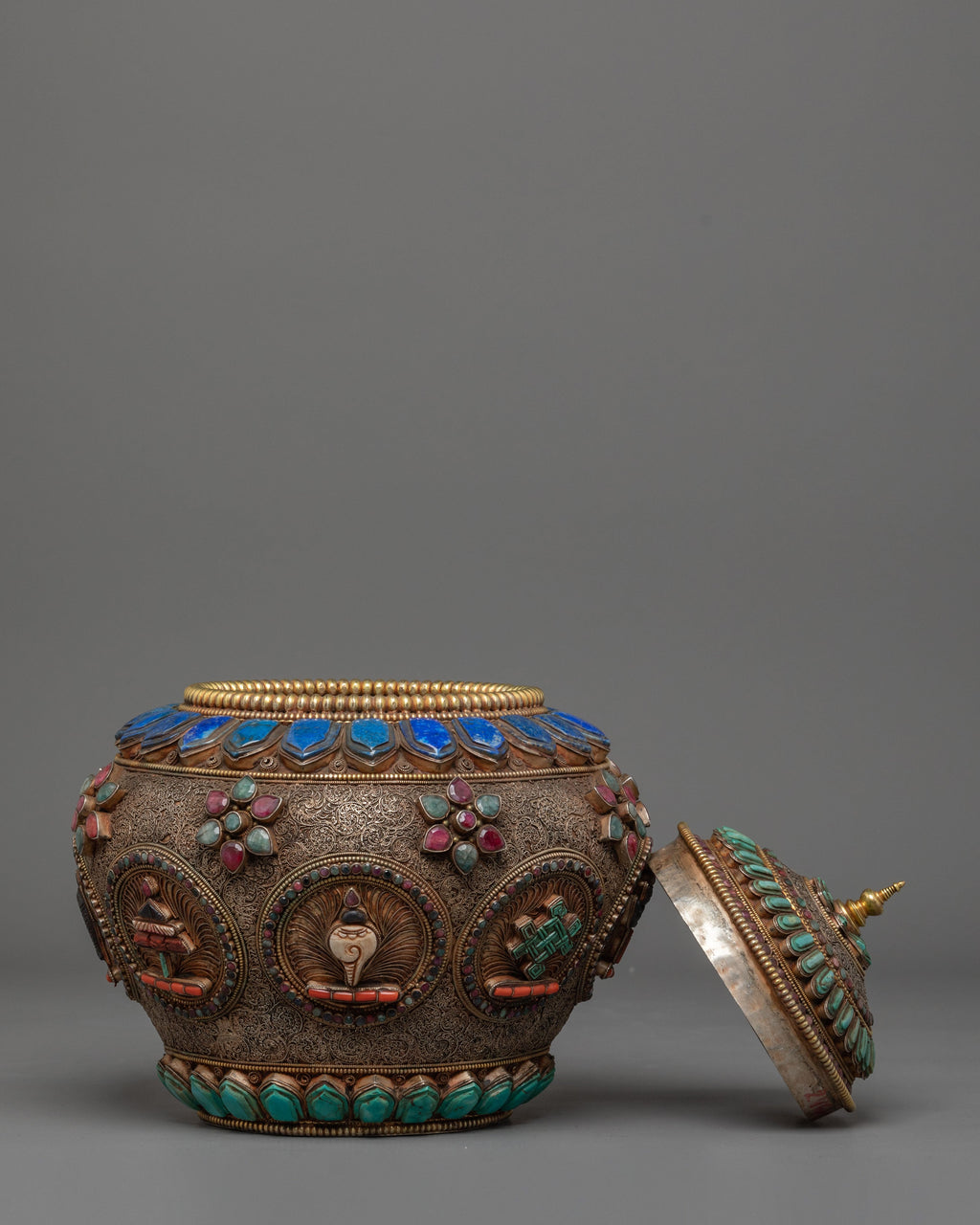 Sacred Tibetan Buddhist Dhupur Rice Pot | Gemstone Inlaid Buddhist Altar Decor