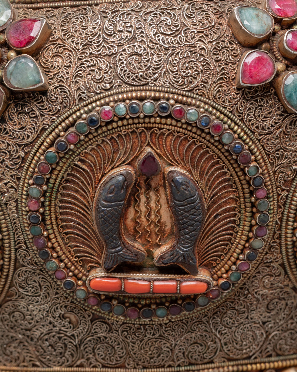 Every detail of this Himalayan ritual pot reflects deep spiritual meaning. The silver body features ornate carvings of auspicious symbols surrounded by intricate scrollwork, while vibrant natural gemstones — coral, turquoise, and lapis lazuli — add divine radiance. Each gemstone holds spiritual significance: turquoise represents healing and protection, coral embodies life force and compassion, and lapis lazuli symbolizes wisdom and inner truth. The delicate filigree work and embedded conch shell elements speak to the traditional Nepalese and Tibetan jewelry-making heritage, turning this ritual piece into a rare collector’s treasure.