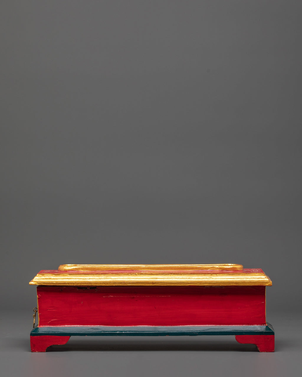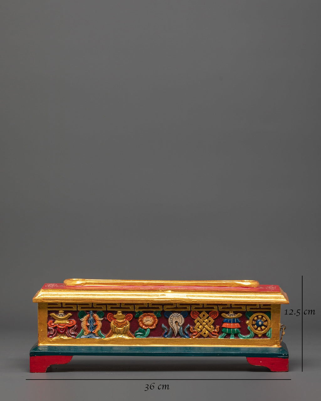 The Tibetan Buddhist Incense Burner measures 12.5cm in height and 36cm in width, weighing 0.98kg. Crafted from wood and finished with vibrant acrylic colors, this incense burner is designed to bring sacred energy and tranquility to meditation spaces, altars, or spiritual corners. Its elongated design allows for multiple incense sticks, providing a calming aroma that enhances mindfulness, focus, and spiritual practice. The intricate detailing reflects traditional Tibetan Buddhist symbolism, making it both a functional and meaningful addition to any sacred space.
