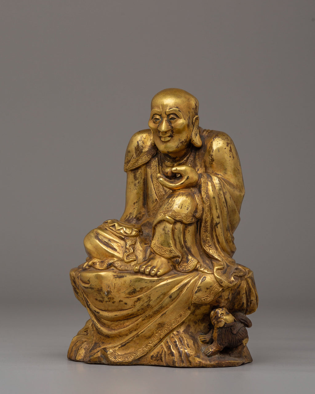 This handcrafted Tibetan Buddhist Kshitigarbha statue symbolizes compassion, protection, and spiritual enlightenment. Standing at 20cm tall, this magnificent brass statue represents Kshitigarbha, also known as the Bodhisattva of the Earth, revered for his unending compassion and commitment to helping all creatures overcome suffering. This statue is ideal for meditation spaces, altars, or as a meaningful gift for spiritual practitioners.