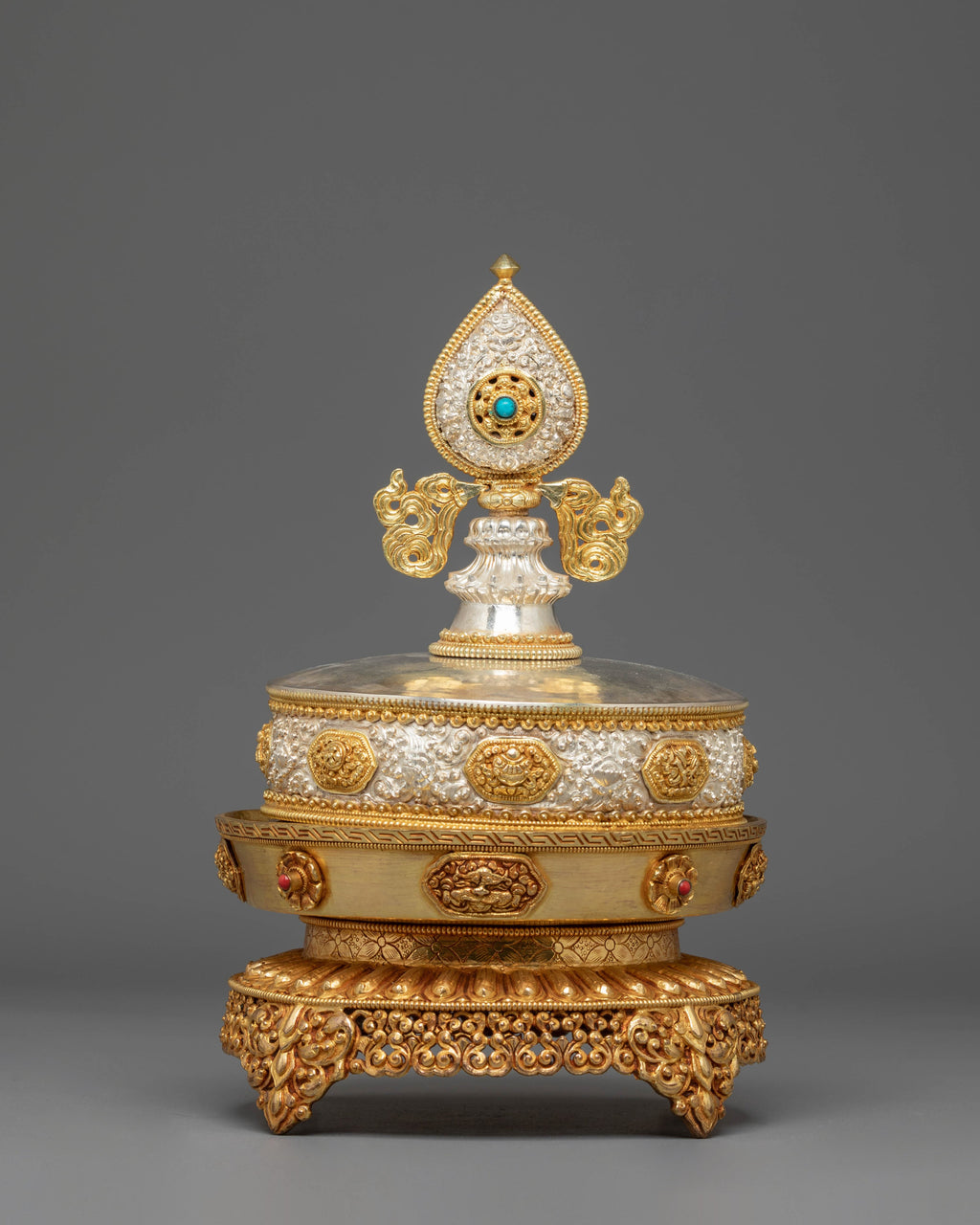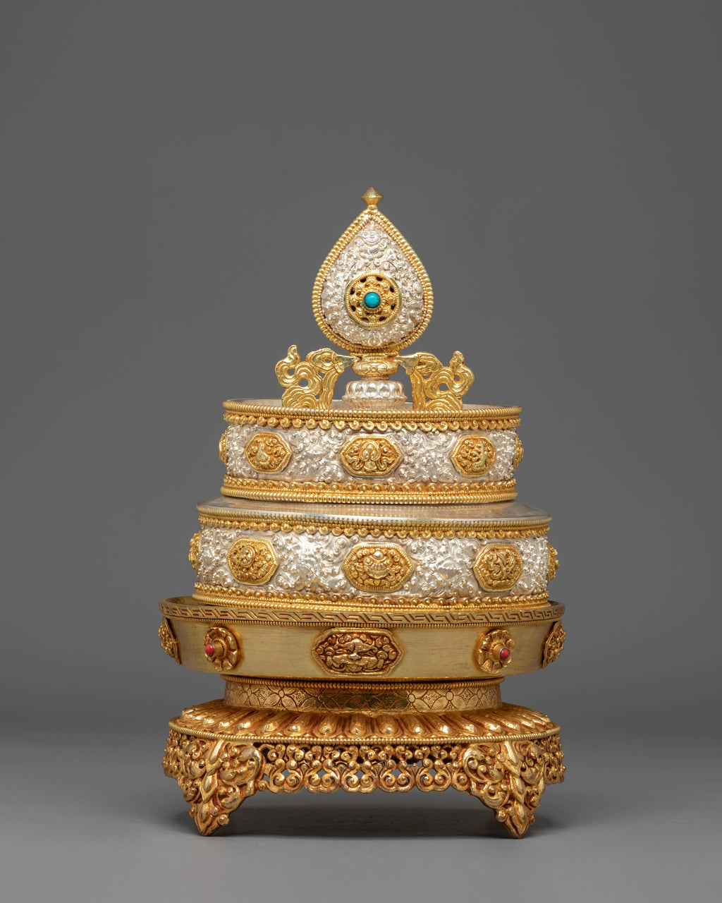 Each tier of the mandala is intricately adorned with fine repoussé details, auspicious motifs, and gold-embellished borders that represent abundance, purity, and the vast offering of the universe. The craftsmanship highlights delicate beading, floral patterns, and traditional Tibetan iconography, while the fire-gold accents bring warmth and depth to the design. The crown ornament atop the mandala—shaped like a sacred jewel—symbolizes enlightened wisdom and the illumination of the spiritual path.