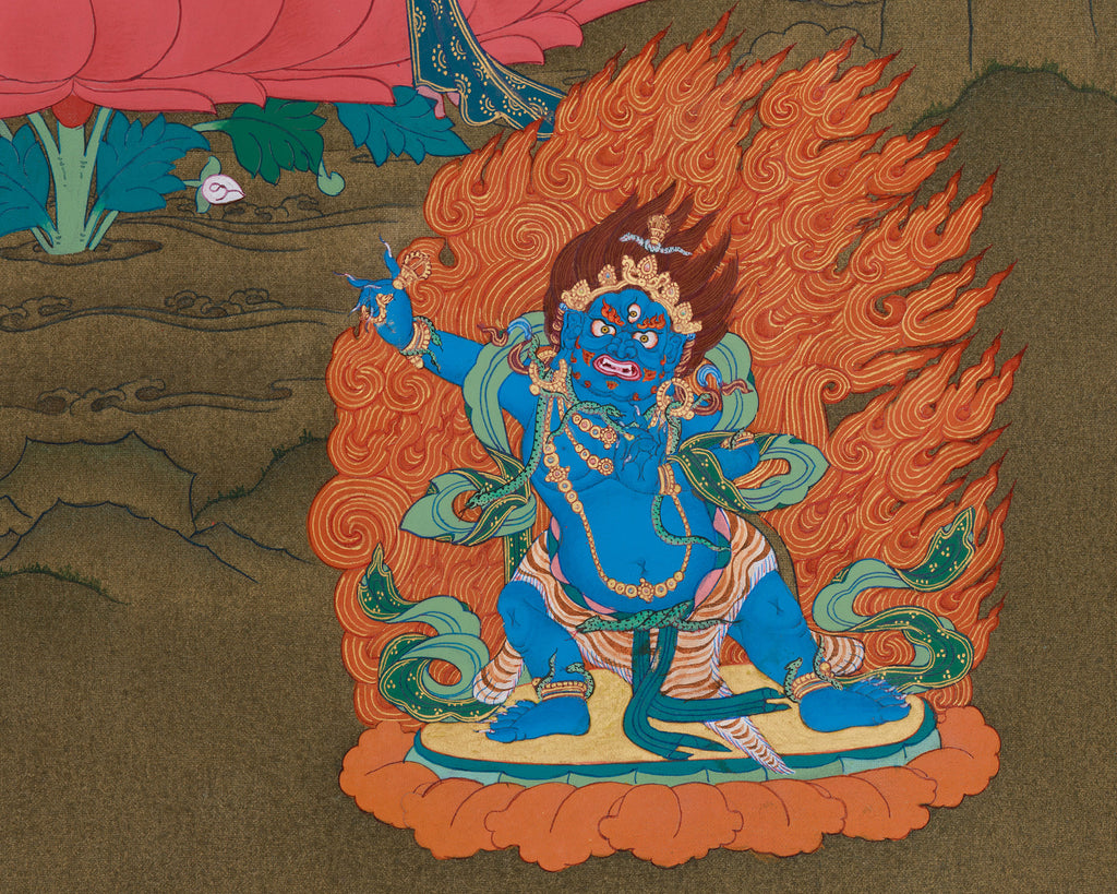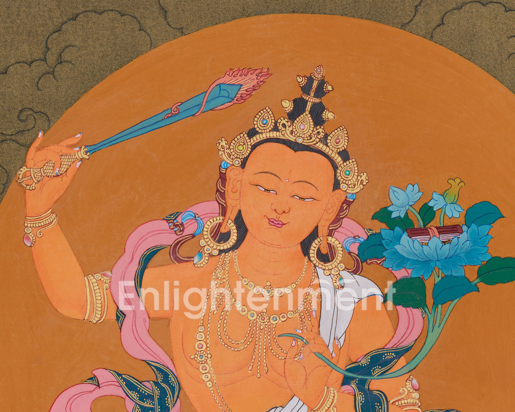 A thangka of Tibetan Buddhist Manjushri with Chenrezig and Vajrapani exemplifies the foundational principles of Mahayana Buddhism: wisdom, compassion, and power. It elegantly portrays these distinguished figures, encouraging practitioners to embody these virtues consistently in their daily lives and spiritual endeavors. The artwork serves as a medium for consciousness, effectively depicting the unity of divine attributes.