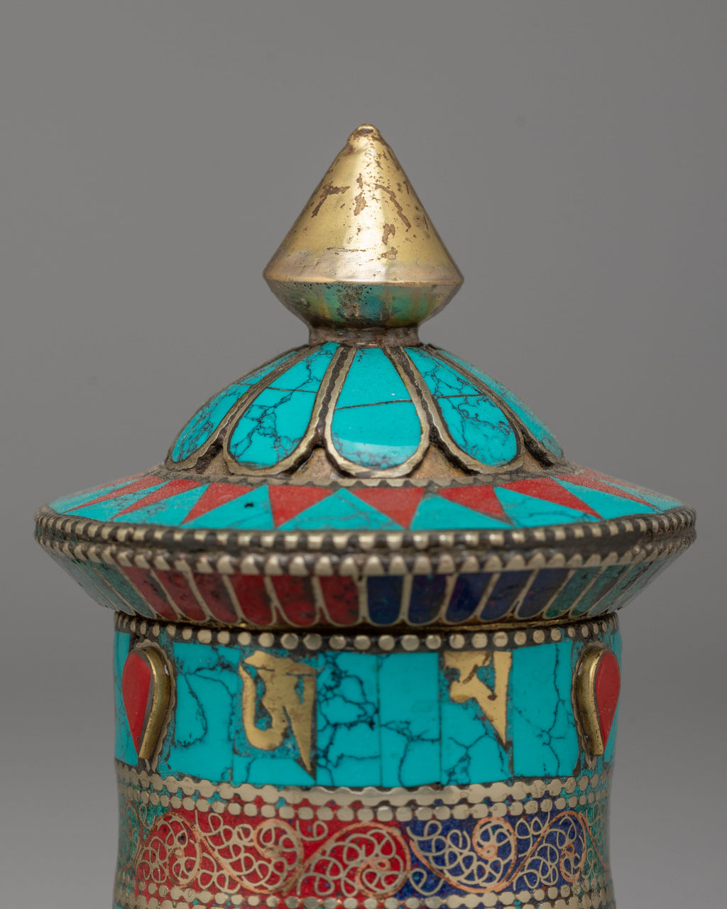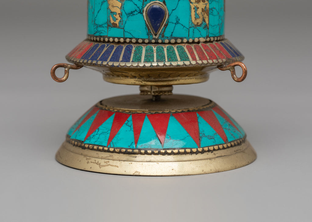 The wheel is decorated with traditional Tibetan Buddhist mantras, commonly associated with compassion and spiritual purification. In Tibetan Buddhism, turning the prayer wheel while focusing on intention or reciting prayers is believed to multiply the blessings of the mantra contained within. The circular motion symbolizes the continuous flow of wisdom and the cycle of life. The engraved details and symbolic motifs reflect long-standing Tibetan artistic traditions seen in monasteries and ritual objects.