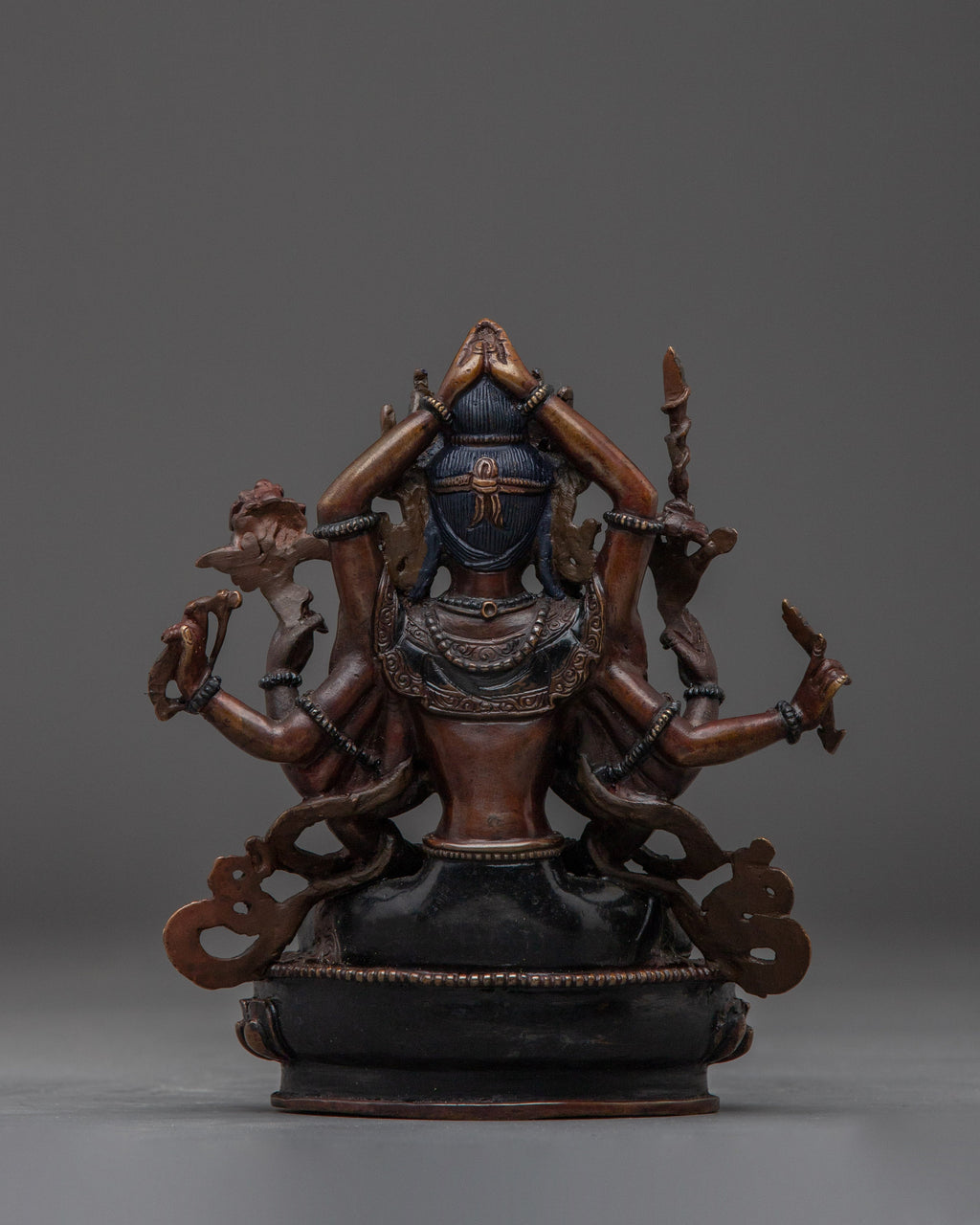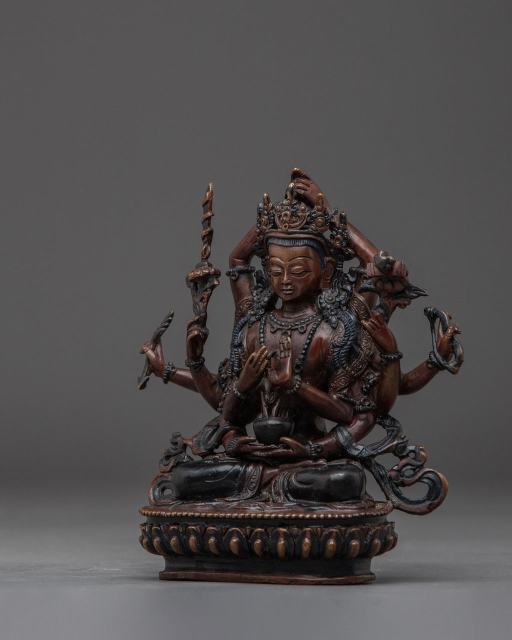 Tibetan Buddhist Sculpture of Namasangati stands 6.5” (16.5cm) tall with a 6.1” (15.5cm) base and weighs 0.98 kg. Crafted from oxidized copper, this handcrafted piece embodies traditional Tibetan spiritual artistry, perfect for ritual offerings, meditation spaces, or sacred home altars.