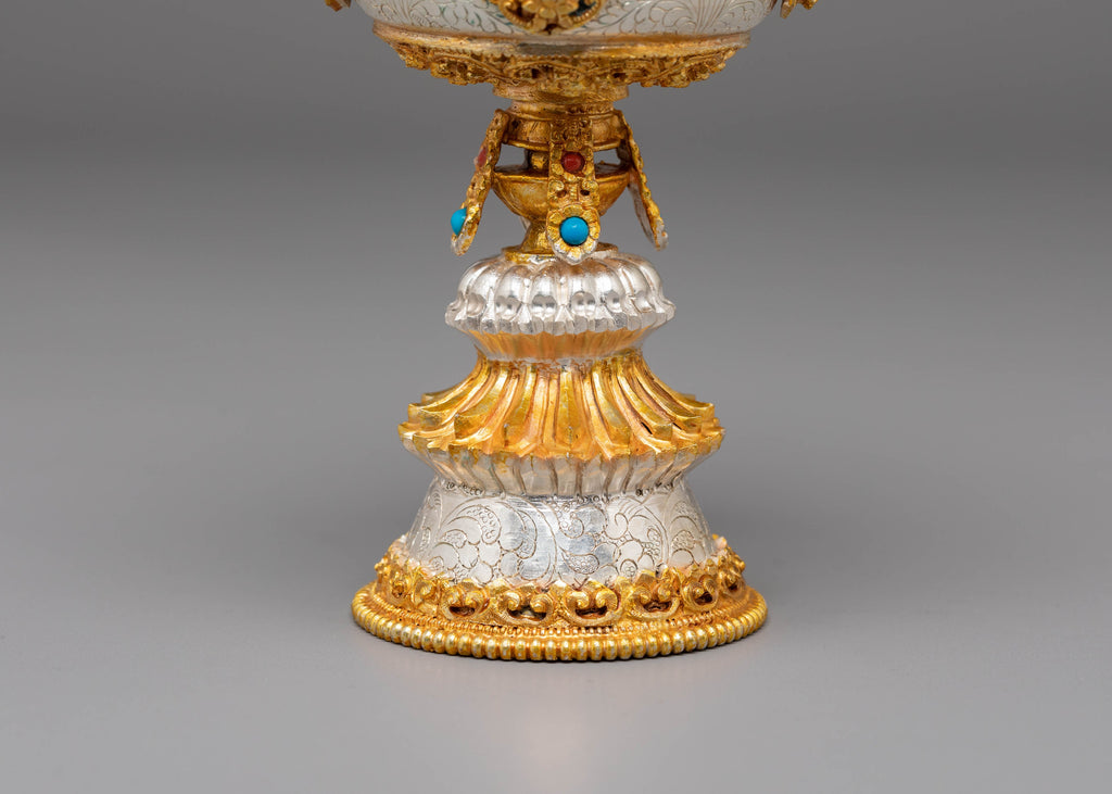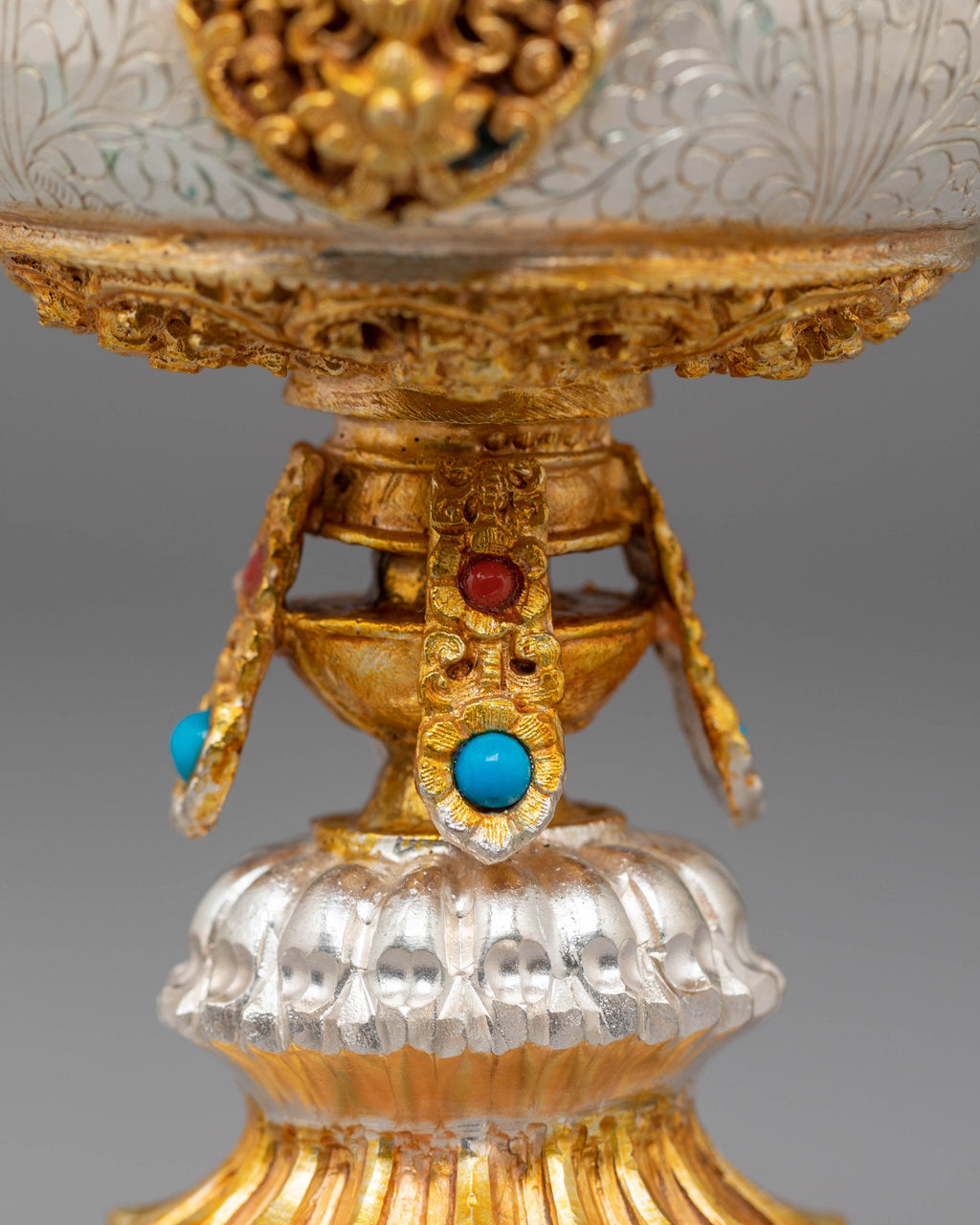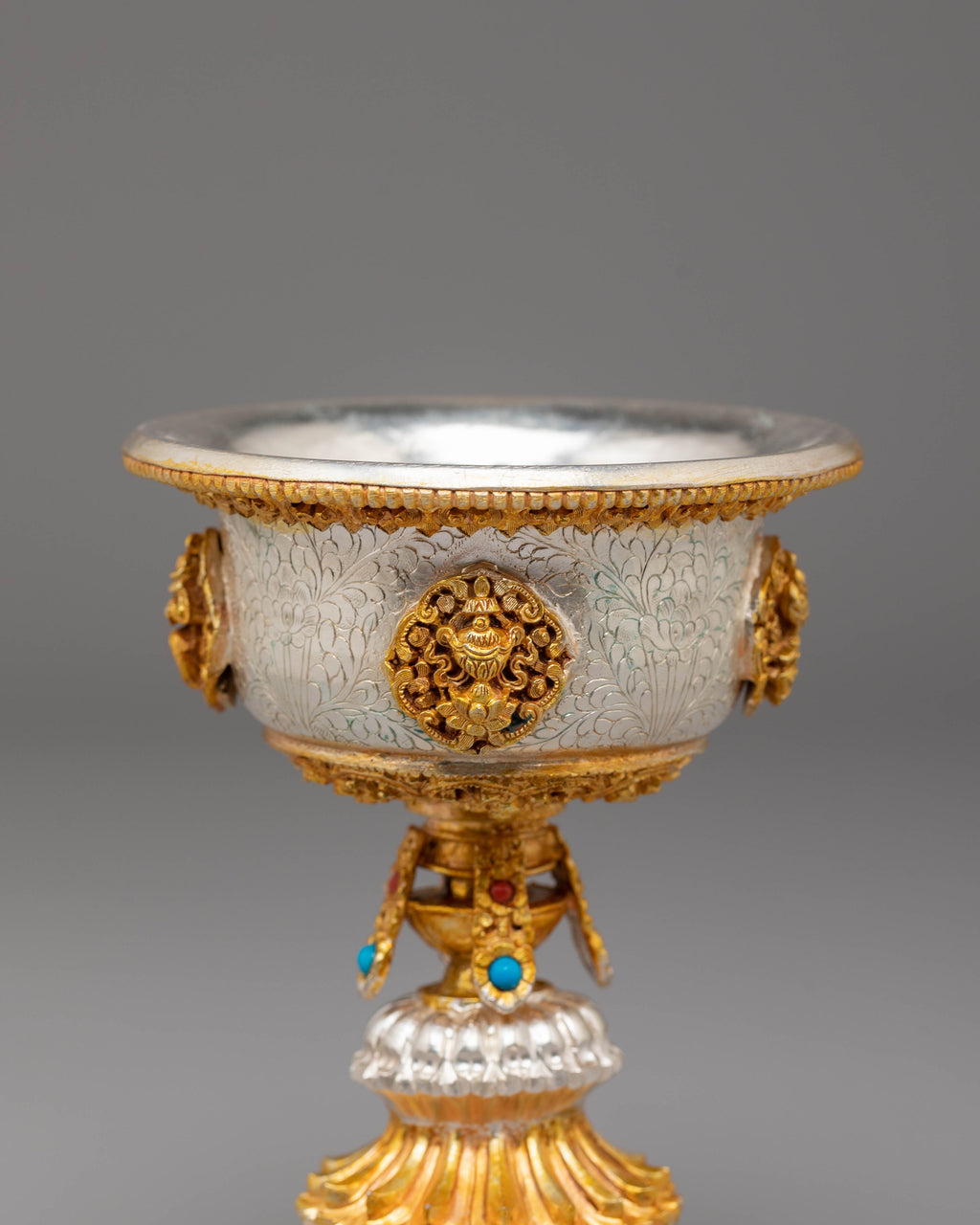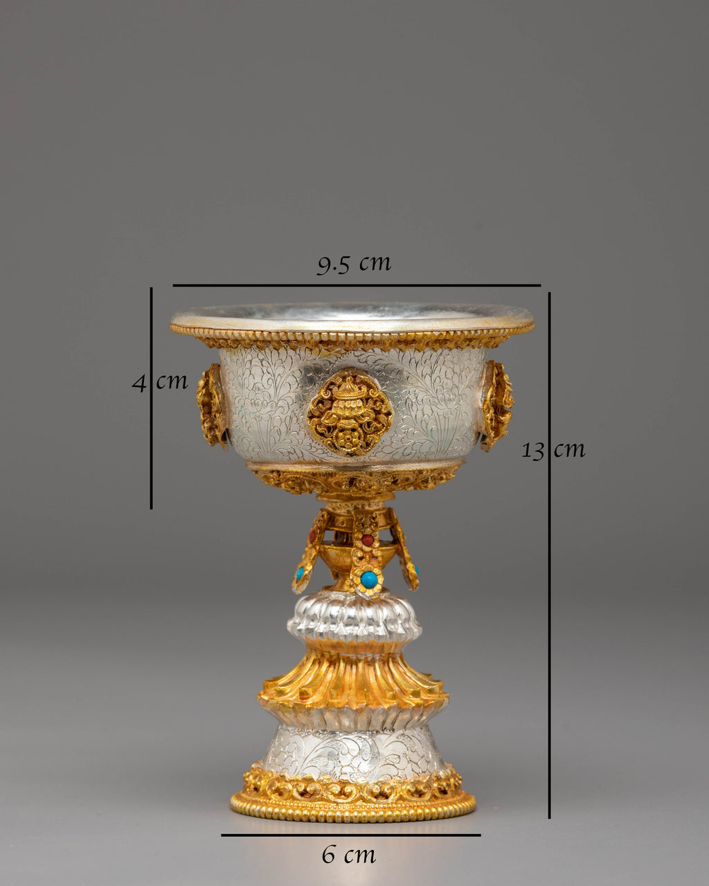 Illuminate your spiritual practice with this Tibetan Butter Lamp for Light Offering, meticulously crafted from copper with gold and silver electroplating. Designed to enhance the sacred ambiance of meditation rooms, home altars, and temples, the lamp radiates a gentle, calming light that symbolizes the dispelling of darkness and ignorance. Its polished surface reflects the glow beautifully, creating an atmosphere of serenity and devotion.