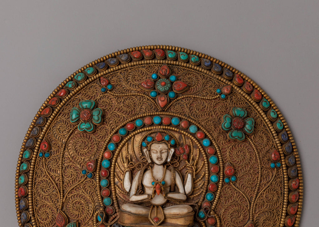 The Chenresig is a symbol of compassion, attracts beneficial energy and healing to your surroundings. Crafted with care, it represents the discipline of selflessness and the value of awareness. This copper sculpture combines the elegance of traditional Tibetan Buddhist art with a modern twist, making it an excellent choice for those seeking spiritual decor with purpose. This Chenresig wall hanging is an ideal focal point for your altar, meditation room, or any other location that promotes peace and serenity.