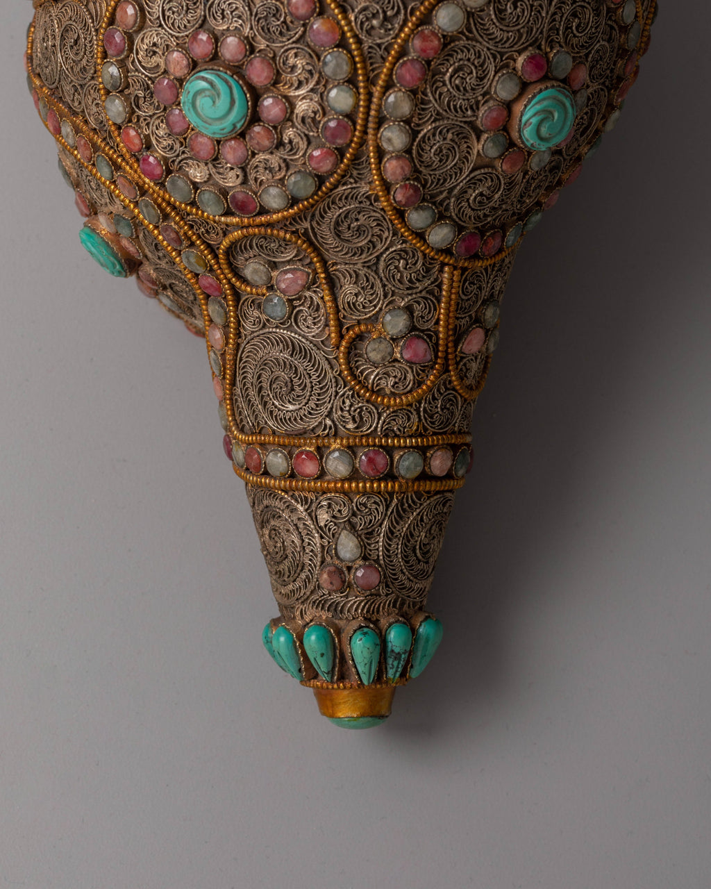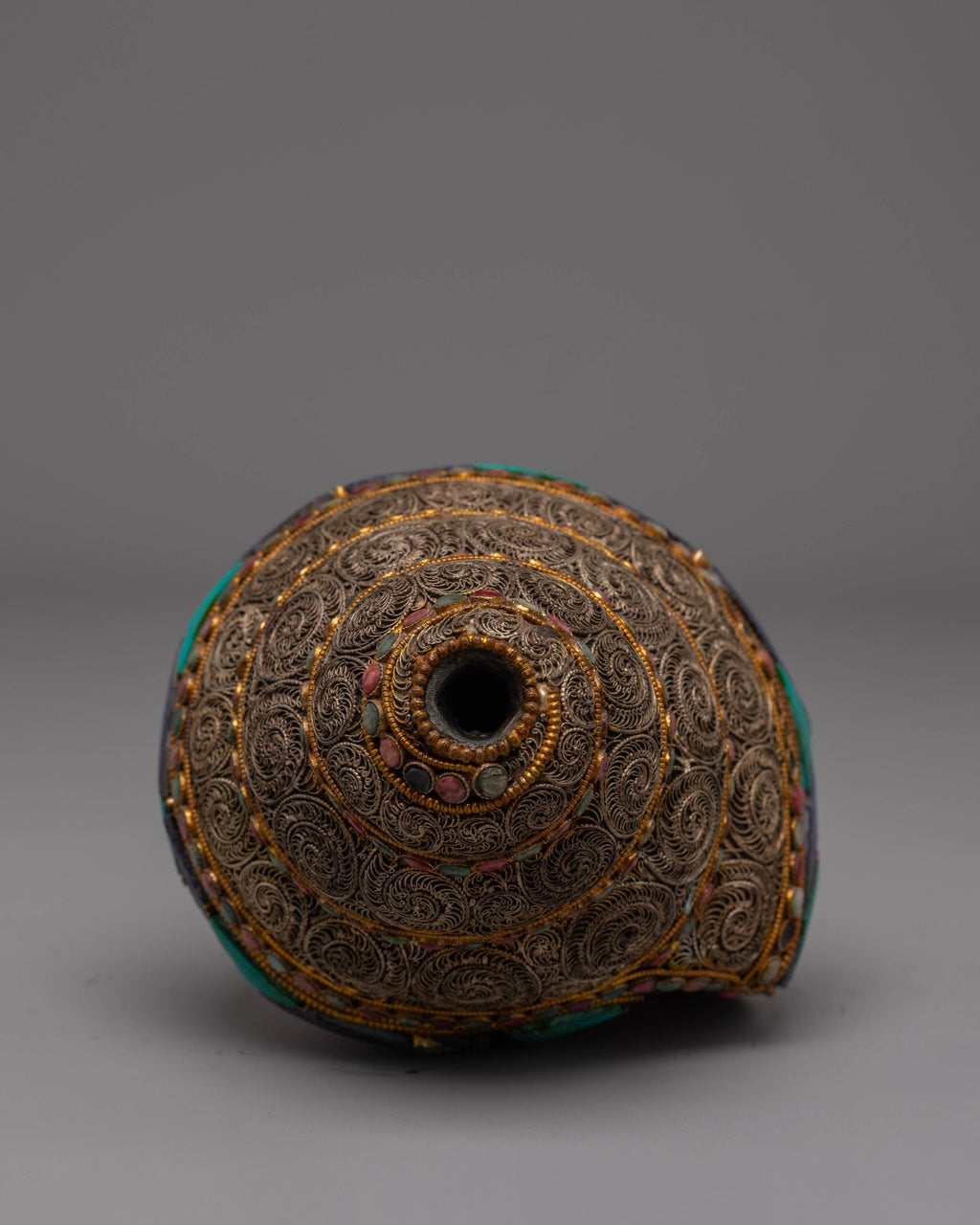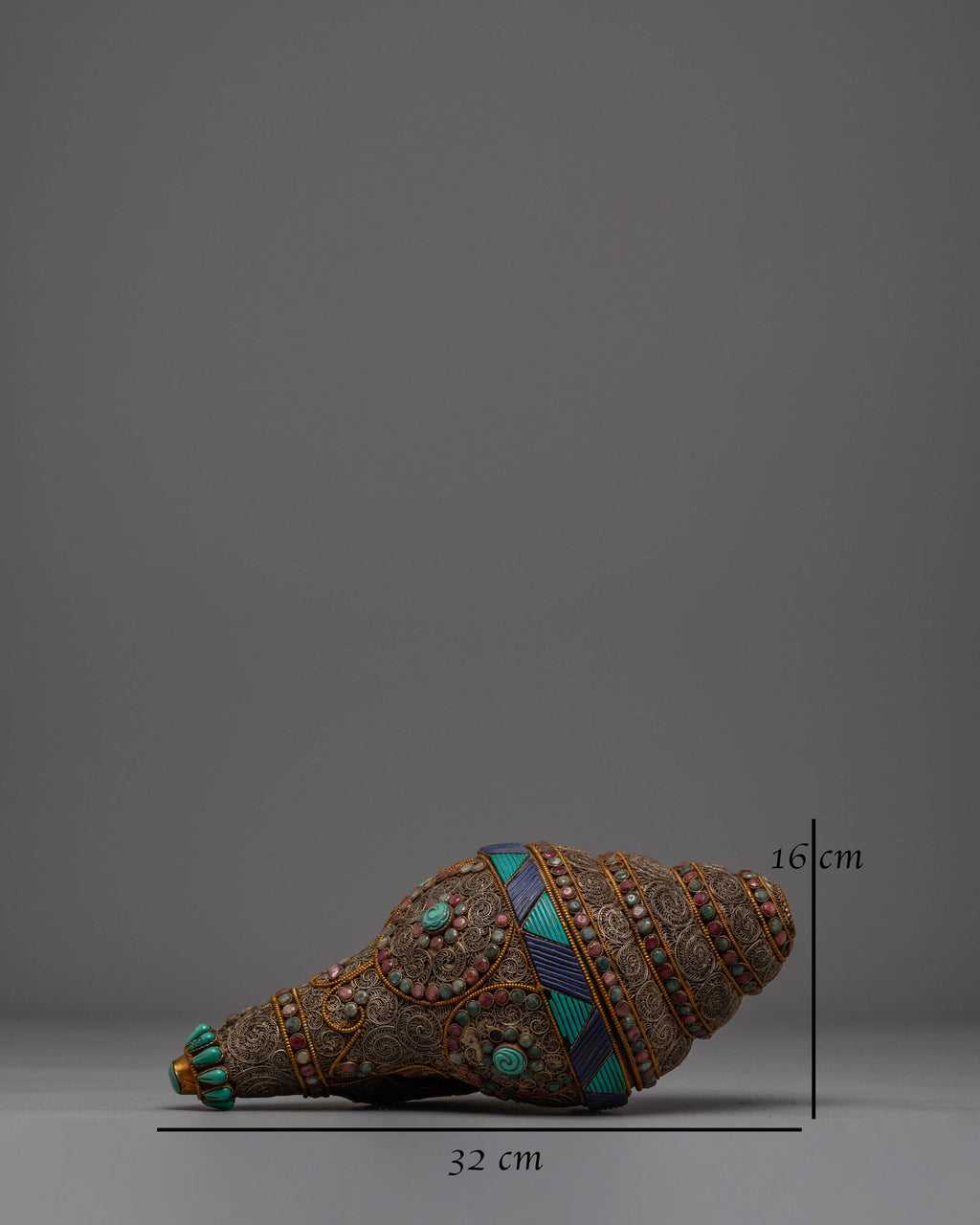 Crafted by expert artisans, this ancient conch shell has profound spiritual significance and is used to enhance Buddhist ceremonies, puja rituals, and sound healing. By producing clean vibrations, the Shankha is respected for its capacity to attract divine blessings and eliminate negative energy. This exquisitely carved Tibetan ritual conch is an enduring emblem of calm and heavenly protection, whether used for meditation, spiritual purification, or as a beautiful décor piece.