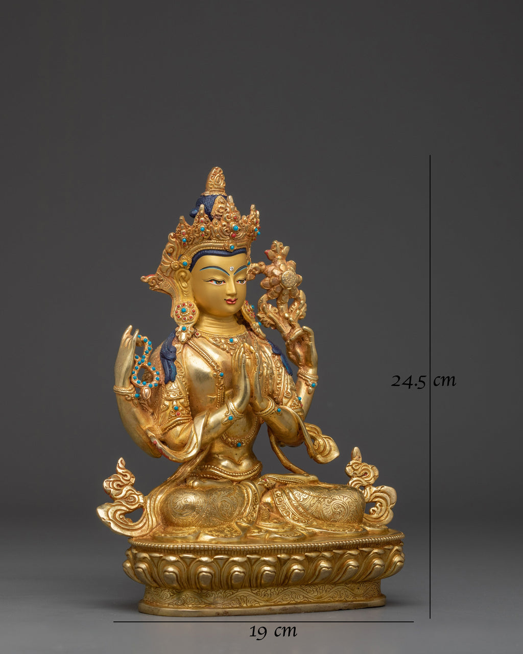 This stunning 24K gold-gilded copper Chenrezig with gemstone inlay symbolizes the heavenly spirit of compassion. The statue, expertly created in Nepal, has a copper body adorned with incredible gold leaf and colorful acrylic decorations. This 9.6-inch sculpture, adorned with beautiful gemstone inlays, exudes spiritual energy and exceptional craftsmanship, making it a treasured addition to any divine space.