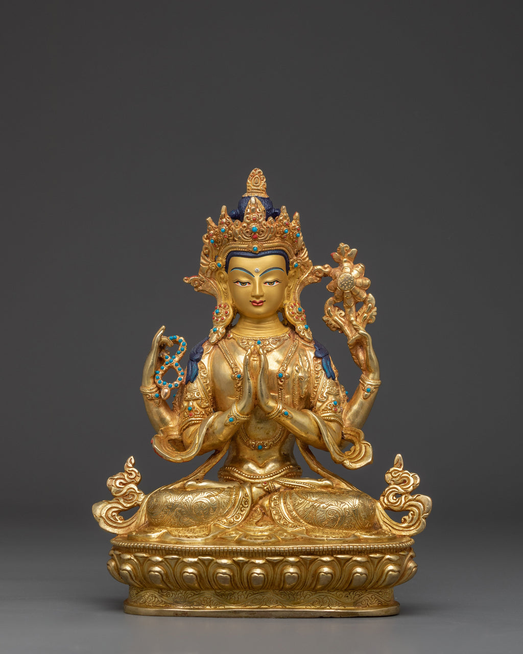 Chenrezig, also known as Avalokiteshvara, is a bodhisattva who hears sentient beings' pleas and responds with infinite compassion. His four arms represent the four immeasurables: compassion, compassion, joy, and serenity. His hands are joined at the heart in a prayer motion, while his upper arms hold a lotus and a mala, which represent cleanliness and spiritual dedication.