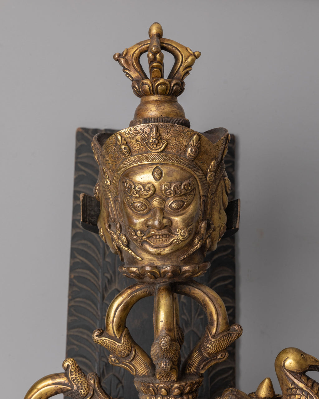 The Tibetan Copper Phurba is an exquisitely crafted ritual tool, designed to symbolize spiritual transformation and the removal of obstacles. Made from copper and gold-plated, this handmade phurba measures 30cm in height and 70cm in width, with a substantial weight of 8.76kg, making it both a powerful and commanding piece for any spiritual practice. Traditionally used in Tibetan Buddhist rituals, the phurba is believed to hold the energy needed to cut through ignorance and transform negative energy into spiritual growth.