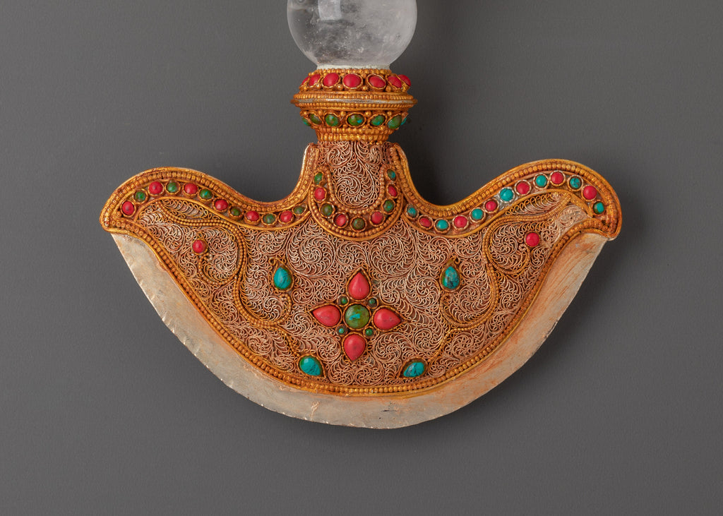 This Tibetan Crystal Kartika Knife is a potent Buddhist ritual blade that represents the removal of ego, ignorance, and worldly attachments. This sacred knife, measuring 24 cm in height and 18 cm in breadth, has a transparent crystal handle with a vajra-style crown. The blade is precisely crafted from gold-plated copper, adorned with intricate filigree work, and set with brilliant turquoise and coral stones, which represent spiritual energy and compassion. The Kartika, which has traditionally been used in Vajrayana ceremonies by wrathful deities such as Vajrayogini, depicts the capacity of wisdom to dismantle false beliefs.