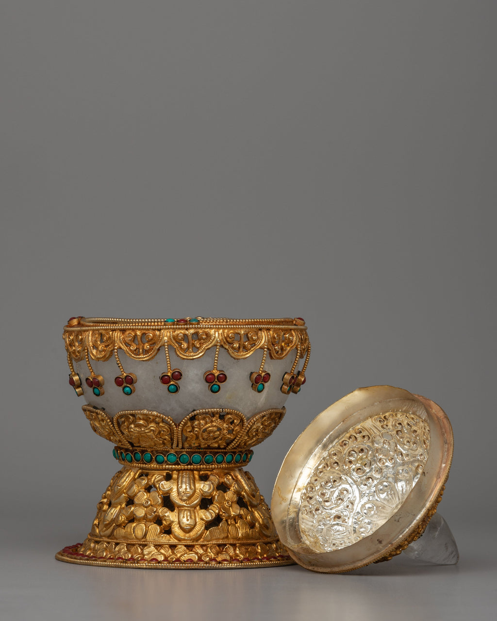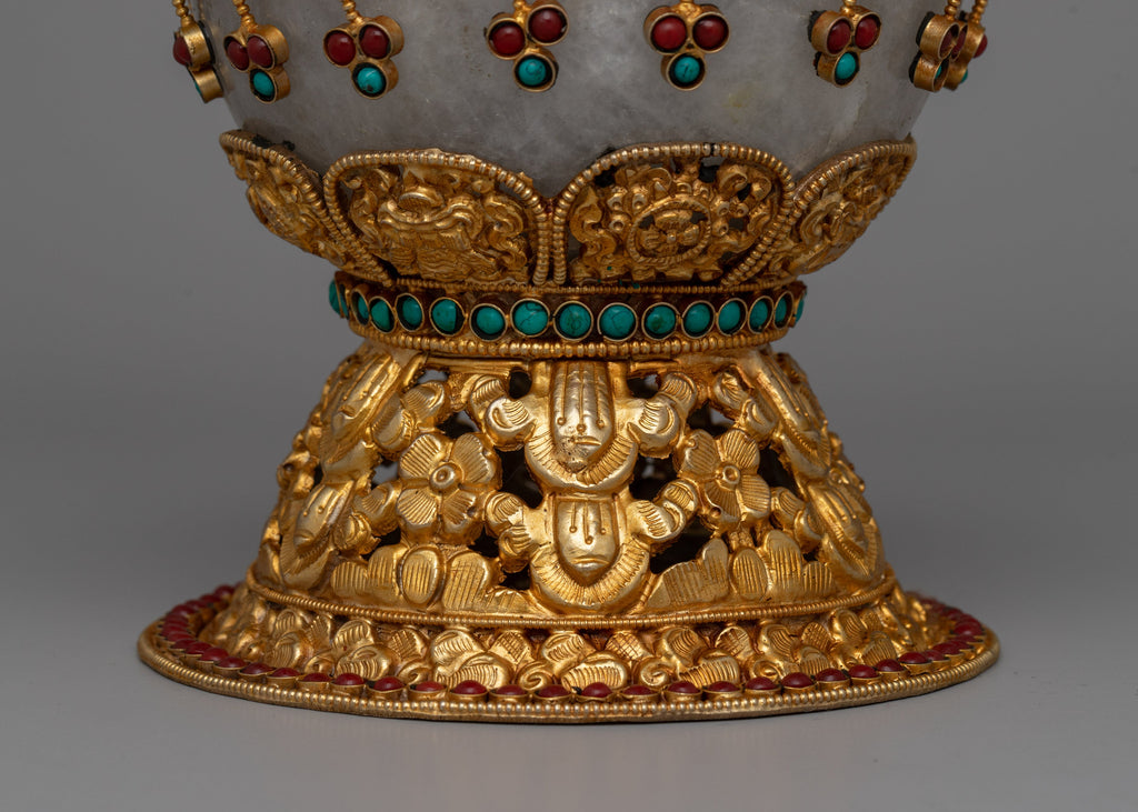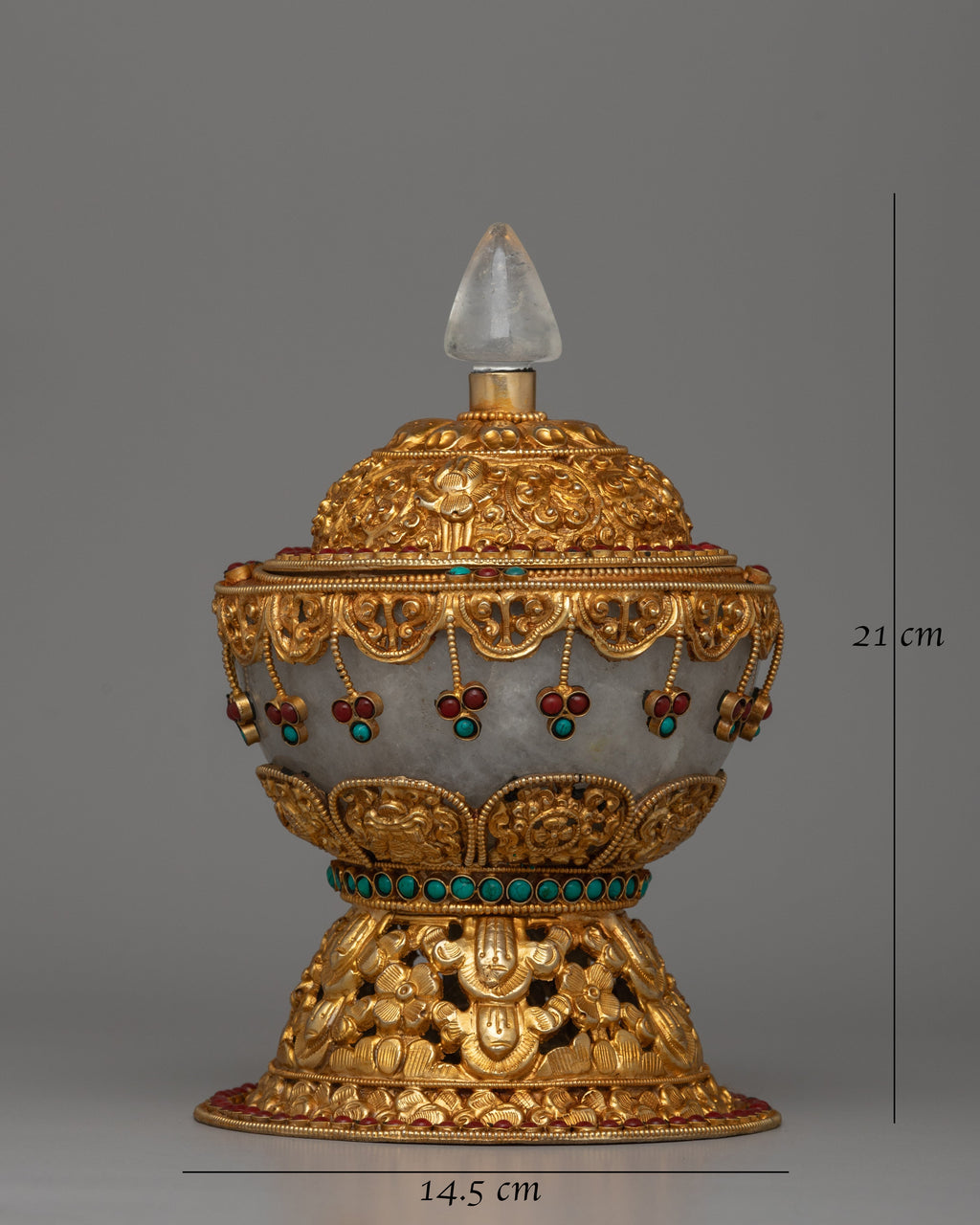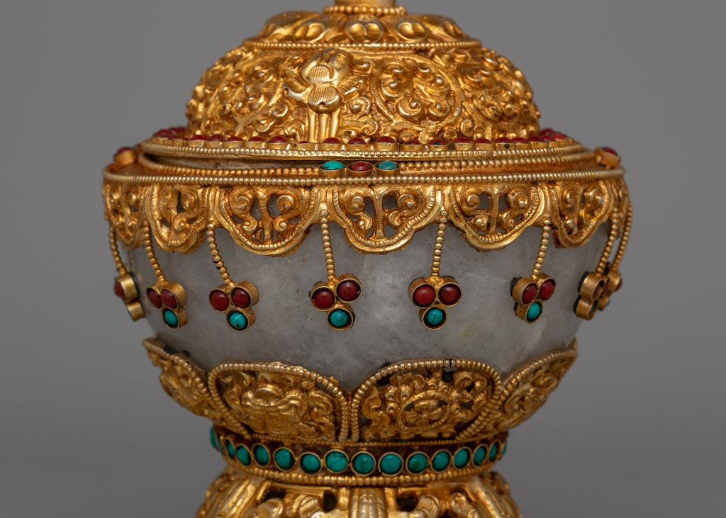 Traditionally used in ceremonial and religious contexts, this rice pot represents prosperity and abundance. The crystal centerpiece exudes purity, while the brilliant turquoise and coral stones offer a pop of color, improving the overall appeal. Whether displayed as a decorative piece, utilized in sacred rites, or given as a treasured heirloom, this pot represents cultural legacy and spiritual value.