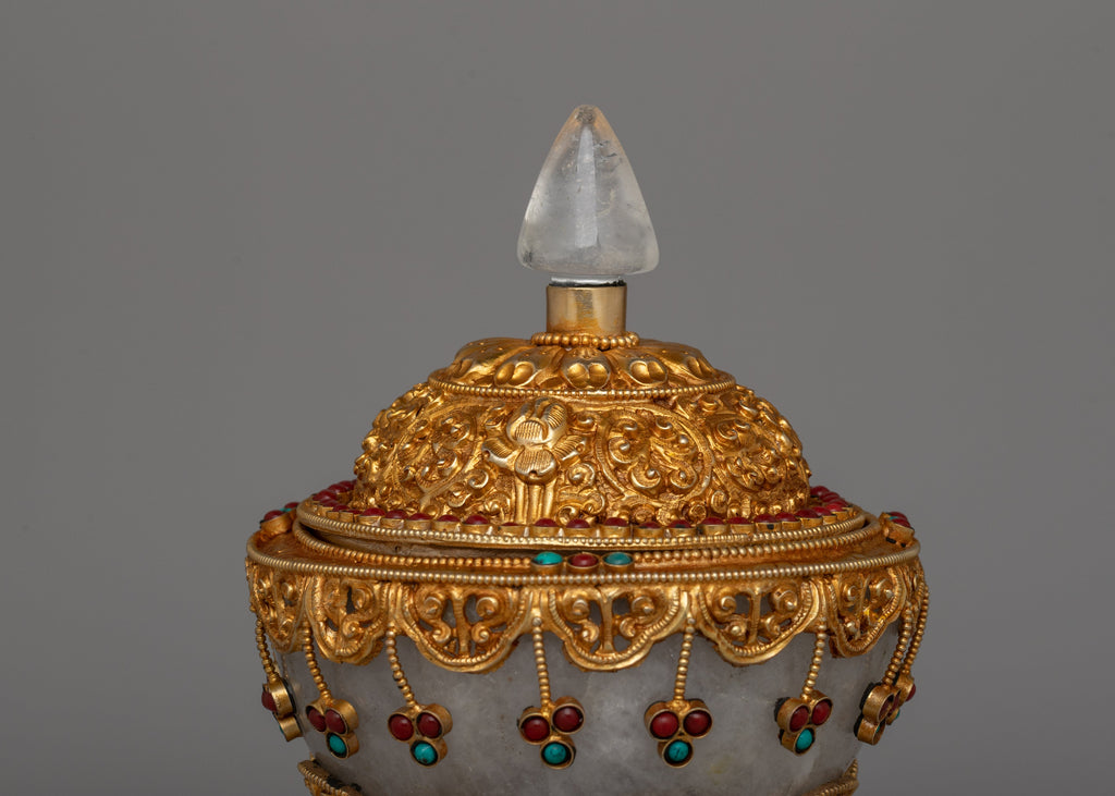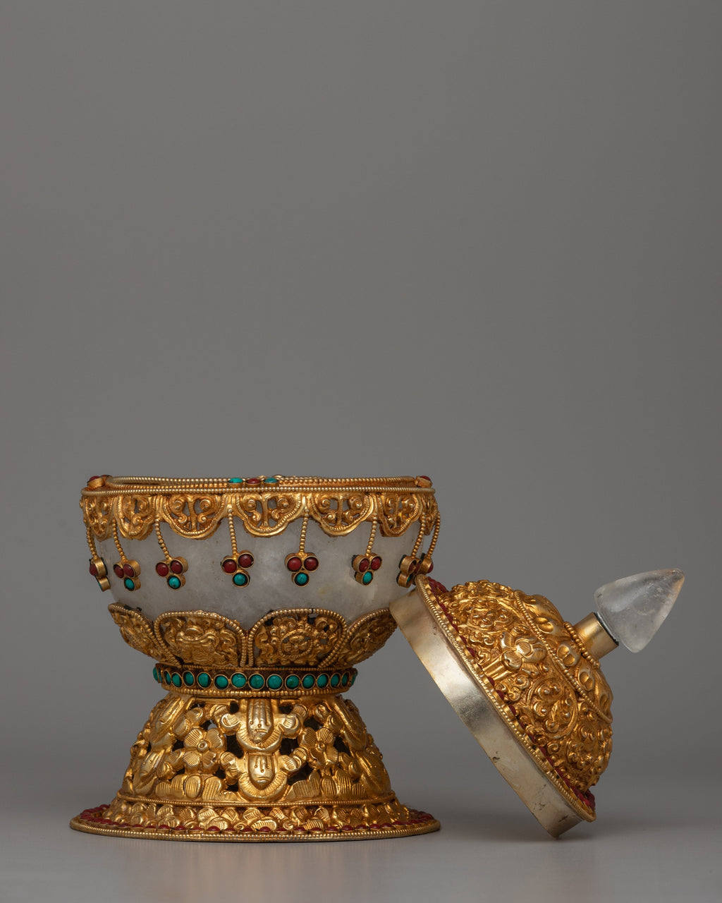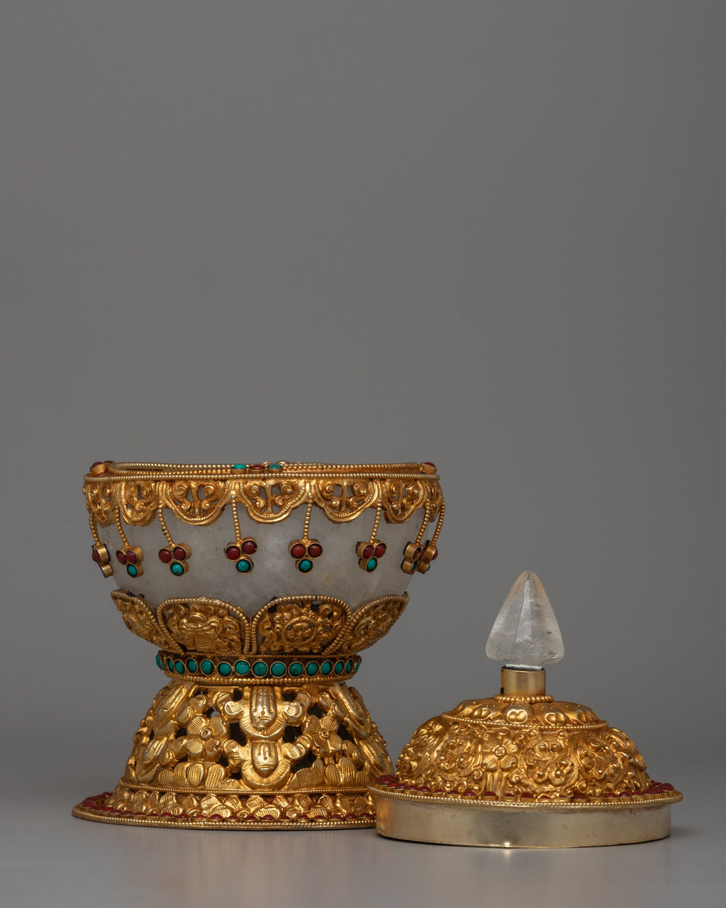 Traditionally used in ceremonial and religious contexts, this rice pot represents prosperity and abundance. The crystal centerpiece exudes purity, while the brilliant turquoise and coral stones offer a pop of color, improving the overall appeal. Whether displayed as a decorative piece, utilized in sacred rites, or given as a treasured heirloom, this pot represents cultural legacy and spiritual value.