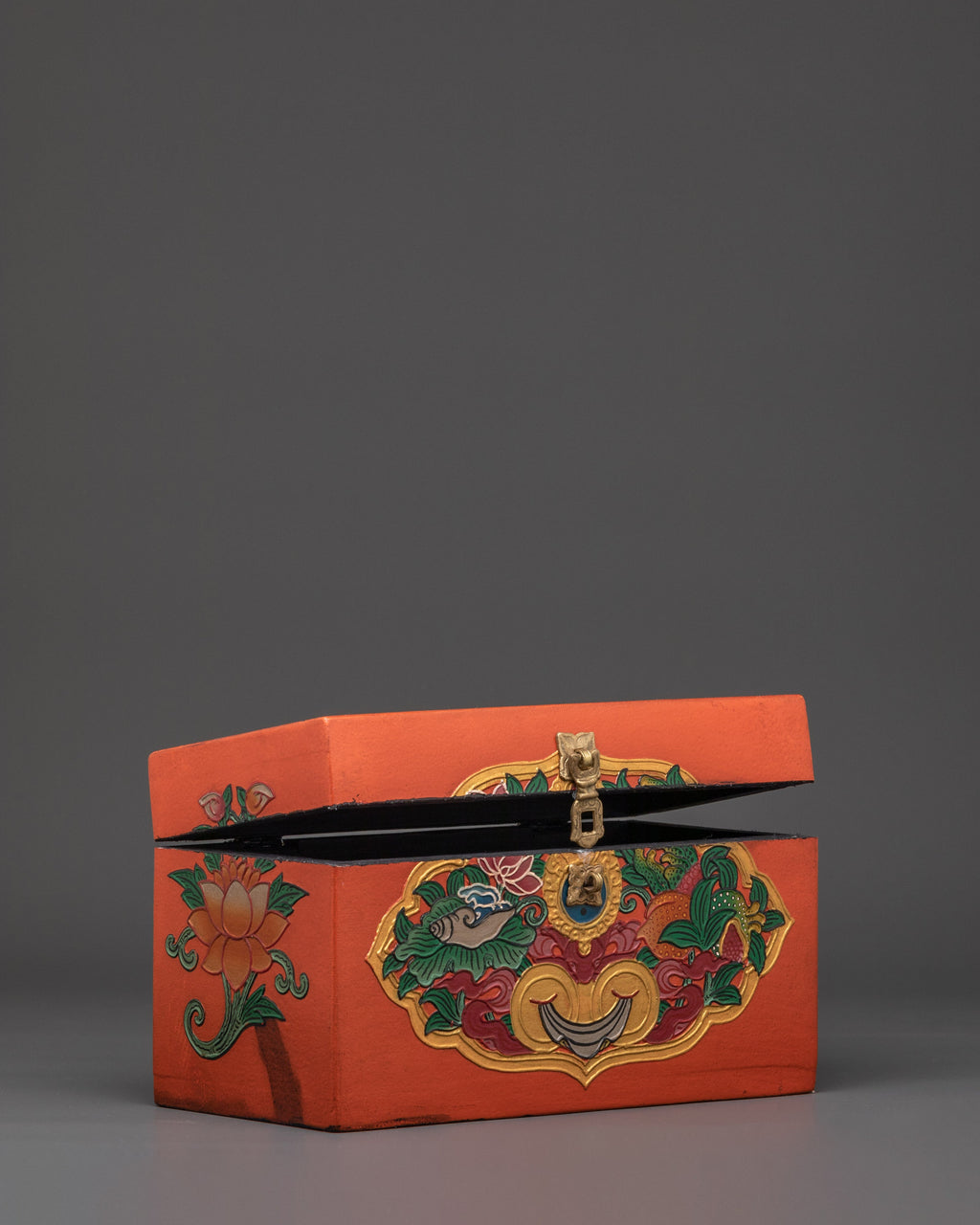 The Bisho Vajra symbolizes indestructibility and spiritual power, the Lotus represents purity and spiritual awakening, and the Conch is used to proclaim the truth and spread the sound of the Dharma. These powerful symbols transform this Tibetan Decorative Storage Box into more than just a functional piece; it becomes a meaningful spiritual artifact. Perfect for holding sacred items, offerings, or prayer beads, this box supports your spiritual practice by keeping your treasured objects safe and close. Its intricate craftsmanship and symbolic designs make it a beautiful addition to any altar or meditation space, enhancing the energy and intention of your sacred environment. Whether for personal use or as a thoughtful gift, this box embodies the rich heritage and profound teachings of Tibetan Buddhism.