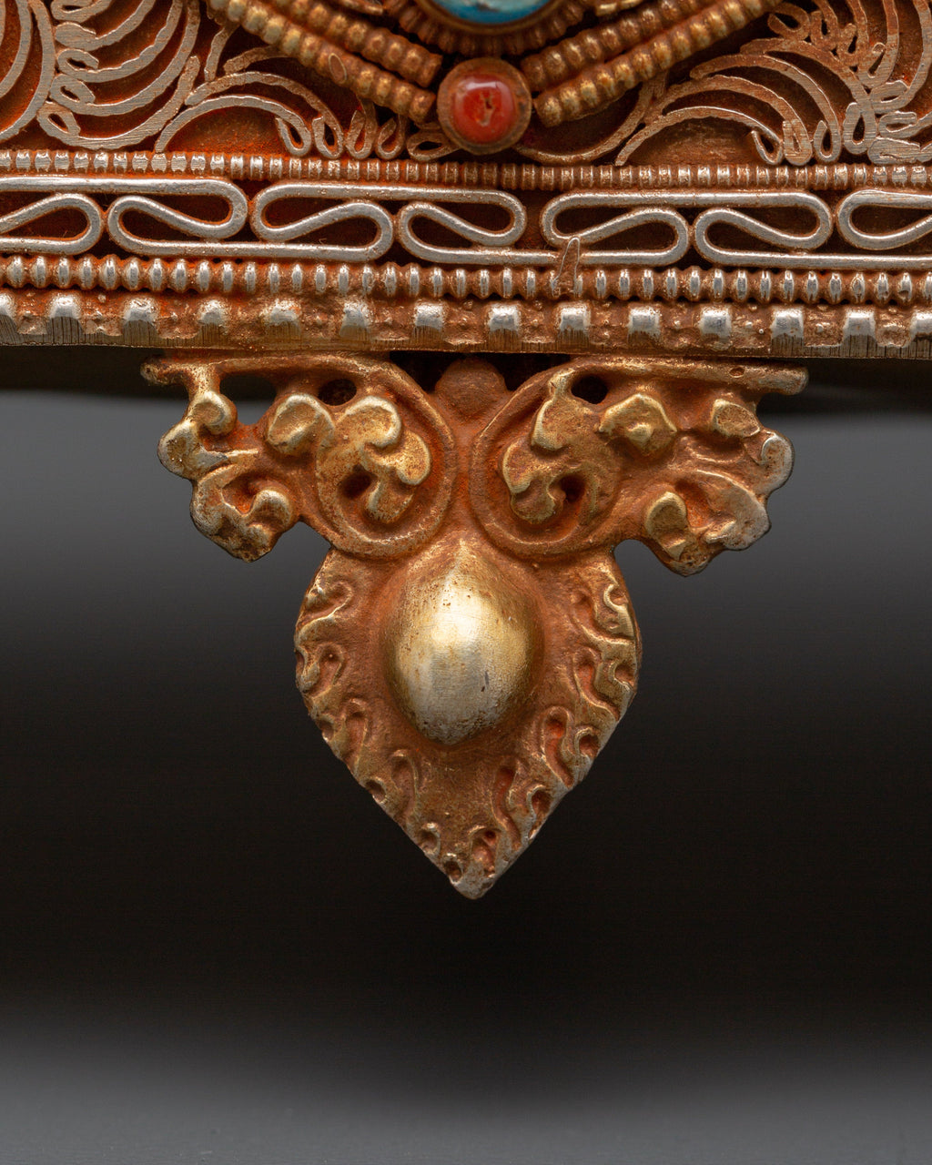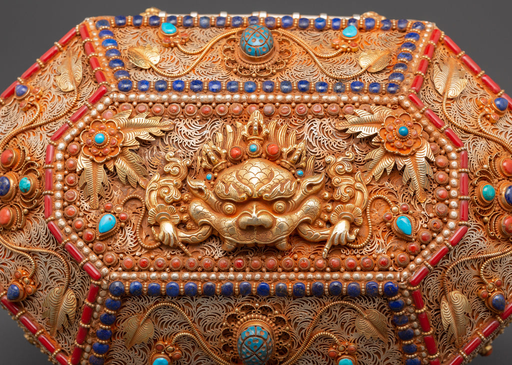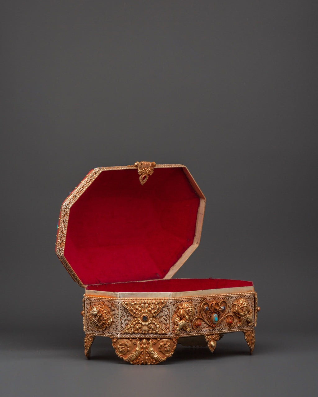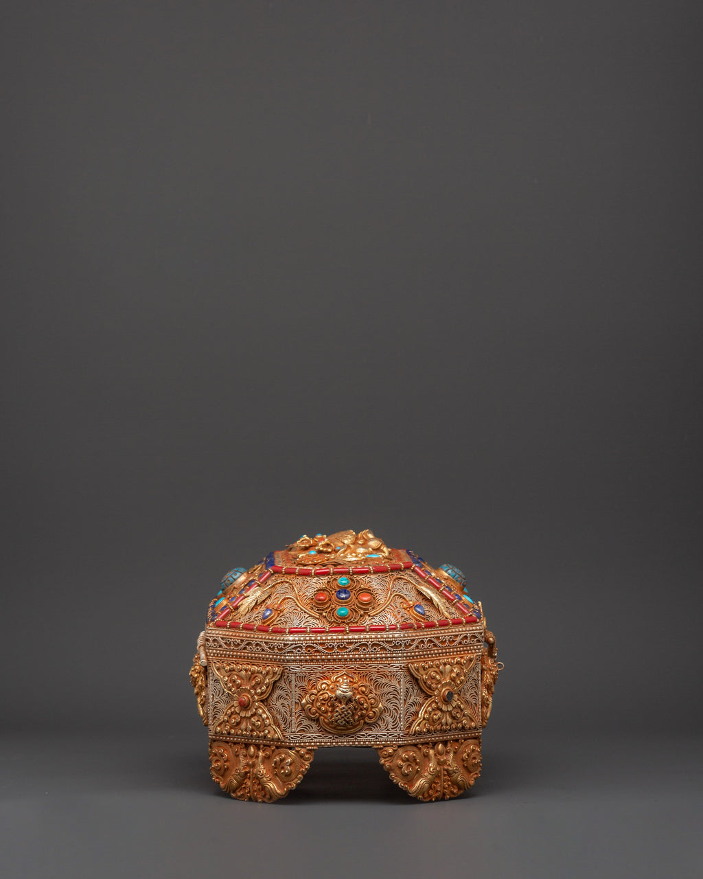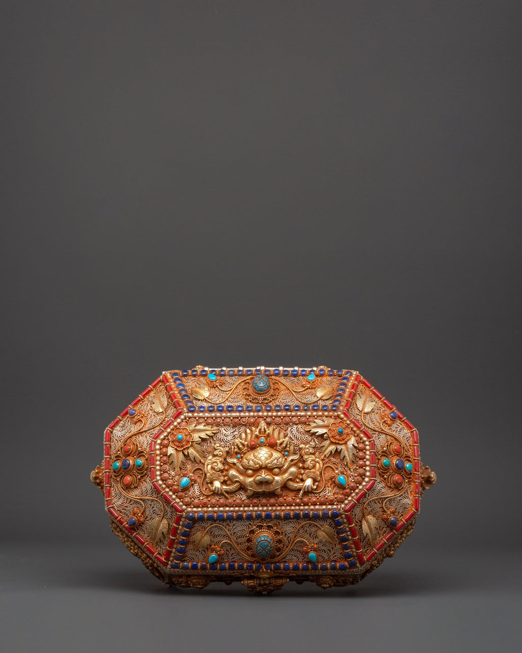The Treasure box is made of copper and is beautifully gold-plated. It is delicately embellished with artificial turquoise and coral stones, which symbolize the sacred harmony of knowledge and compassion in Tibetan tradition. Detailed lion guards, floral designs, and protective symbols adorn every surface, showcasing exceptional artisanal skill and spiritual symbolism. Whether you're creating a shrine, following tradition, or collecting sacred art, this treasure box brings ageless beauty and religious significance to your surroundings.