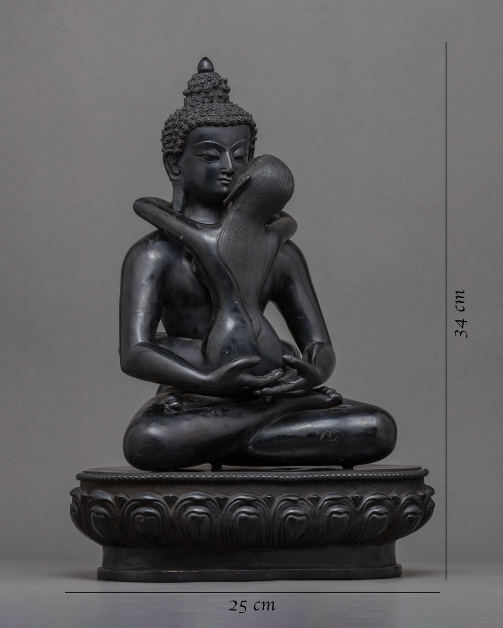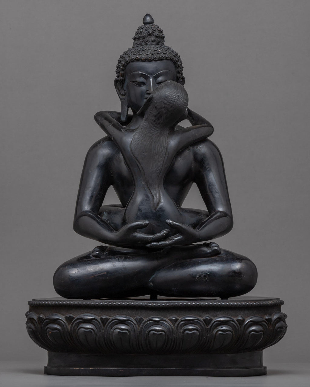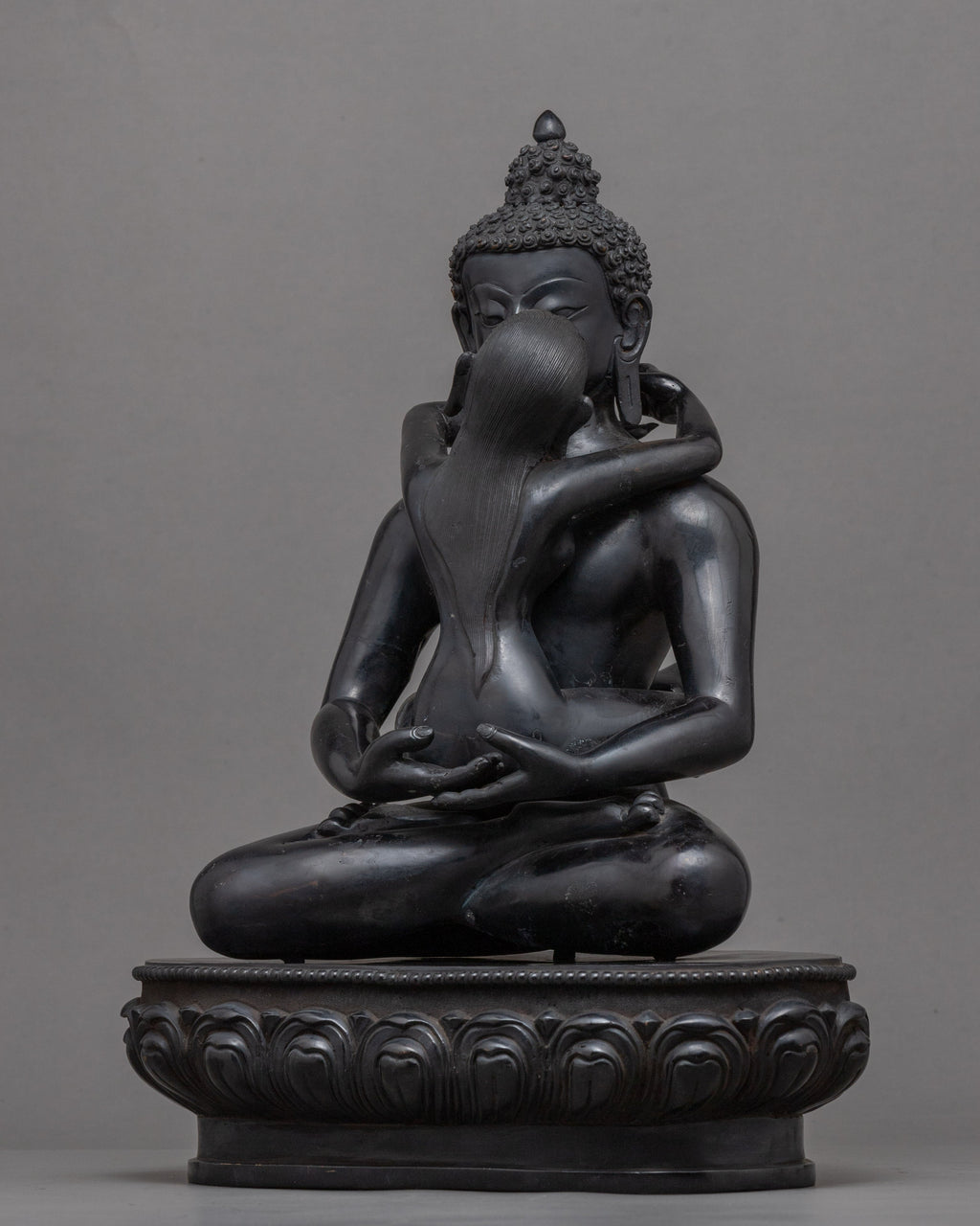 The sculpture of Samantabhadra Consort in Nepalese Himalayan Art was hand-carved by us in our studio. We are a team of skilled sculptors whose techniques have been handed down through the generations. Samantabhadra and Consort "Yab-Yum" is depicted in this one-of-a-kind picture seated in the vajra pose in the sacred union position on a moon disc of lotus. Samantabhadra is encircled by Samantabhadri in a meditative position. The statue's body was made of copper. We utilized detailed acrylic paints to bring the statue to life. This figurine weighs about 9.10 kg. This will be a perfect gift from Nepal to practice Samantabhadra and his teachings. We used hammers and chisels to carve the intricate attributes of the deity.