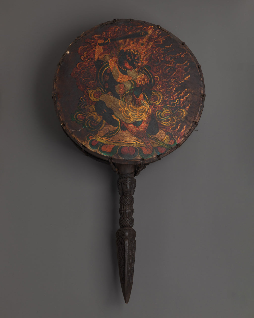 A Chod drum, integral to the Chod spiritual practice in Tibetan Buddhism, is a unique and symbolic instrument. Also known as a damaru, this small, double-sided hand drum has a narrow waist connecting two drumheads. The drum's shape is often likened to the hourglass, embodying the union of wisdom and compassion. Chod practitioners use the drum's rhythmic beating during ritualistic ceremonies to connect with the sacred energies, facilitating meditation and the realization of emptiness. With its ritualistic role, the Chod drum underscores the synthesis of sound, spirituality, and meditation in Tibetan Buddhist traditions.