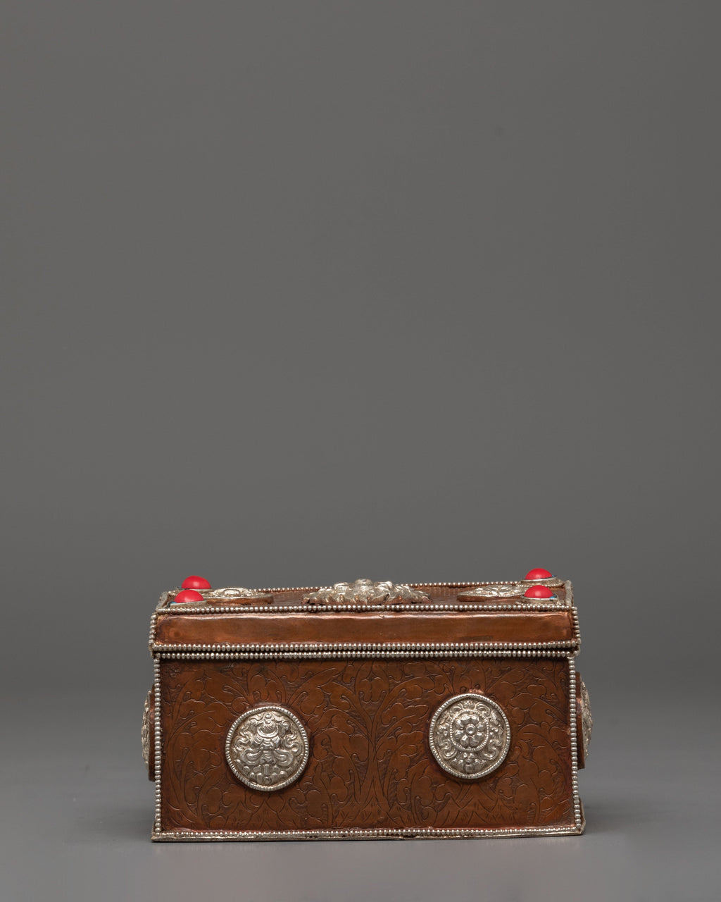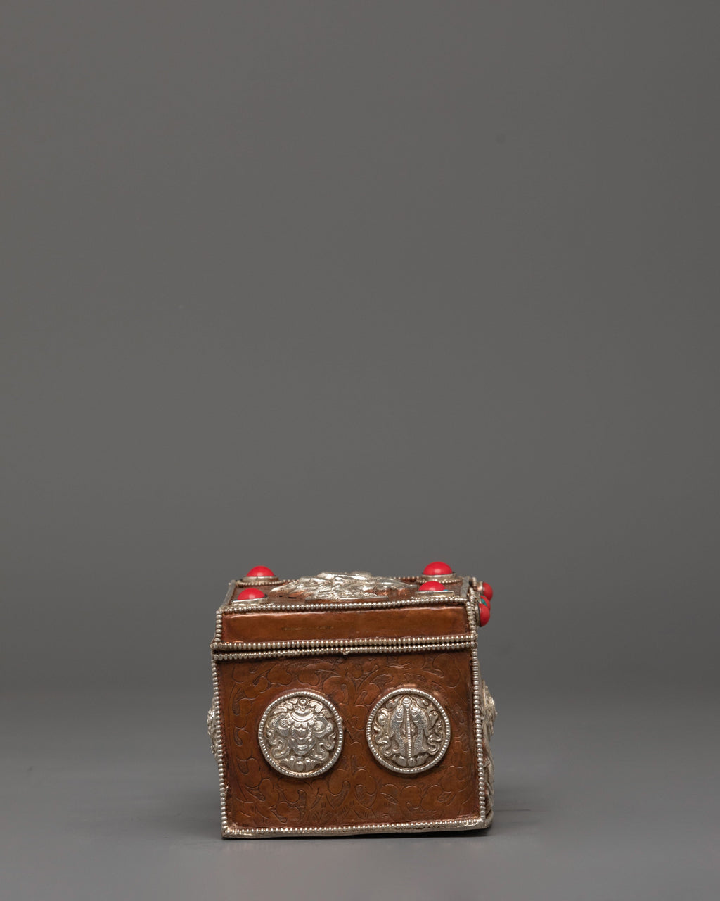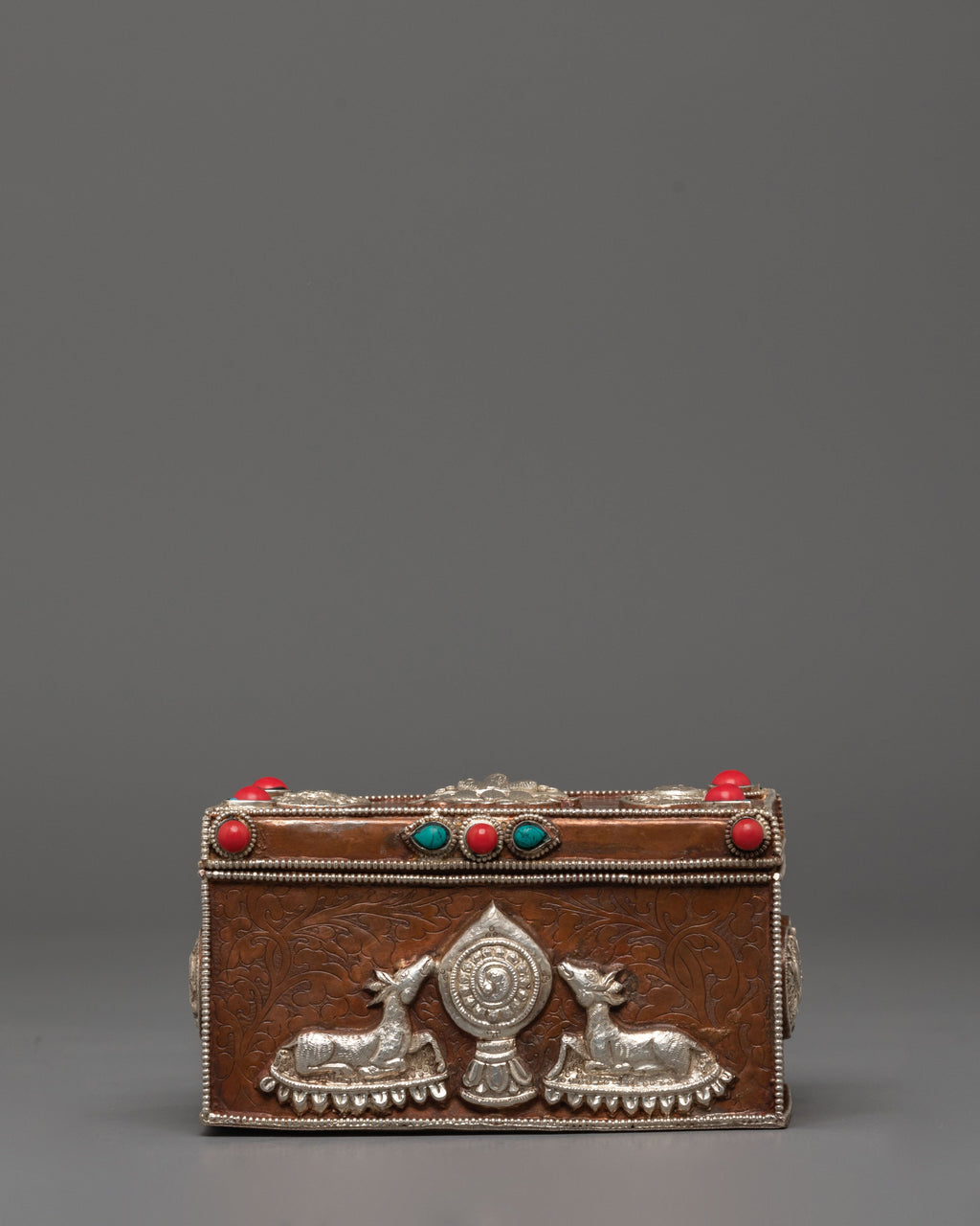 The front of the box proudly displays a raised Dharma Wheel flanked by two deer—an iconic Tibetan motif representing the Buddha’s first teachings at Deer Park in Sarnath. These symbols reflect purity, compassion, and the awakening of wisdom. The surrounding floral engravings highlight traditional Himalayan artistry, while the top is adorned with coral and turquoise stones that symbolize vitality, protection, healing, and spiritual clarity. Every detail is carefully crafted, making the box both visually stunning and spiritually meaningful.