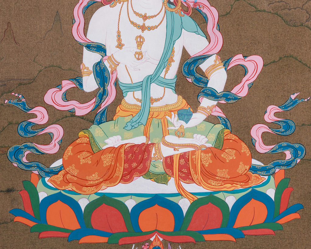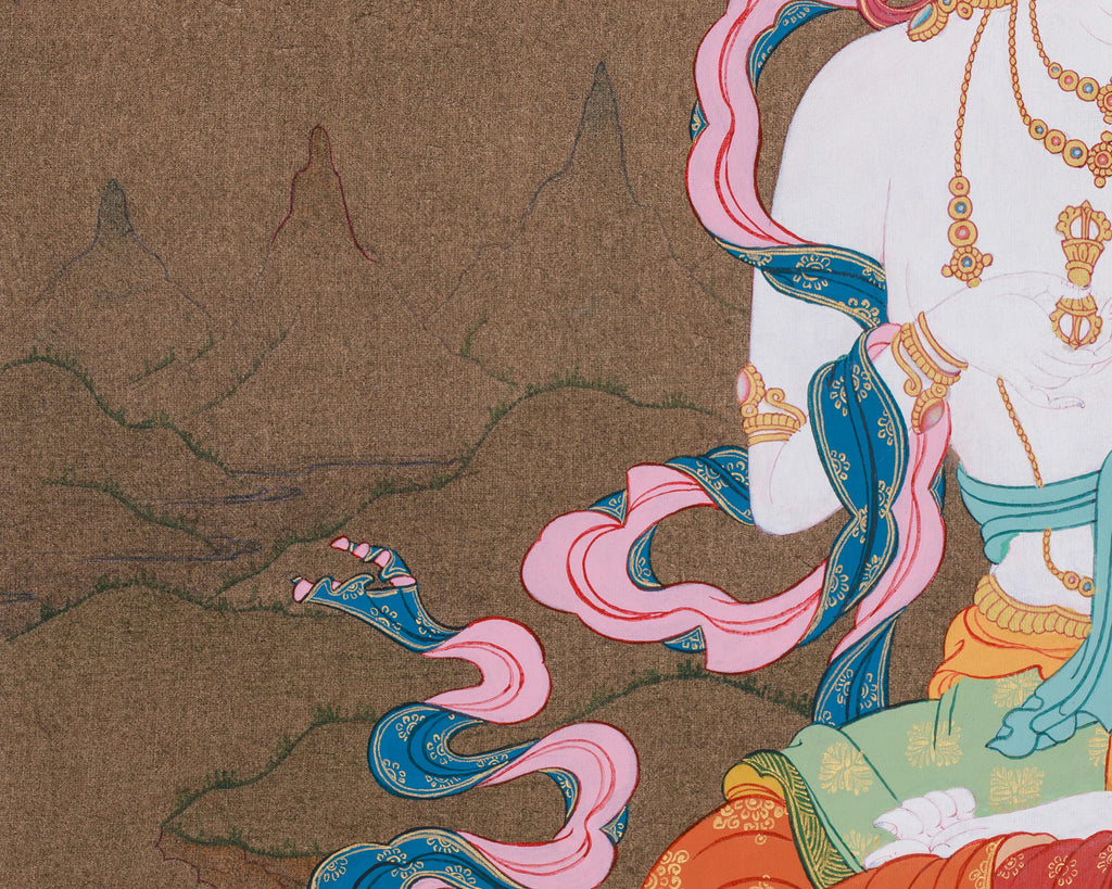 This handmade Tibetan dorje sempa painting features vibrant acrylic colors and 24K gold accents on cotton canvas. The durable cotton provides a smooth, sacred surface that highlights intricate details. Bright colors vividly depict Vajrasattva’s form and energetic presence, while touches of gold emphasize his crown, jewelry, and aura, creating a soft, spiritual glow. Gold not only symbolizes sacredness but also reflects the traditional Karma Gadri style, renowned for its elegance, refined proportions, and harmonious balance.