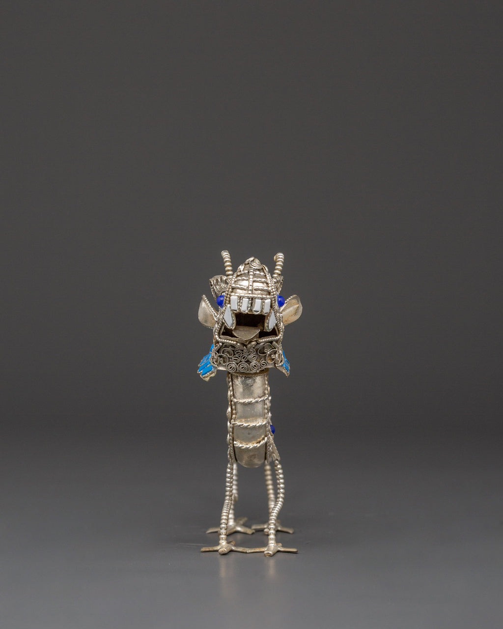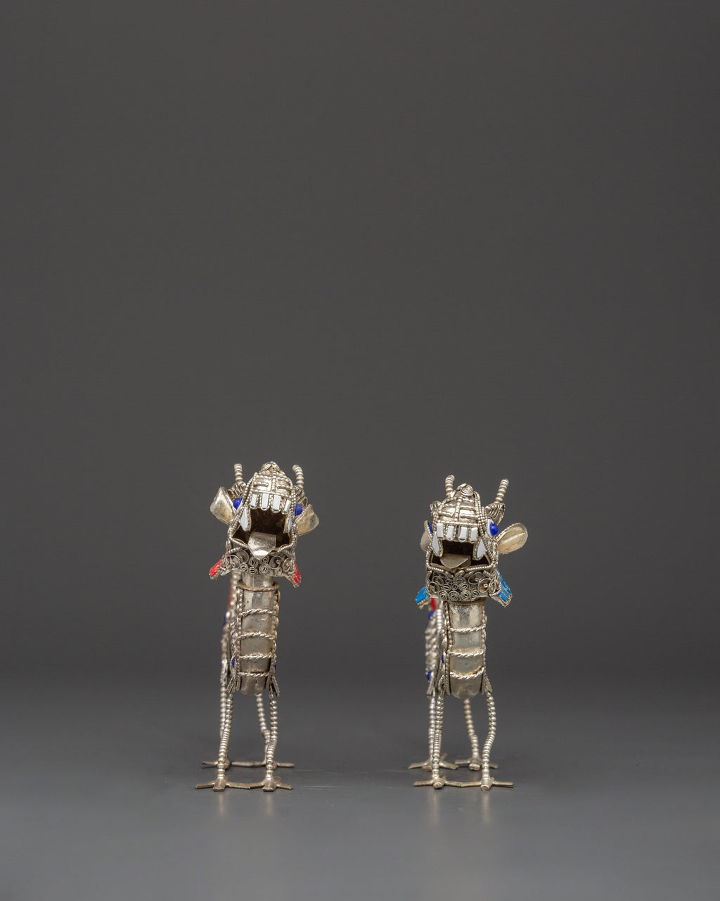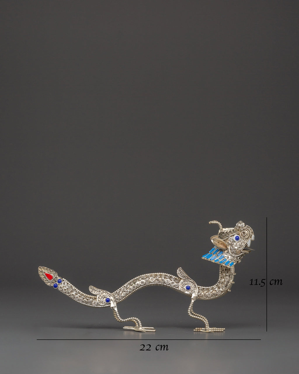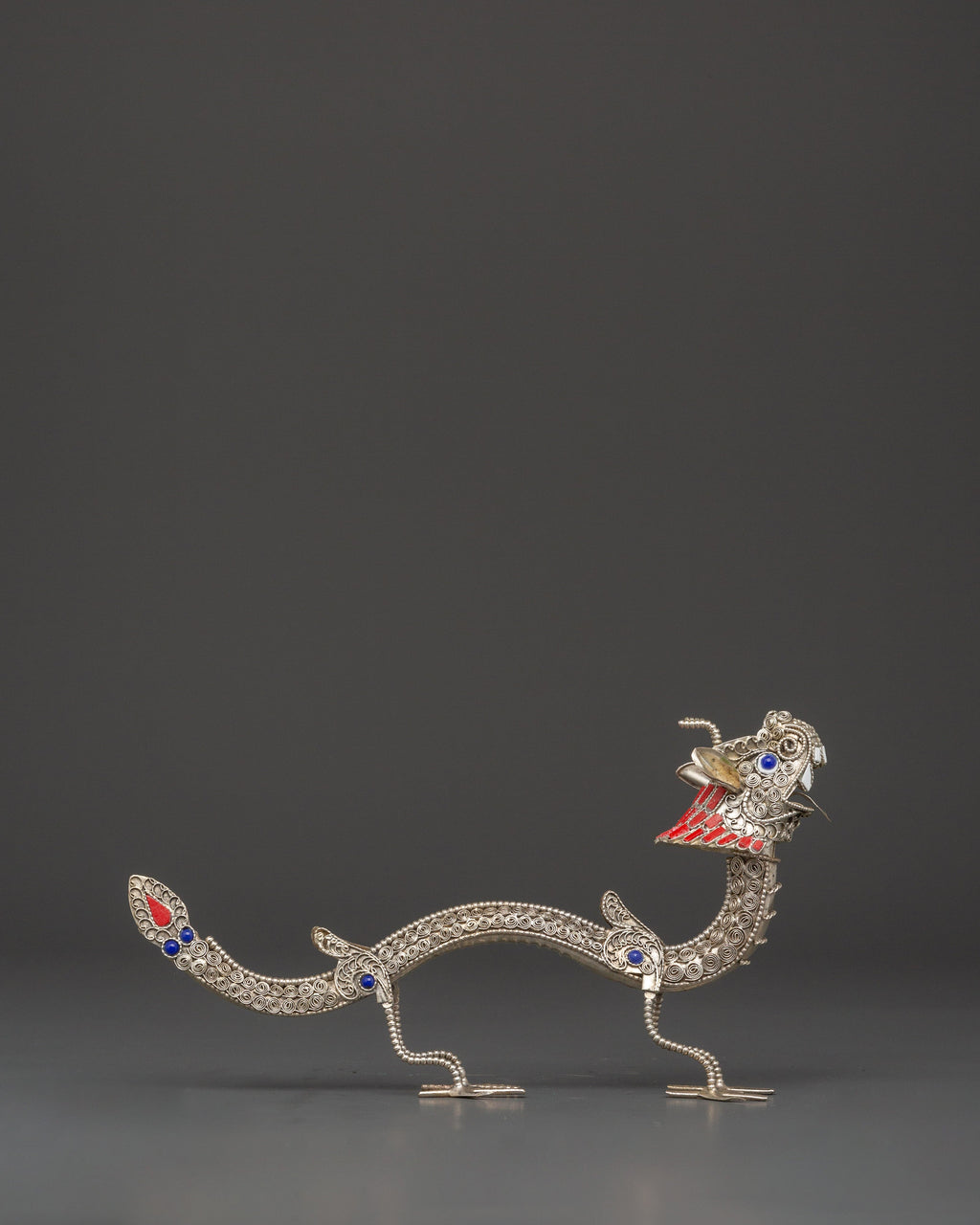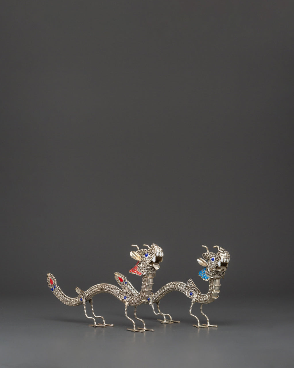 This Tibetan Dragon Statue Set includes a pair of finely carved guardian dragons made of white metal with a silver-plated finish embellished with colorful coral stones. Each dragon is 11.5 cm tall and 22 cm wide, weighing 0.102 kilogram individually and 0.206 kg when combined. Their dynamic, flowing shapes, establish beliefs, and beautiful filigree details evoke power and protective energy, making them ideal for exhibition in spiritual areas or as eye-catching decorative art.