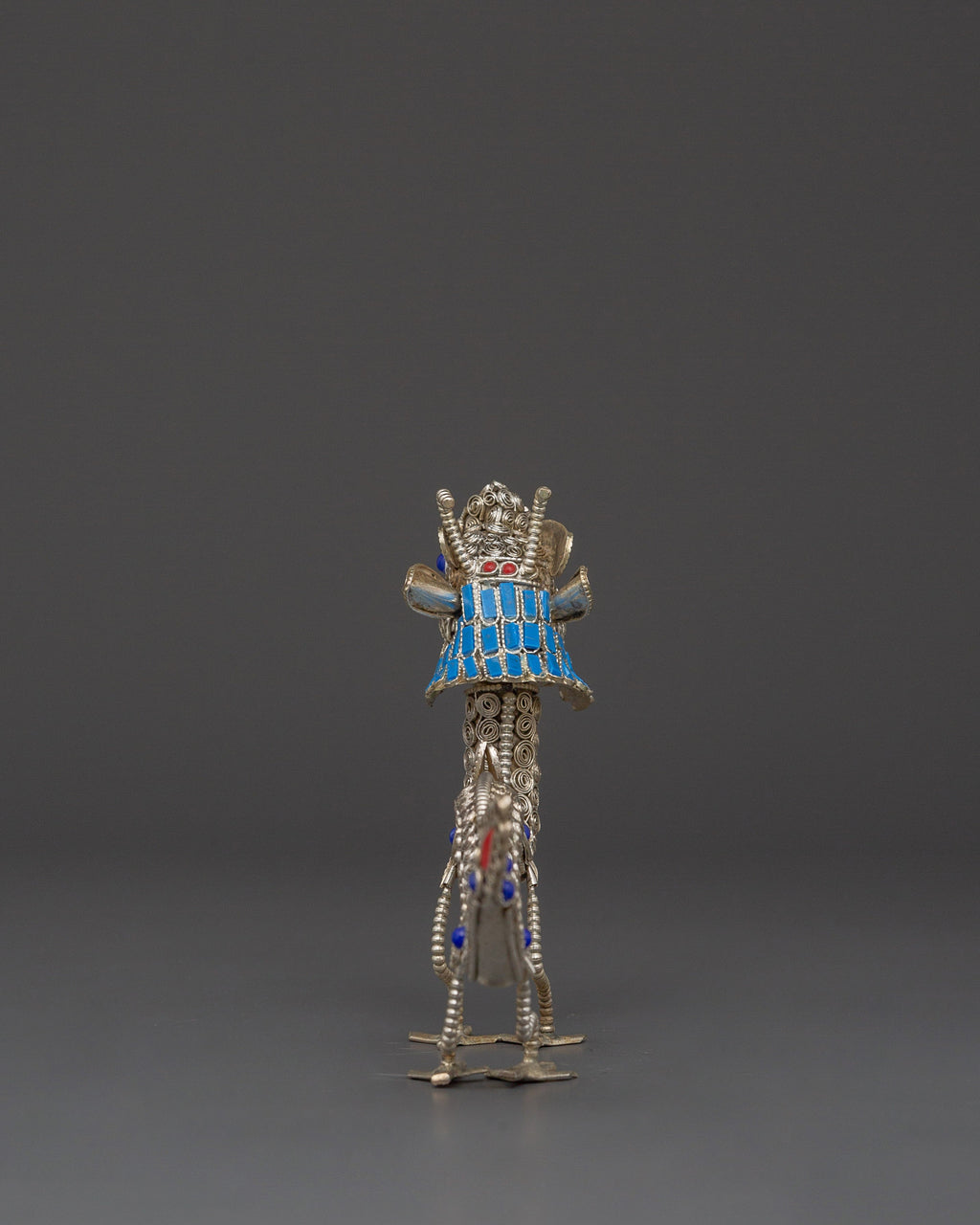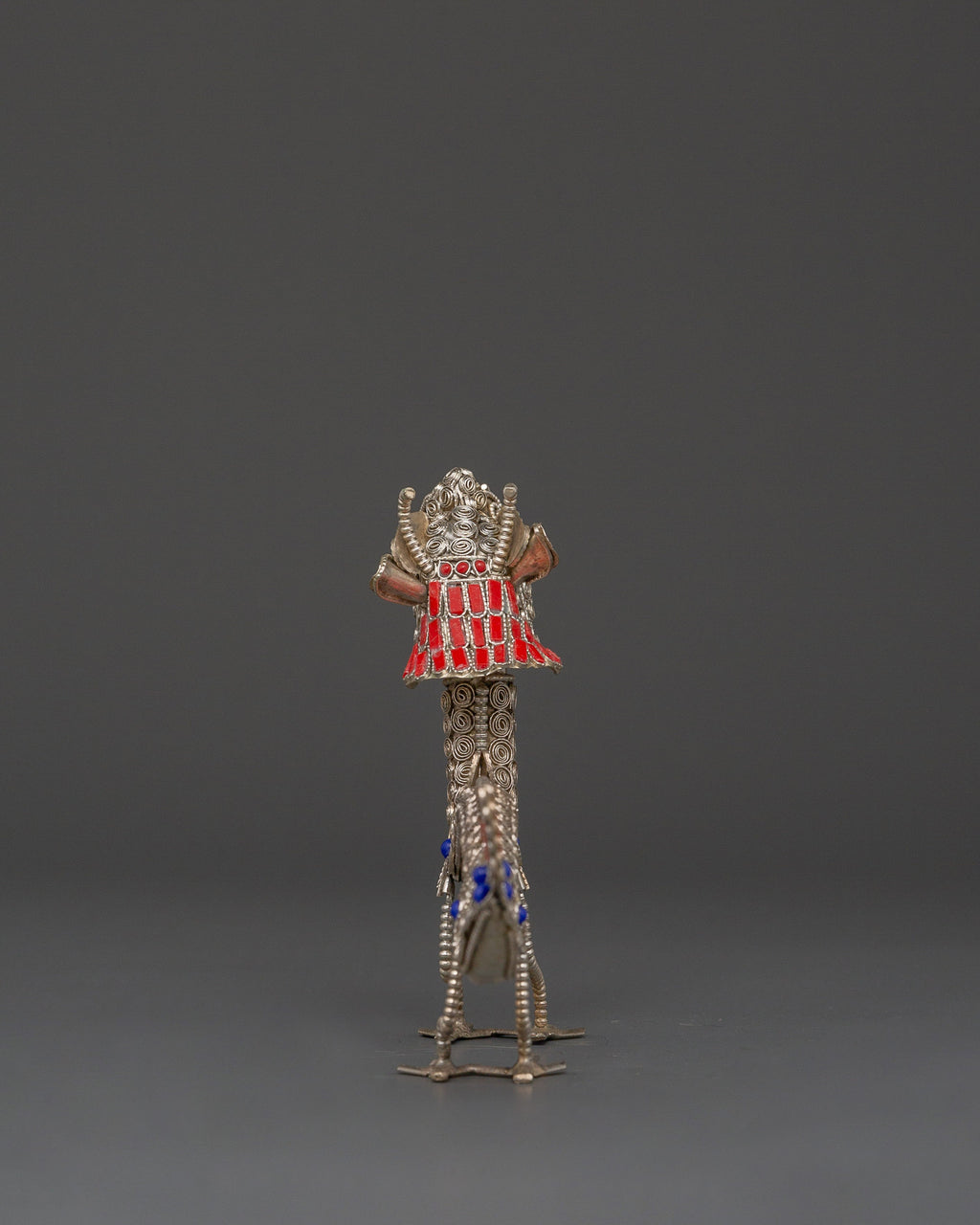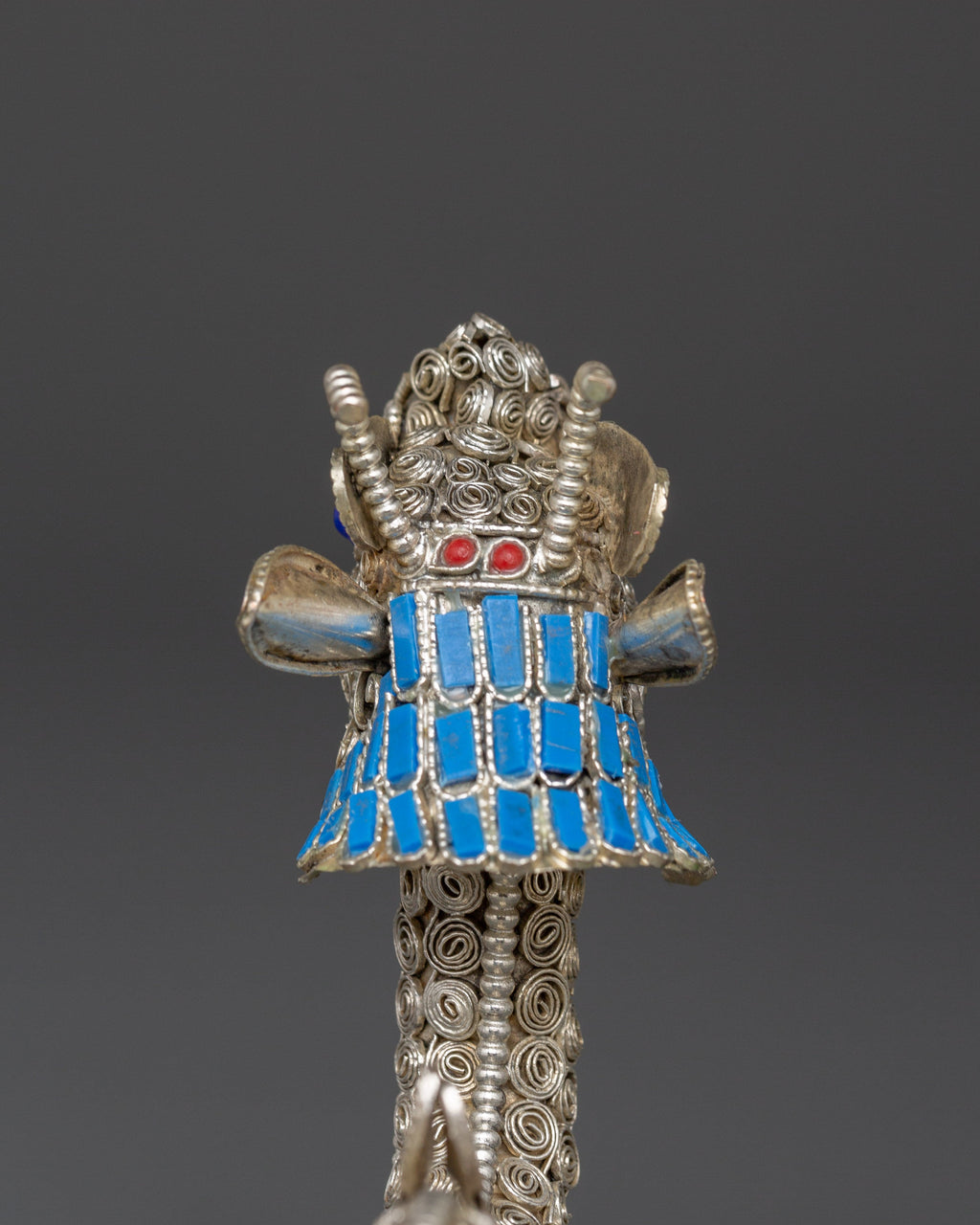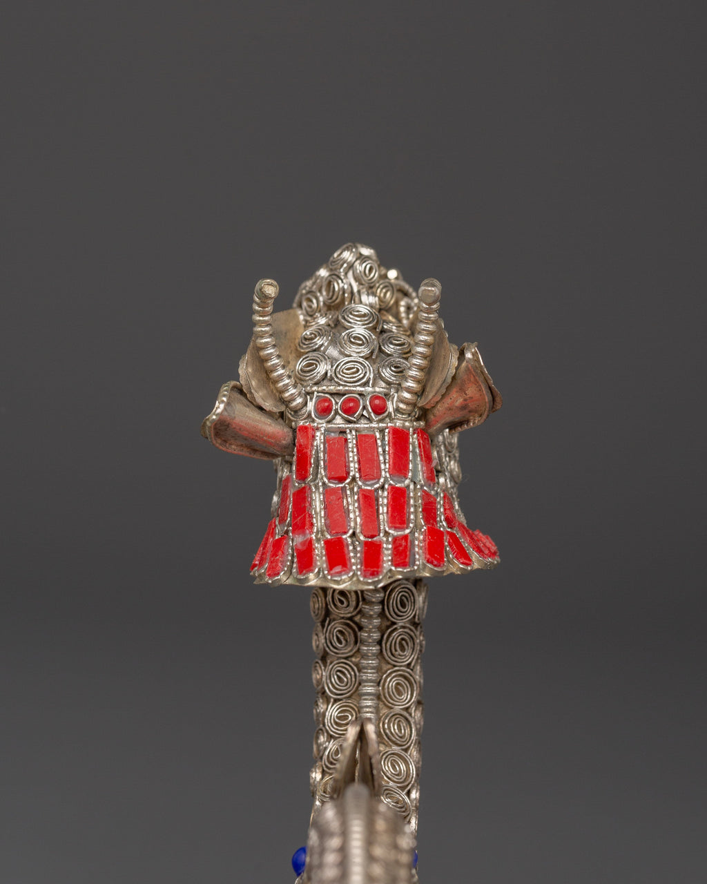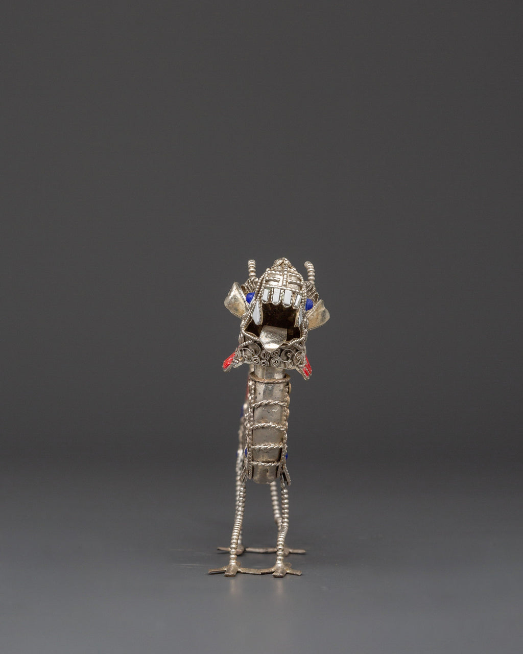 This Tibetan Dragon Statue Set includes a pair of finely carved guardian dragons made of white metal with a silver-plated finish embellished with colorful coral stones. Each dragon is 11.5 cm tall and 22 cm wide, weighing 0.102 kilogram individually and 0.206 kg when combined. Their dynamic, flowing shapes, establish beliefs, and beautiful filigree details evoke power and protective energy, making them ideal for exhibition in spiritual areas or as eye-catching decorative art.