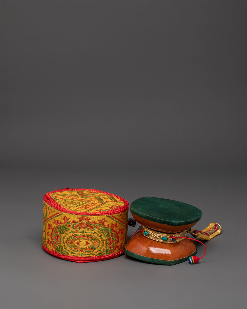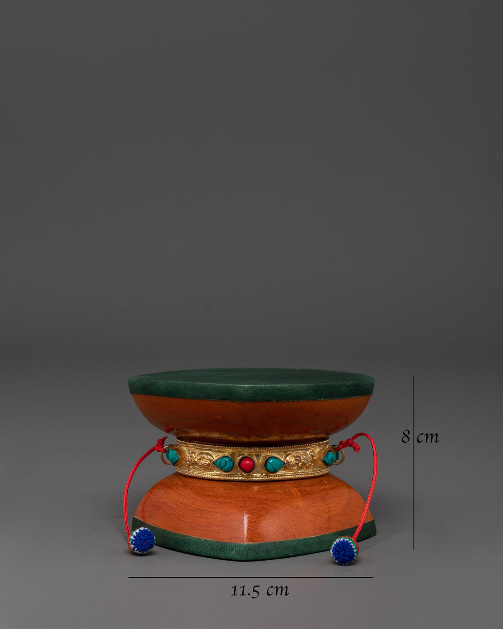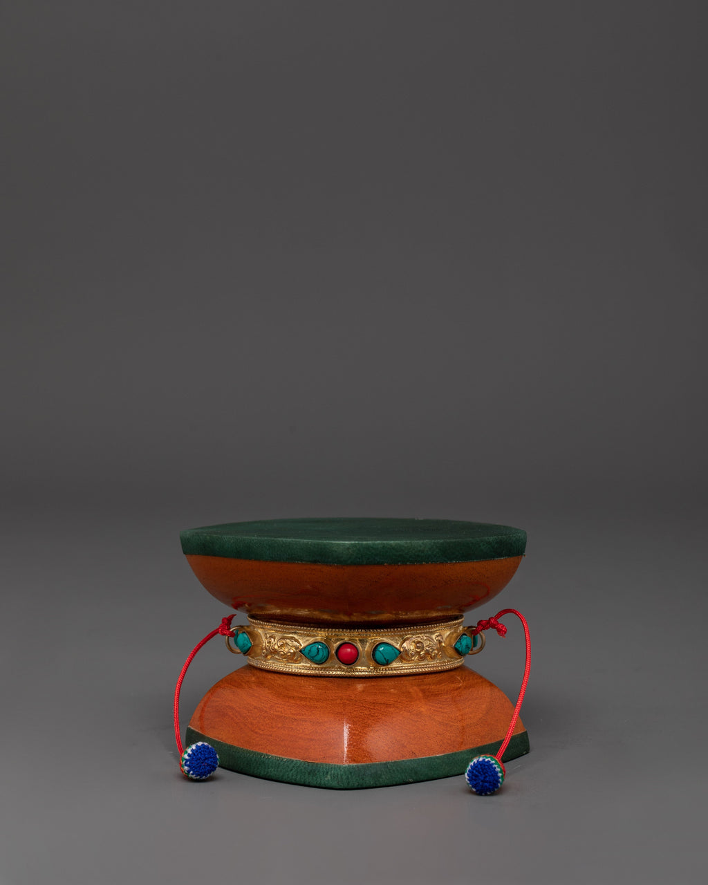 This Tibetan drum, crafted from gold-plated copper, is a handcrafted spiritual instrument with roots in Himalayan culture. Its modest size (8 cm in height and 11.5 cm in width) and powerful resonance make it suitable for personal rituals, sound healing, and Buddhist ceremonies. The drum is expertly crafted from genuine Bhutanese wood and finished with ethically sourced dyed goat skin, producing a rich, vibrant tone. The meticulous craftsmanship features mercury gold-plated copper inlays and imitation turquoise and coral stones, which enhance its aesthetic and symbolic value. The cover, weighing 0.11 kg, ensures safe storage, while the overall weight of 0.37 kg makes it lightweight and portable.