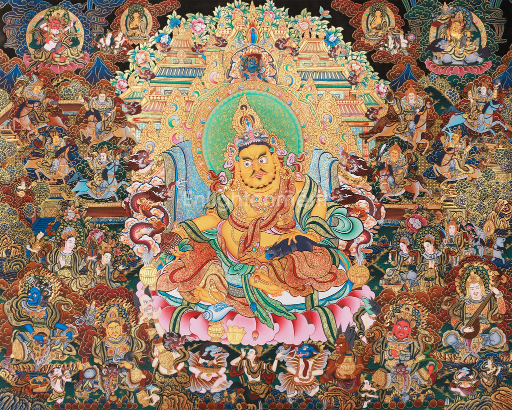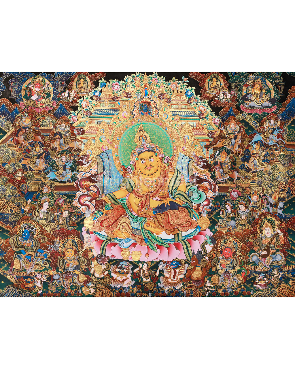 The thangka also features Namtose (Vaisravana) on the left side, Red Dzambhala with his consort on the top right, along with attendant figures, and offering symbols. These additional beings are harmoniously arranged around the central figure, creating a full assembly of divine support and sacred wealth energy. It is a spiritual environment, preserving authentic Buddhist iconography and providing practitioners with a visual portal into his sacred realm of protection, prosperity, and enlightened generosity.