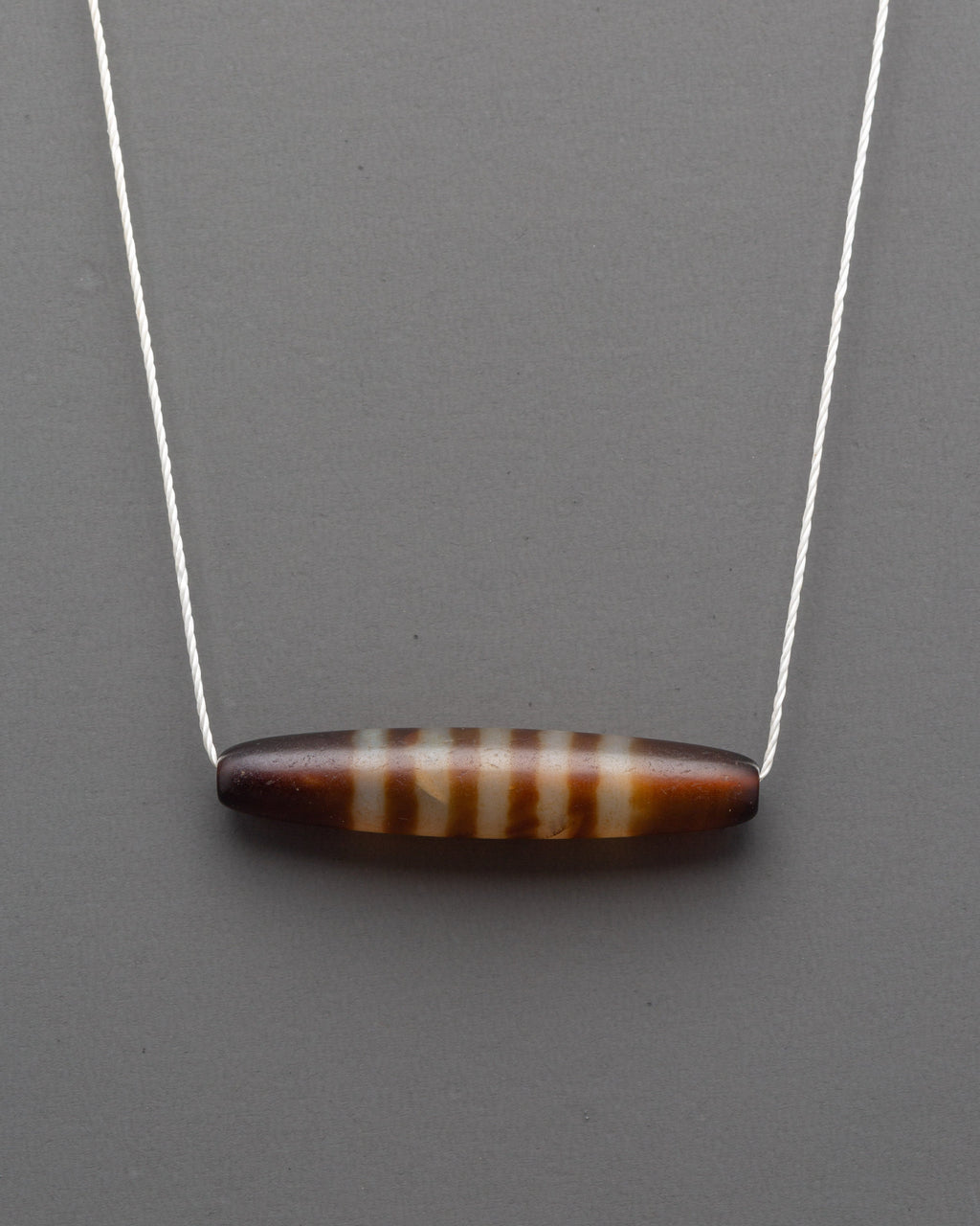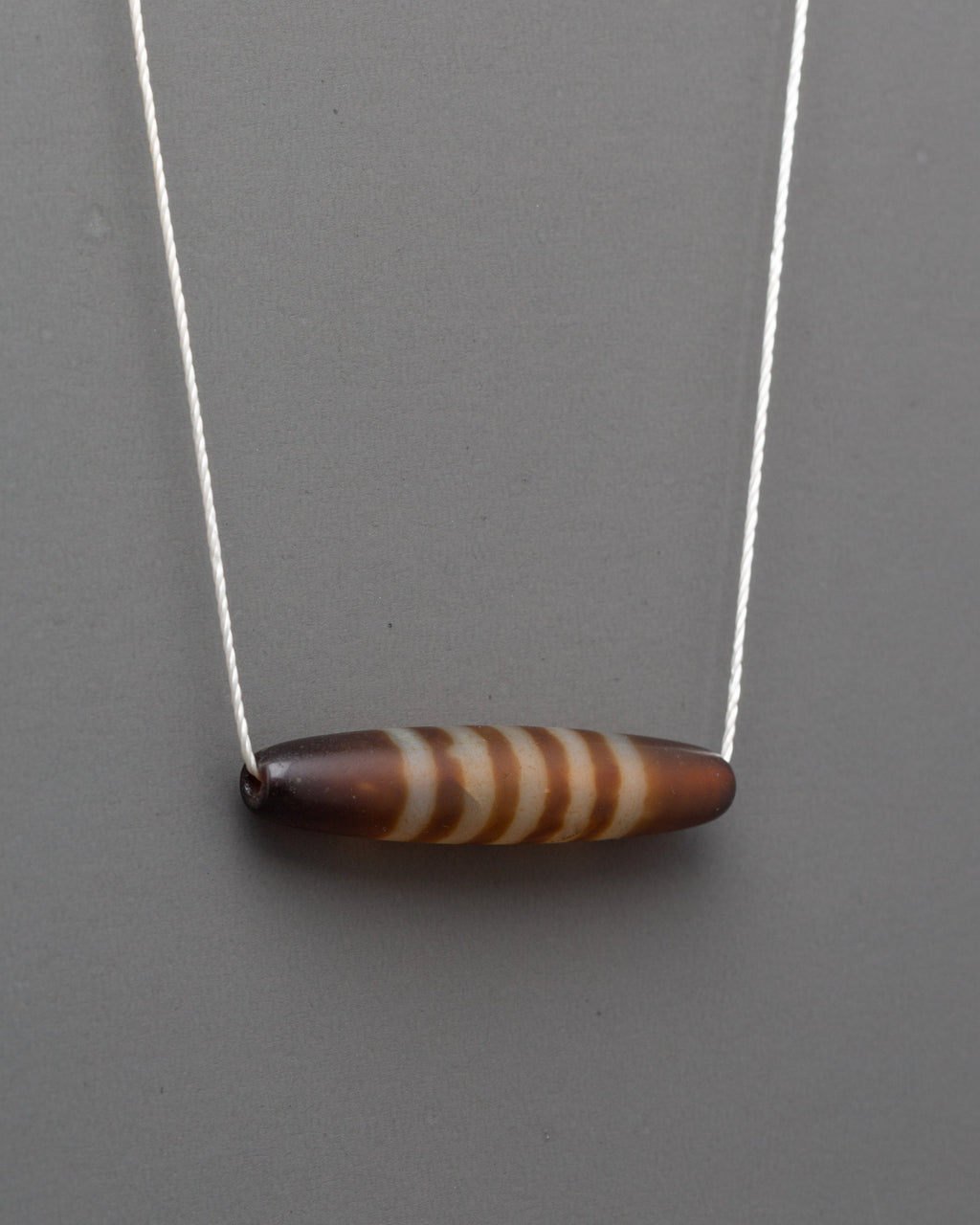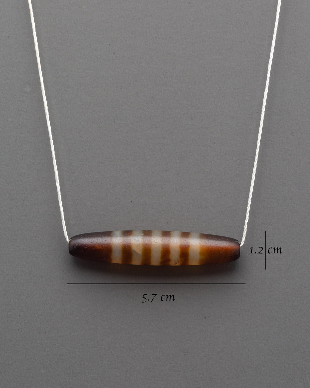 The locket's design showcases the Dzi bead's inherent patterns and marks, with each symbol holding distinct spiritual connotations. The elongated bead is thought to promote wisdom, health, and fortune. Its polished surface and distinctive Tibetan designs not only enhance its visual appeal but also heighten its protective and auspicious properties. Its small size makes it a versatile accessory that can be worn with necklaces, bracelets, or other jewelry for both style and spiritual value.