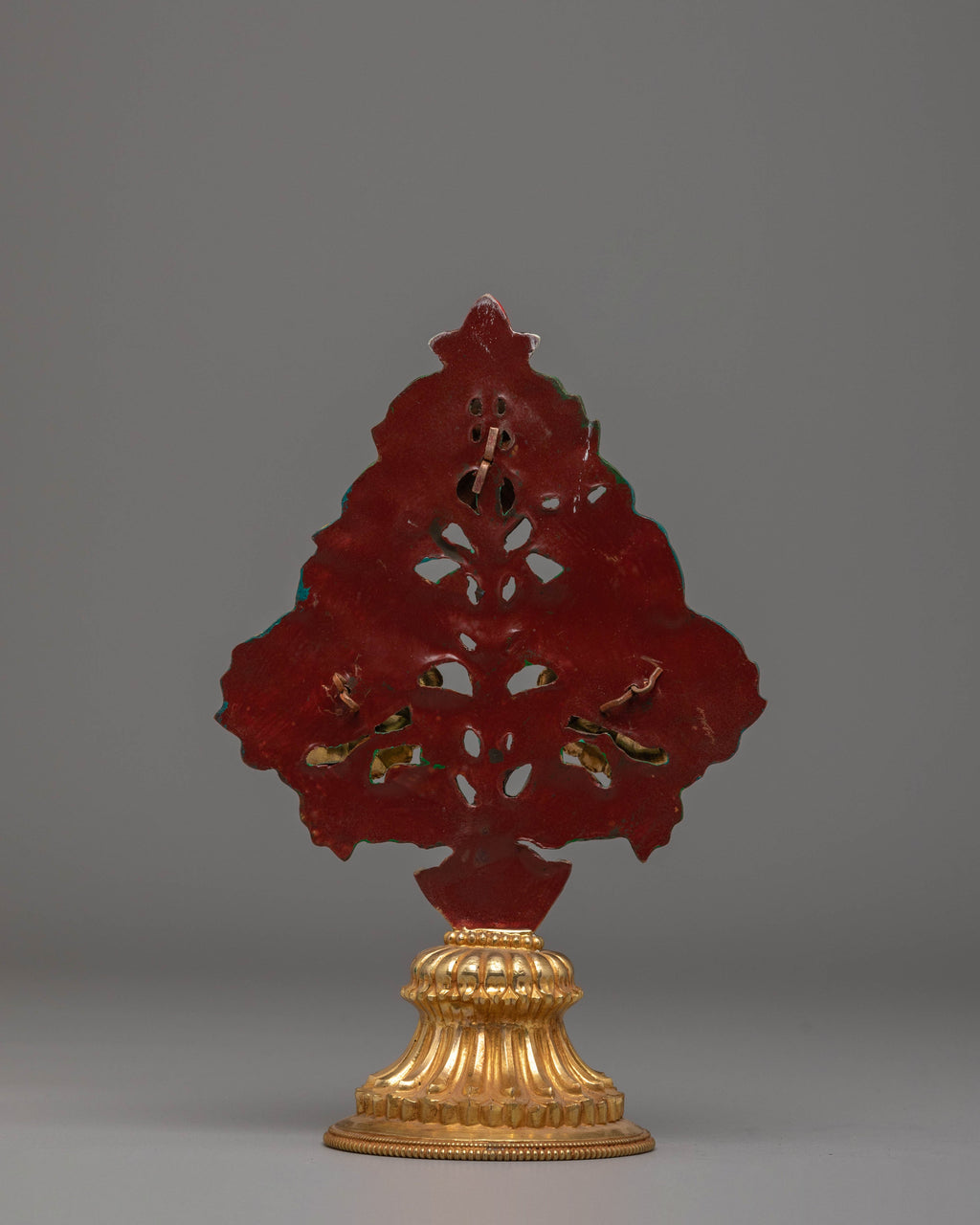 The Tibetan Flower for Decor is a stunning, intricate piece of traditional Tibetan art that will add beauty, color, and spiritual energy to your home or holy space. This ornamental flower, which stands 26 cm tall, measures 16.5 cm wide, and weighs 0.41 kg, is made of copper, coated with fire gold, and embellished with stones such as coral and turquoise. The brilliant acrylic hues add to the piece's visual appeal, making it a standout focal point in any setting. This flower represents the beauty of nature, spiritual development, and the blossoming of wisdom and compassion.