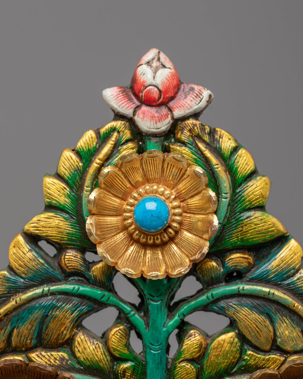 The design of this Tibetan Flower for Decor features intricate petals and leaves, carefully crafted to reflect the artistry and symbolism of Tibetan Buddhist culture. The central flowers are enhanced with turquoise and coral stones, both of which represent vitality, protection, and wisdom in Tibetan traditions. The fire-gold plating gives the flower an elegant, radiant finish, further emphasizing its spiritual significance. The use of acrylic color enhances the beauty of the piece, with rich green leaves and a vibrant lotus-like bloom on top, symbolizing purity and enlightenment.
