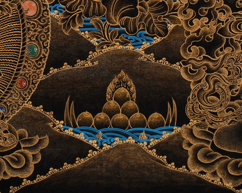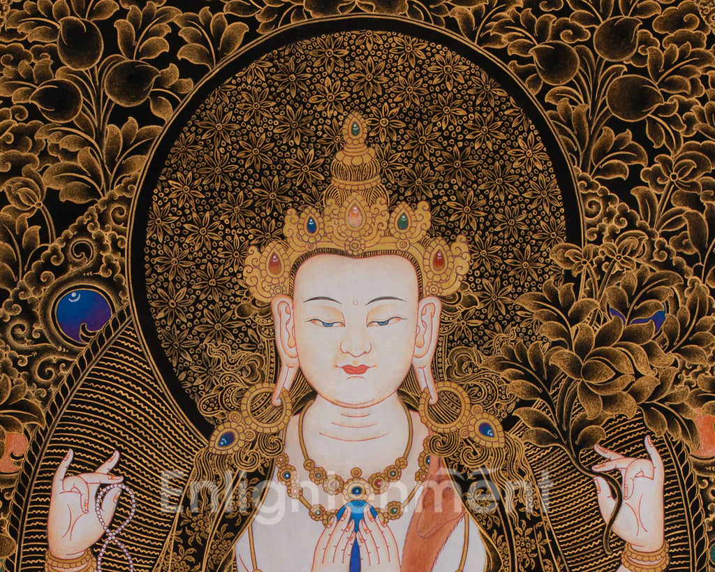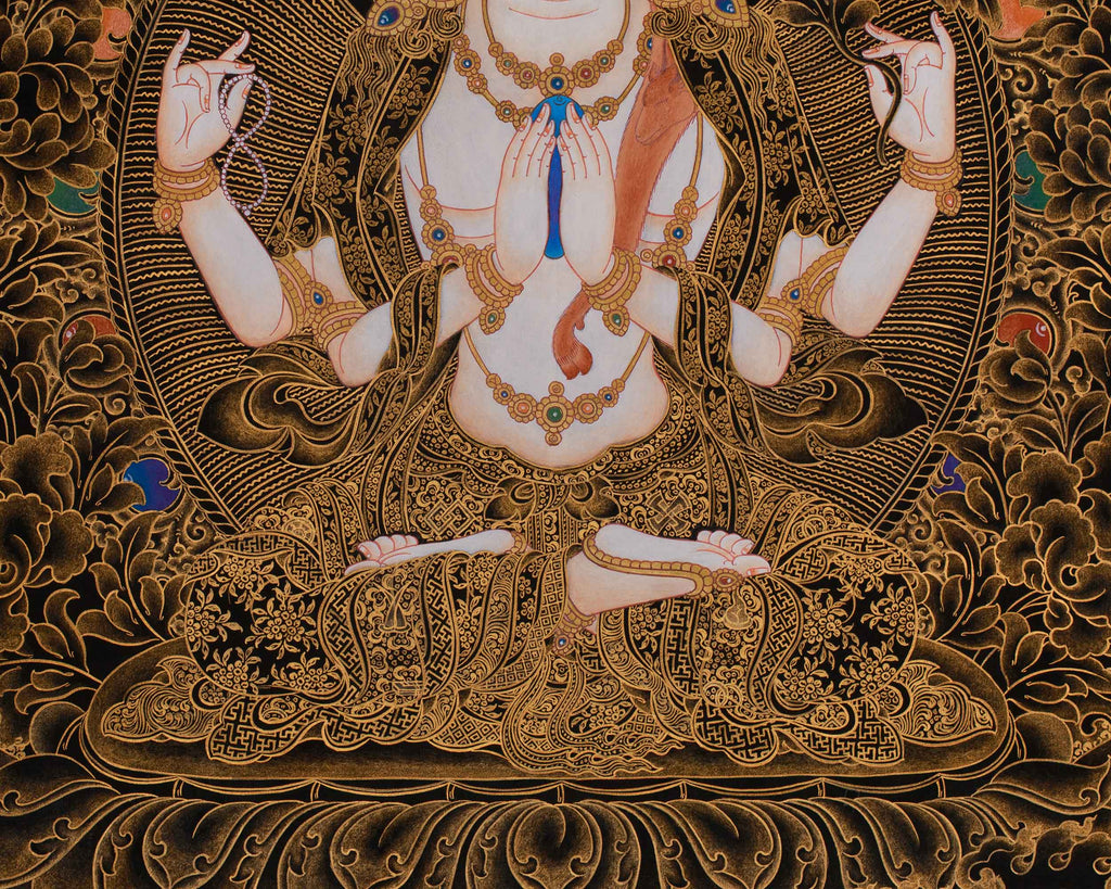 Radiating divine compassion and wisdom, this Tibetan Four-Armed Chenrezig Thangka embodies the essence of Tibetan Buddhism through its vivid gold details and expert artistry. The painting's background features a deep, luxurious black, contrasted by the deities illuminated with exquisite 24K gold accents. Acrylic paints are skillfully used to highlight the figures, emphasizing their spiritual significance and visual beauty. Every brushstroke enhances the story's depth, resulting in a visual masterpiece that encourages contemplation and reverence.