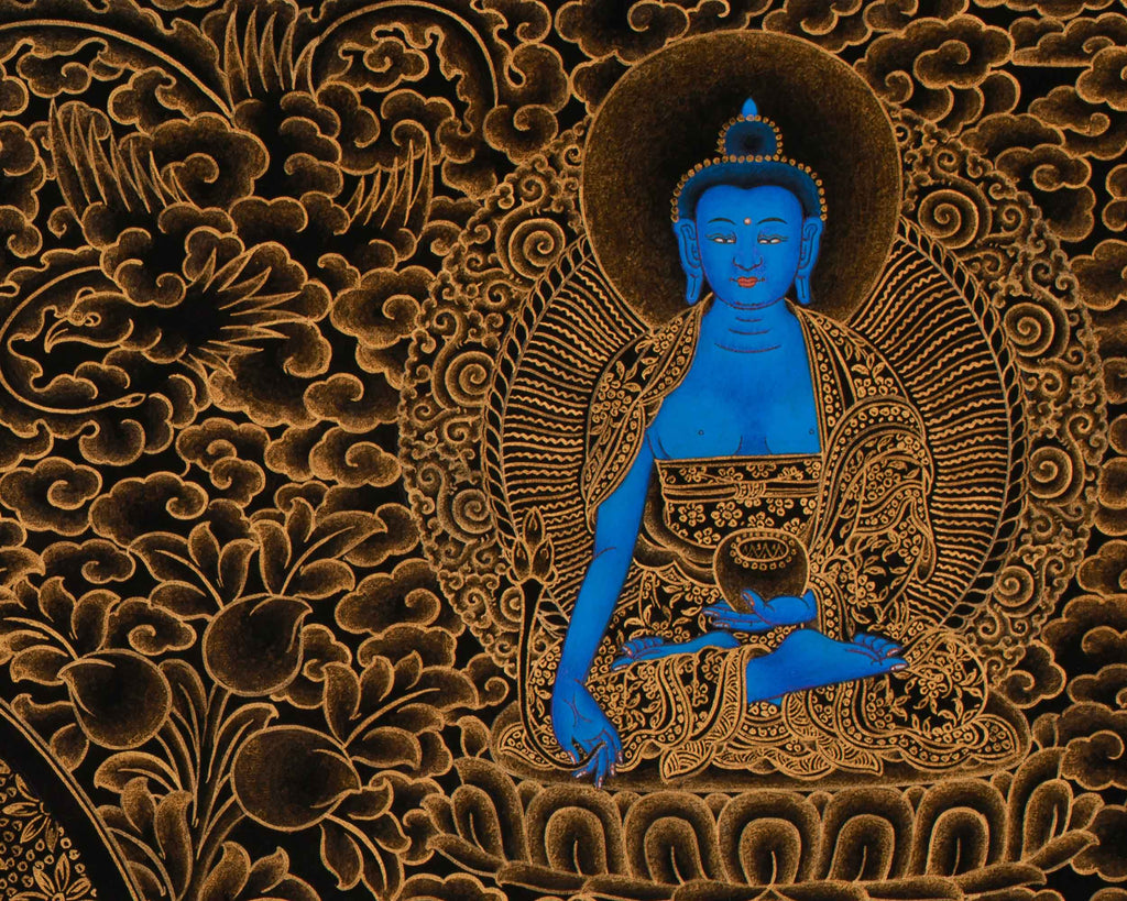 Gold on Black Tibetan Four-Armed Chenrezig Thangka | With Manjushri, Vajrapani, Shakyamuni, and Medicine Buddha