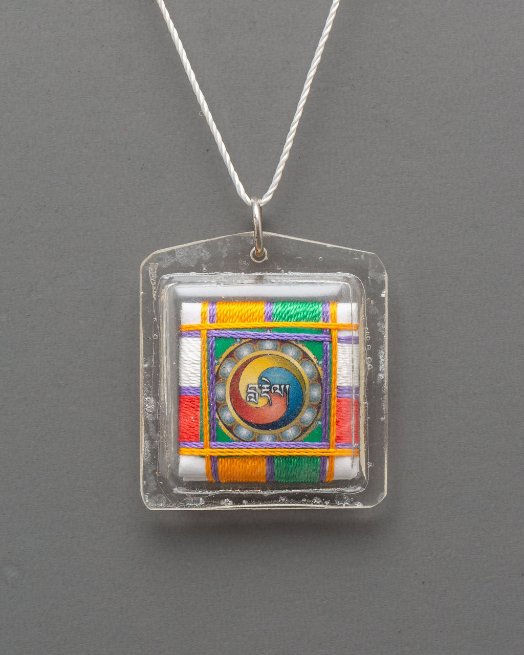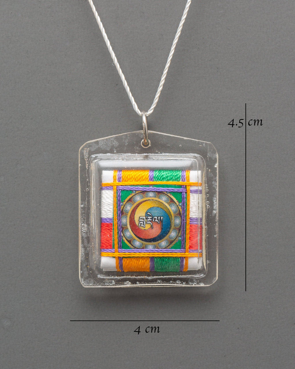 Skilled artisans wrap vibrant threads around a sacred image and seal it in a plastic cover for everyday use. Size 4.5cm (H) x 4cm (W); weight 0.006kg. Materials: Plastic Cover, Canvas, Thread. Compact, colorful, and lightweight, this buti travels easily while adding a touch of Himalayan spirituality to your space.