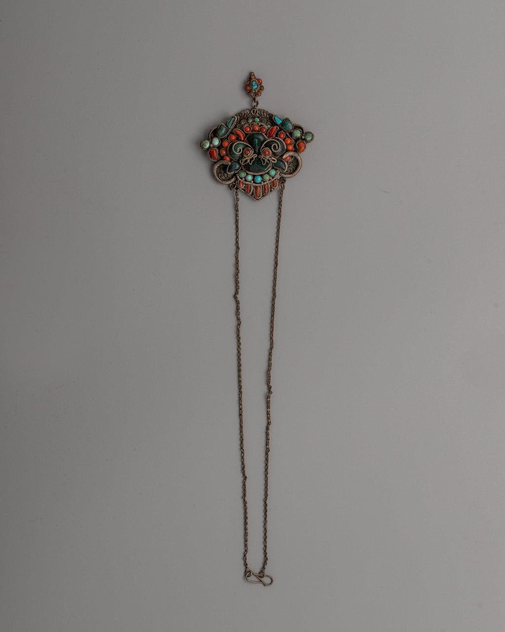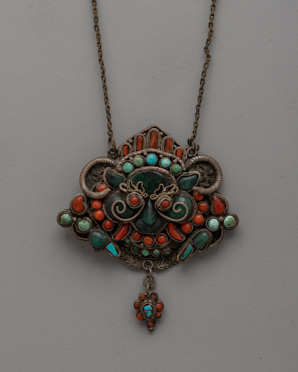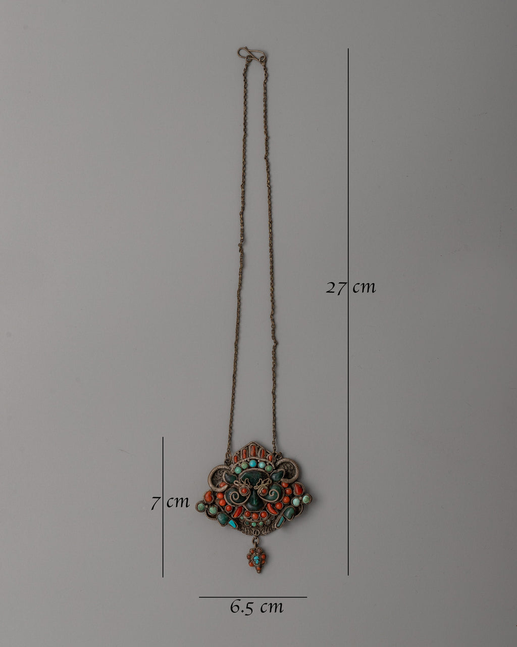 The Tibetan Garuda Dharma Locket, a handmade masterwork that blends tradition and craftsmanship, will protect you. This locket, made of 90% silver and 10% copper, features authentic turquoise, coral, and jadeite stones representing healing, protection, and balance. The elaborate pattern features the Garuda, a beloved symbol of strength and wisdom in Tibetan tradition, making this item an effective talisman for spiritual searchers and aficionados of Tibetan artistry.