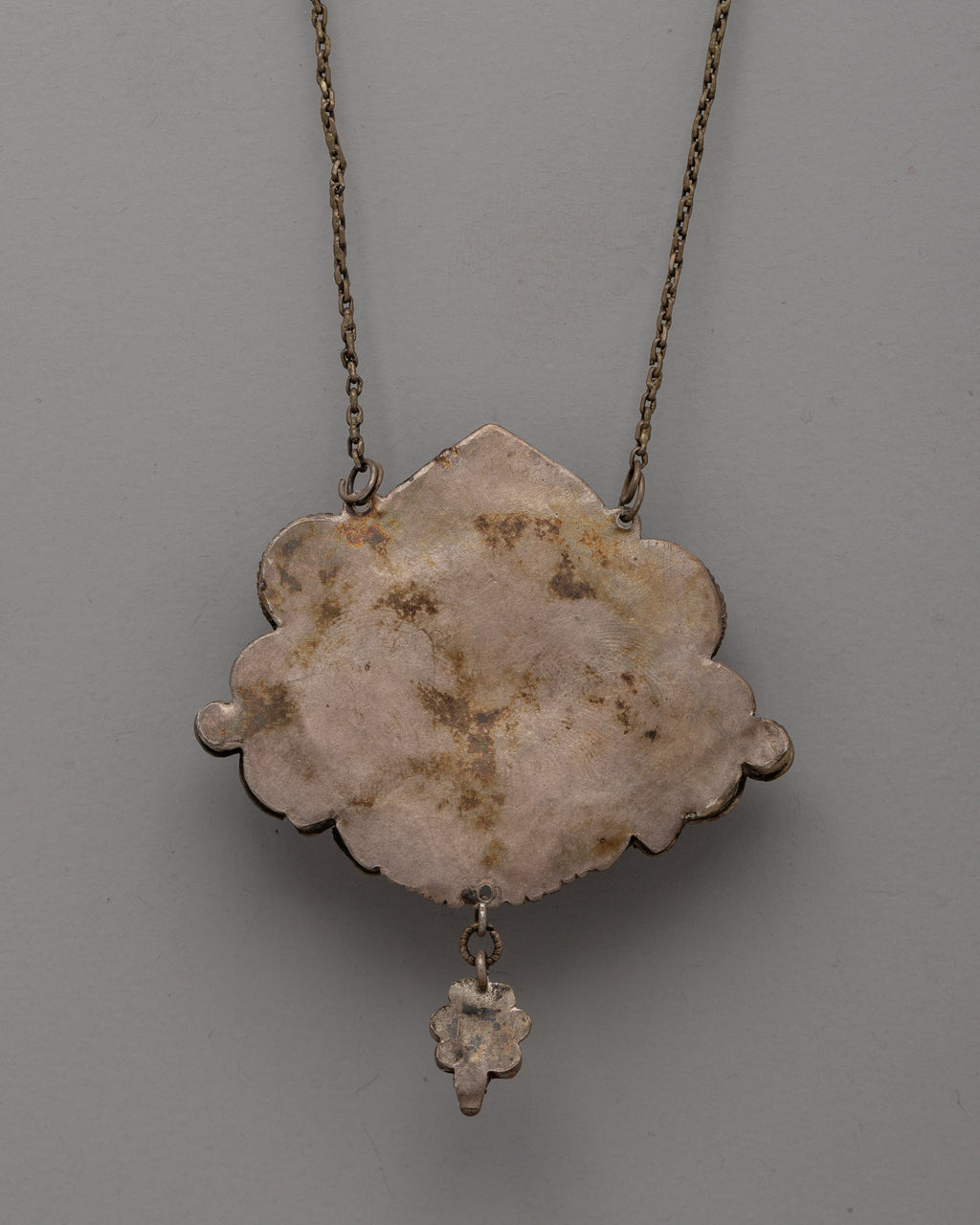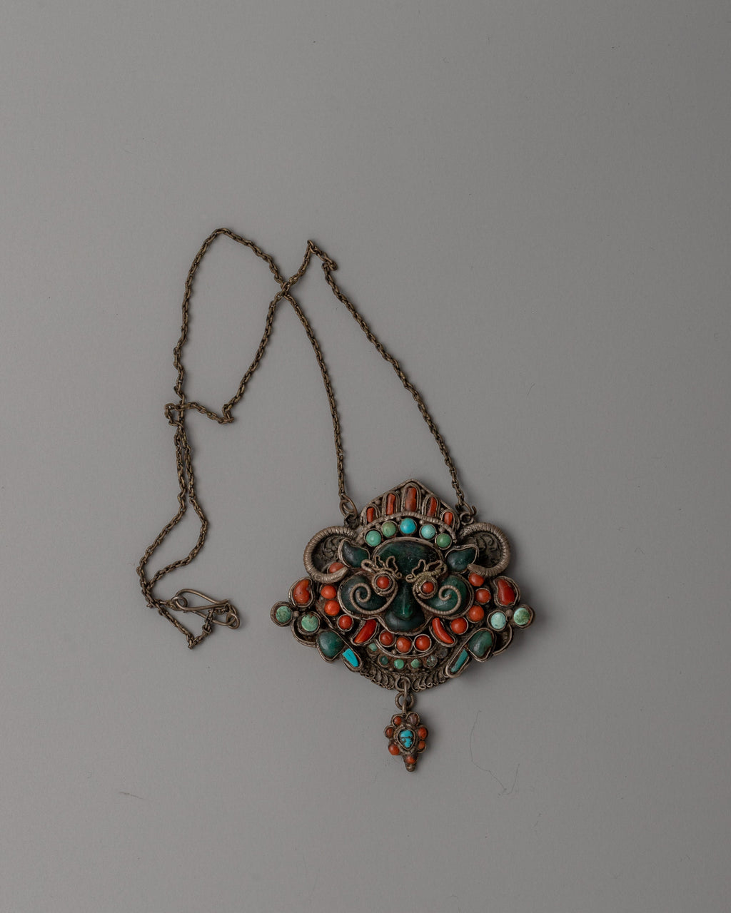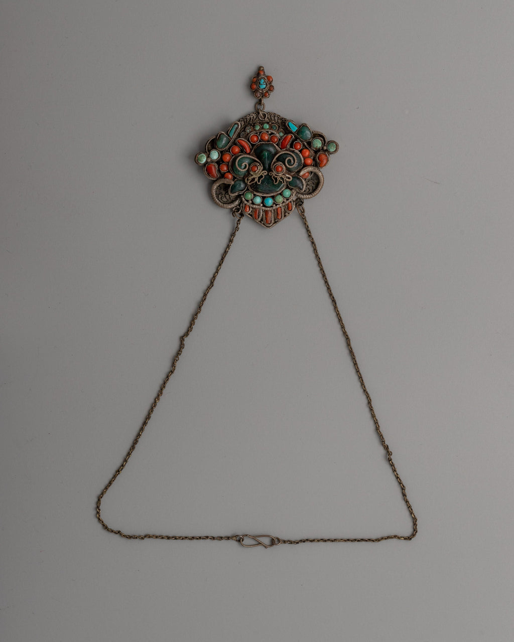 The Tibetan Garuda Dharma Locket, a handmade masterwork that blends tradition and craftsmanship, will protect you. This locket, made of 90% silver and 10% copper, features authentic turquoise, coral, and jadeite stones representing healing, protection, and balance. The elaborate pattern features the Garuda, a beloved symbol of strength and wisdom in Tibetan tradition, making this item an effective talisman for spiritual searchers and aficionados of Tibetan artistry.
