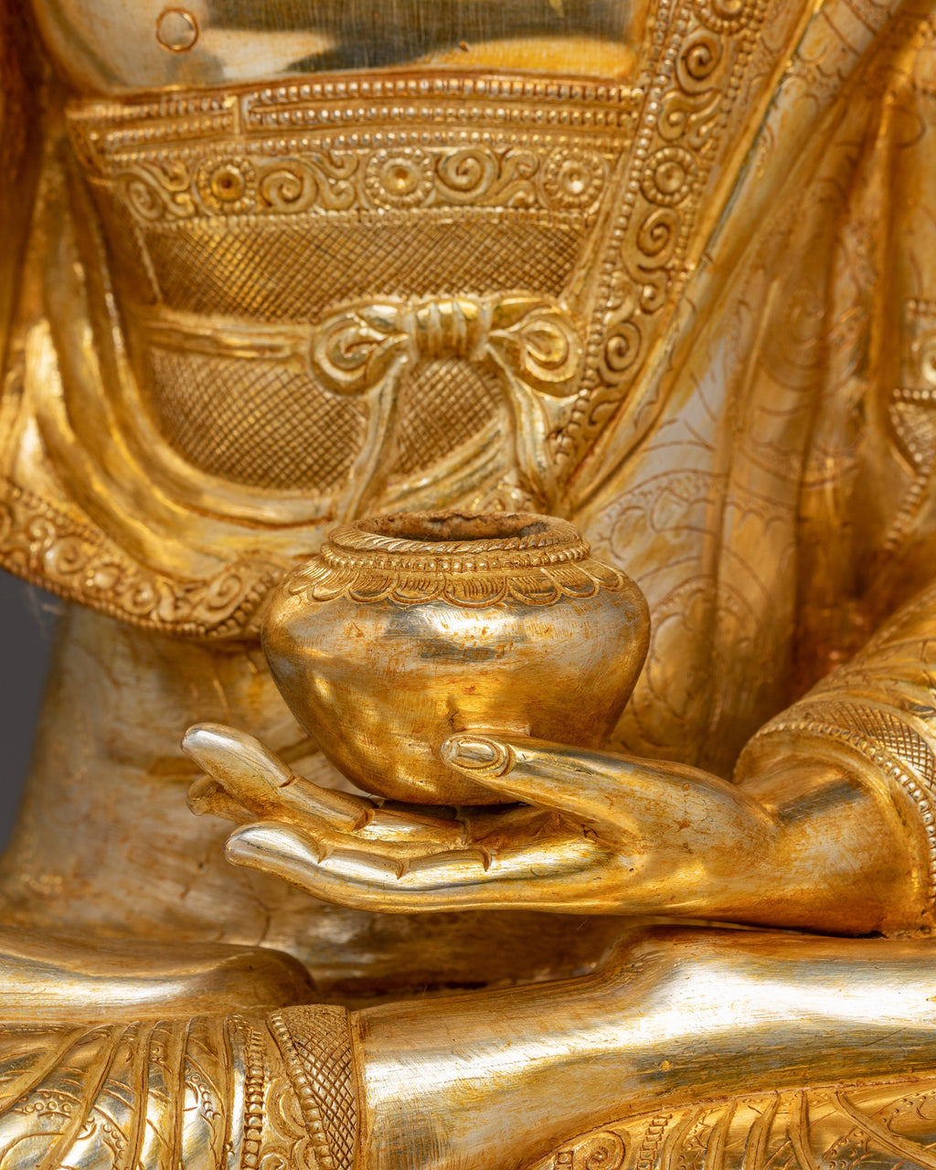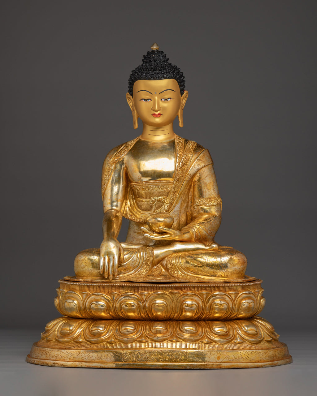 The Tibetan Gautama Buddha Sculpture stands 23.2” (59 cm) tall, with a base width of 19.3” (49 cm), and weighs 15.93 kg. Expertly handcrafted from a copper body, 24K gold gilding, and detailed gold and acrylic paintings. Shakyamuni Buddha, the historical Buddha and founder of Buddhism, is depicted in a serene and meditative posture that symbolizes enlightenment, wisdom, and inner peace. This large and majestic statue is ideal for temple altars, meditation halls, or sacred spaces, offering a powerful presence that inspires spiritual reflection and devotion.
