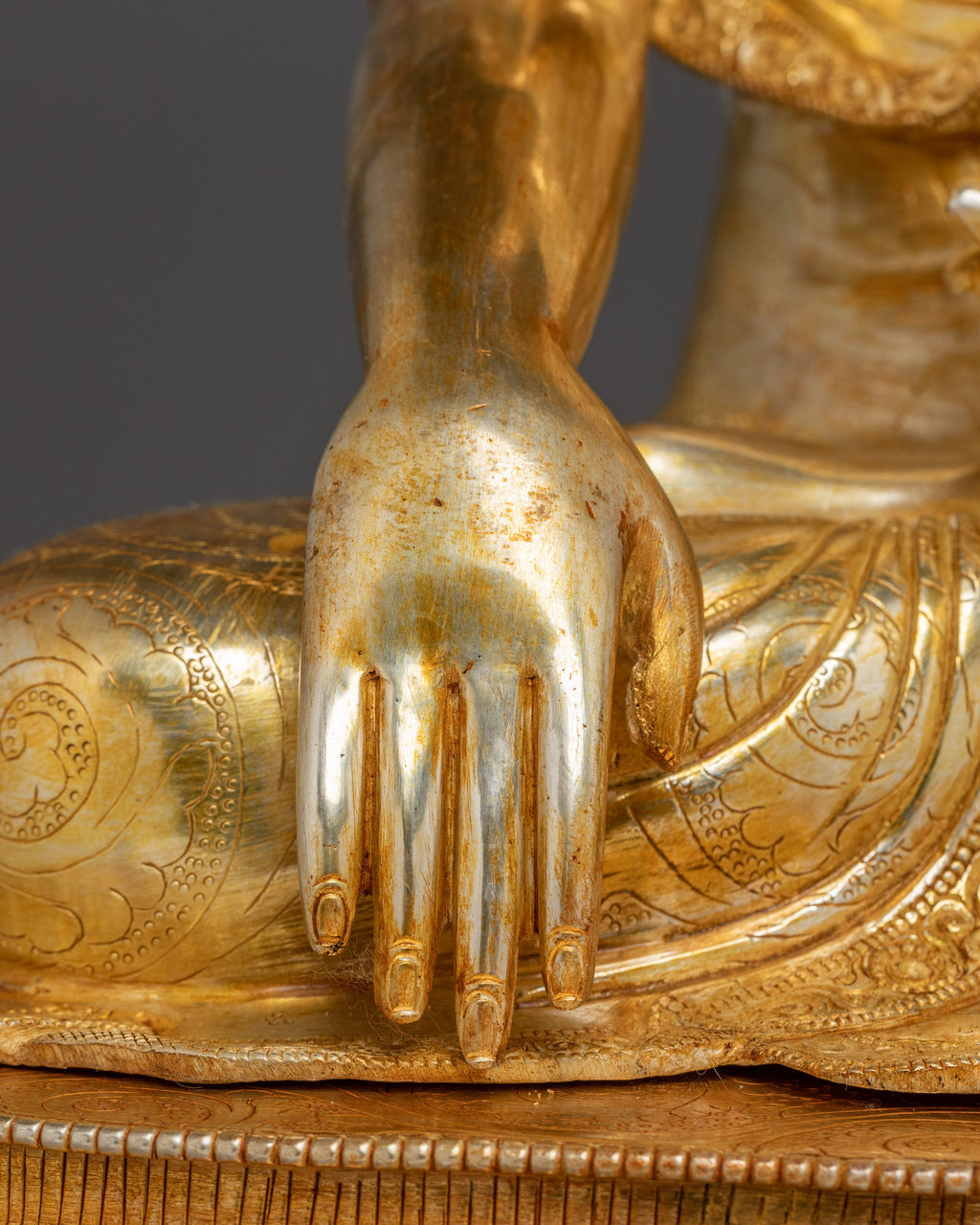 Shakyamuni Buddha is depicted sitting in the lotus pose (padmasana), indicating his steady concentration and mastery over the distractions of the material world. His right hand stretched toward the earth in the bhumisparsha mudra, representing his moment of enlightenment, as he invited the earth to witness his awakening. The left hand, lying gently in his lap in dhyana mudra holding an alms bowl, depicts the profound state of meditation and mindfulness that leads to insight and clarity.