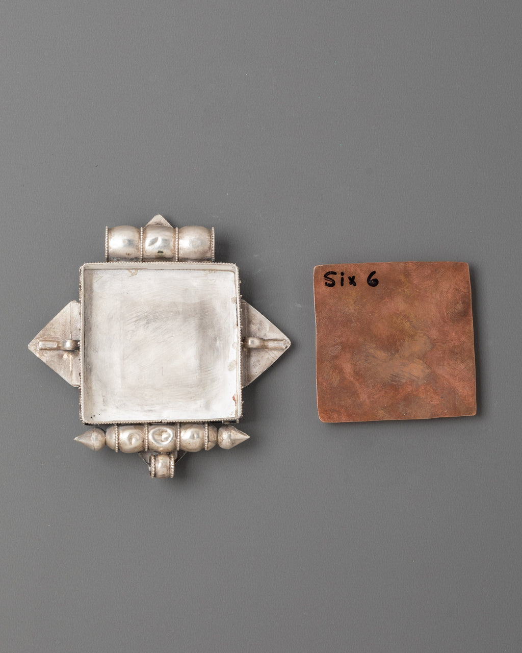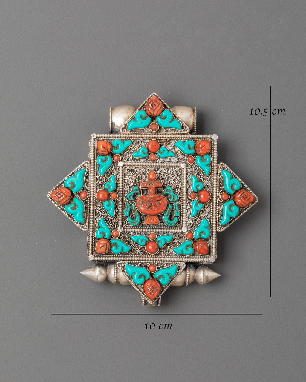 This Ghau Locket with Coral is a beautifully handcrafted silver locket, accented with vibrant coral and turquoise stones. Measuring 10.5cm in height and 10cm in width, it is designed as a sacred container for spiritual items, prayers, or small relics, making it an essential piece for altars or ritual practices.
