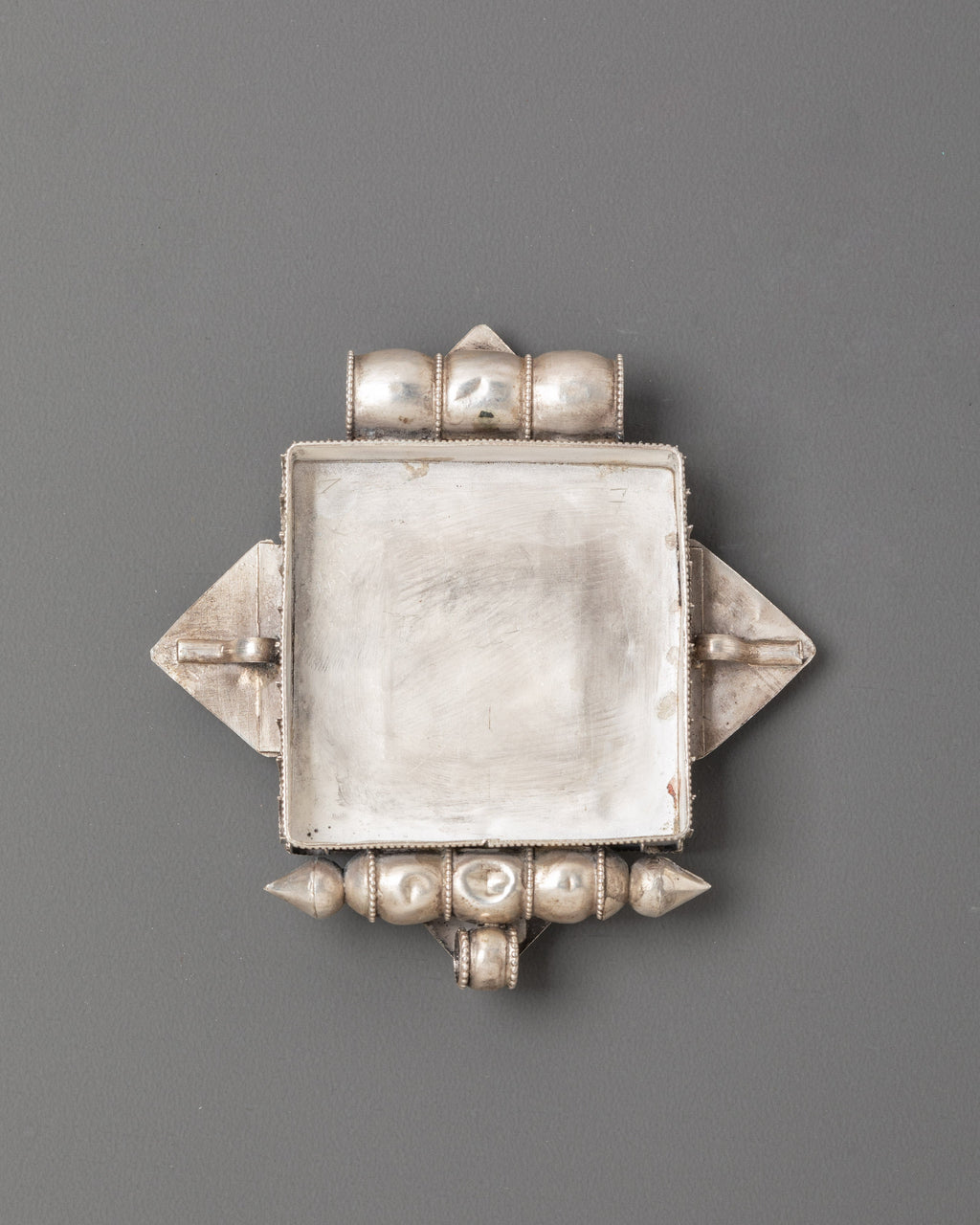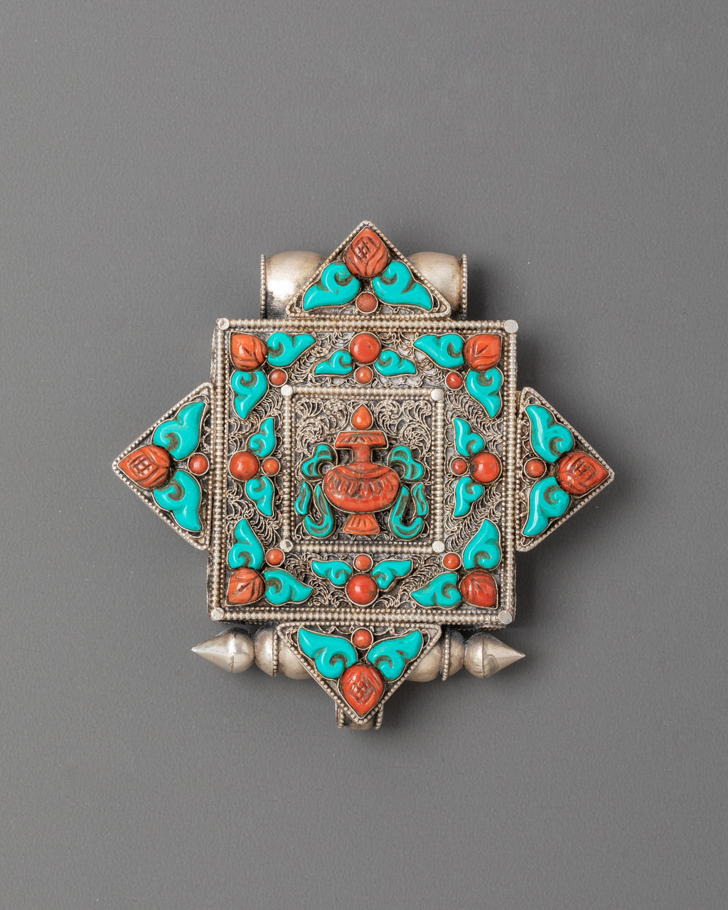 The silver construction ensures elegance, while the semi-precious stones add both spiritual significance and decorative beauty. In Tibetan tradition, Ghau lockets serve as portable shrines to carry sacred prayers and protective talismans. This locket combines practicality with spiritual symbolism, keeping your treasured ritual items safe while enhancing the sacredness of your space.