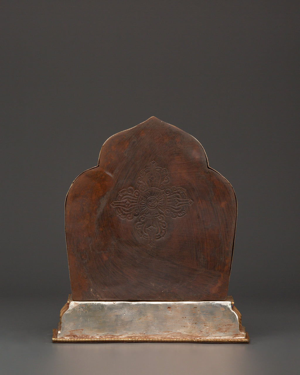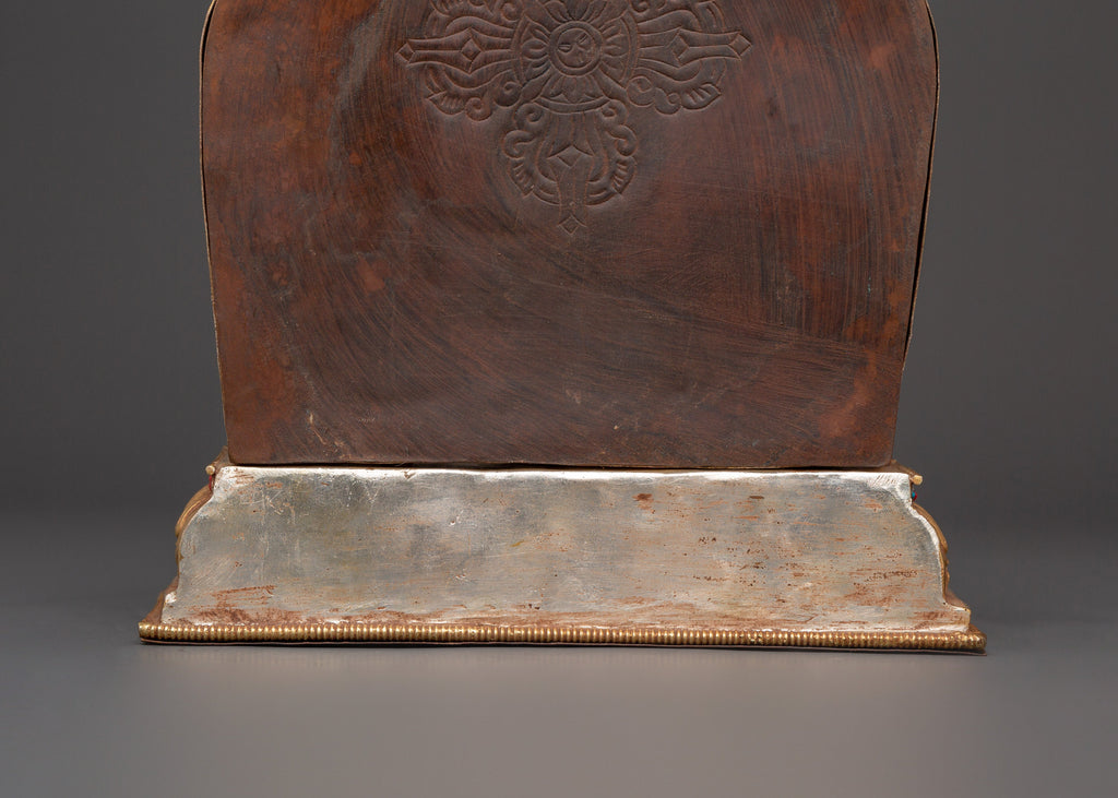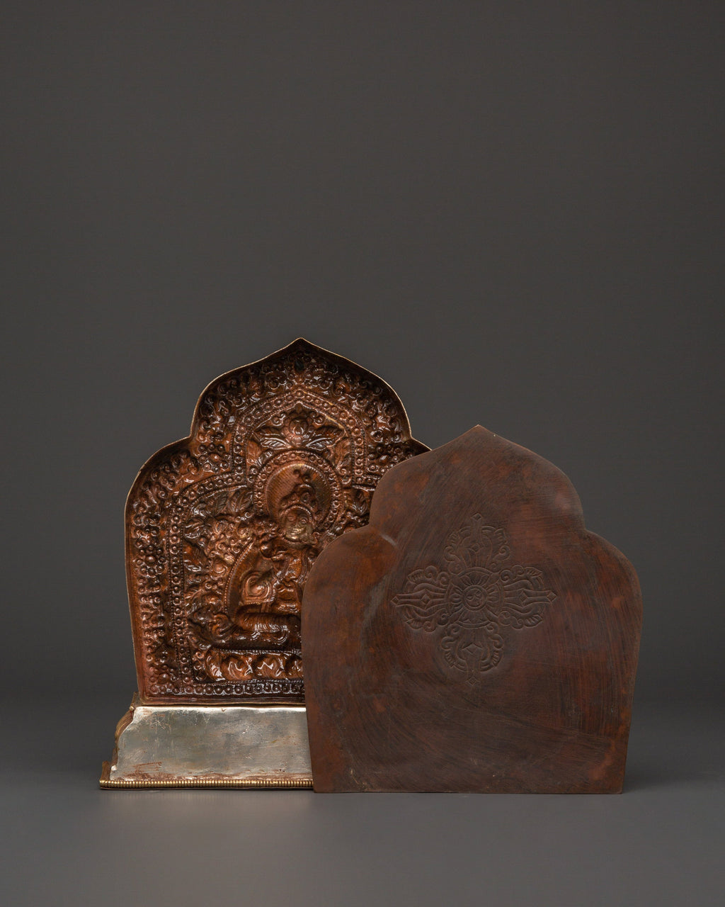 This Tibetan Ghau Prayer Box Pendant is a stunning handcrafted spiritual locket that has long been used in Himalayan civilizations to contain sacred relics, mantras, and protective charms. This hefty piece, which measures 21 cm in height and 18.5 cm in width and weighs 0.59 kg, is formed of a copper body that has been painstakingly gold and silver plated and studded with semi-precious turquoise and coral stones. The front of the Ghau box is decorated with religious themes and floral engravings that symbolize Tibetan Buddhism's creativity and spiritual symbols. Its vivid gemstone inlay adds to its visual attractiveness and symbolizes healing, strength, and protection.