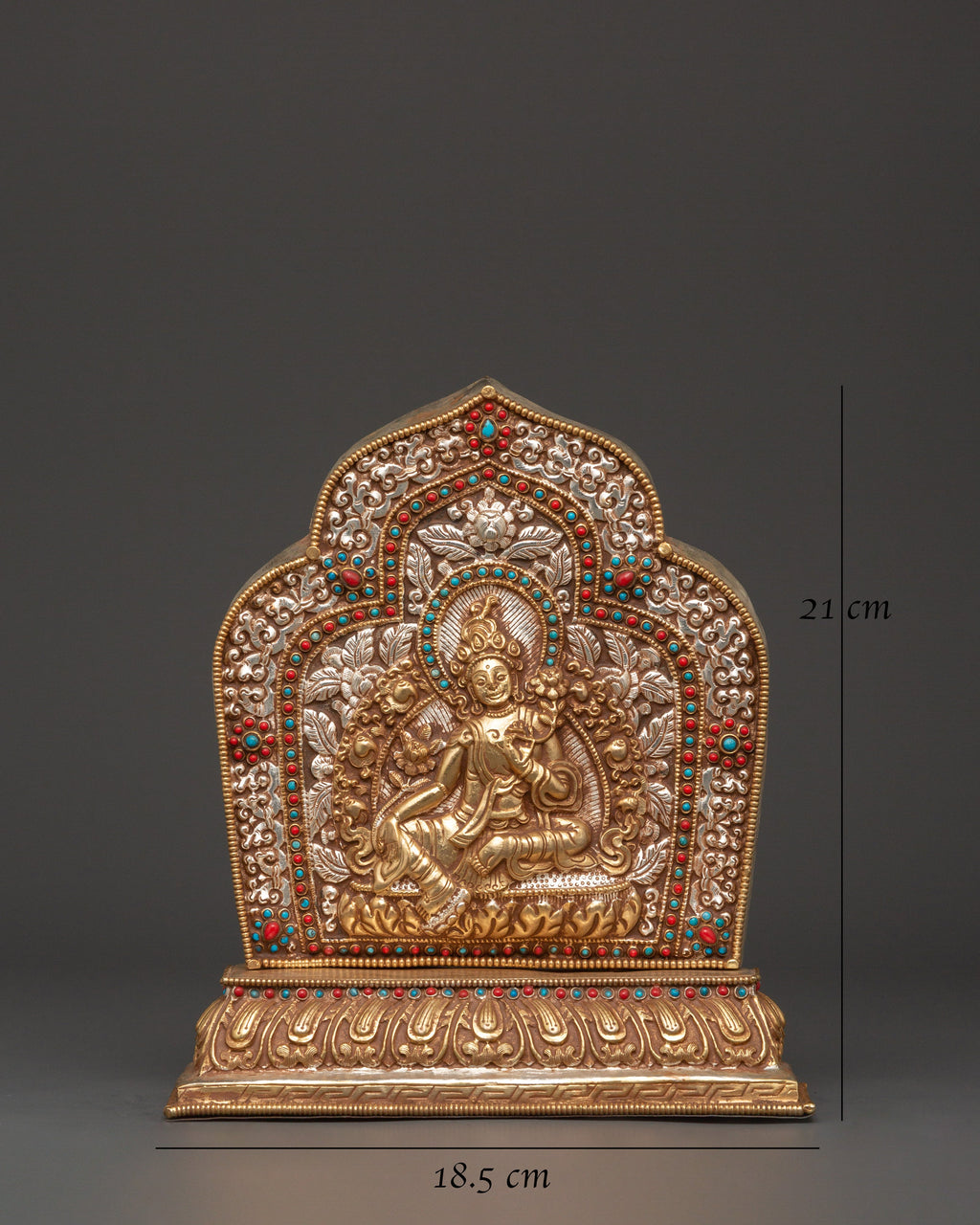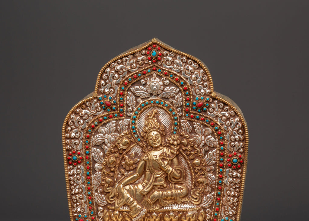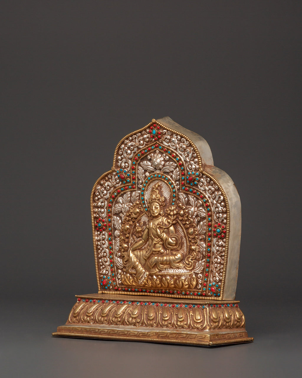 This Tibetan Ghau Prayer Box Pendant is a stunning handcrafted spiritual locket that has long been used in Himalayan civilizations to contain sacred relics, mantras, and protective charms. This hefty piece, which measures 21 cm in height and 18.5 cm in width and weighs 0.59 kg, is formed of a copper body that has been painstakingly gold and silver plated and studded with semi-precious turquoise and coral stones. The front of the Ghau box is decorated with religious themes and floral engravings that symbolize Tibetan Buddhism's creativity and spiritual symbols. Its vivid gemstone inlay adds to its visual attractiveness and symbolizes healing, strength, and protection.