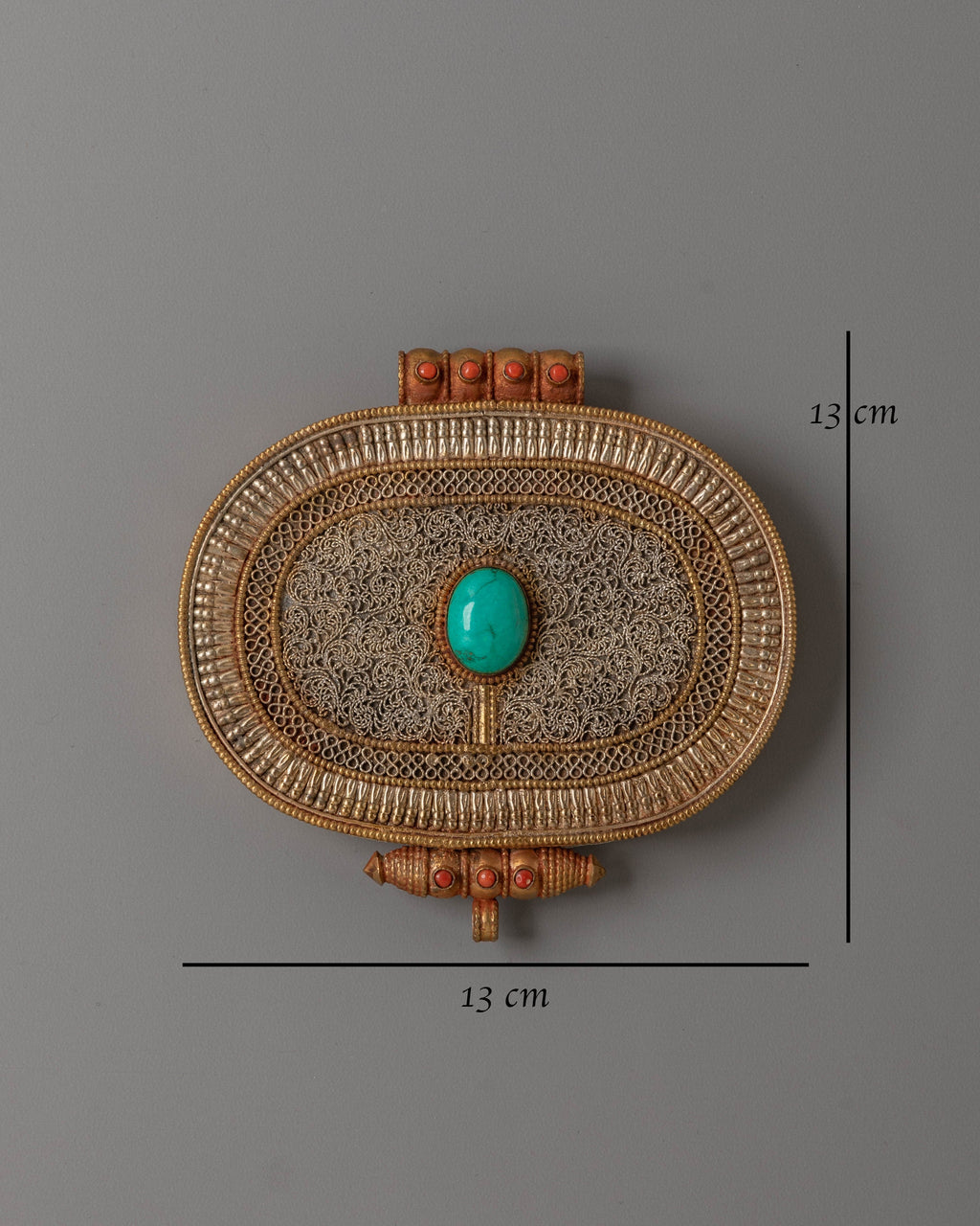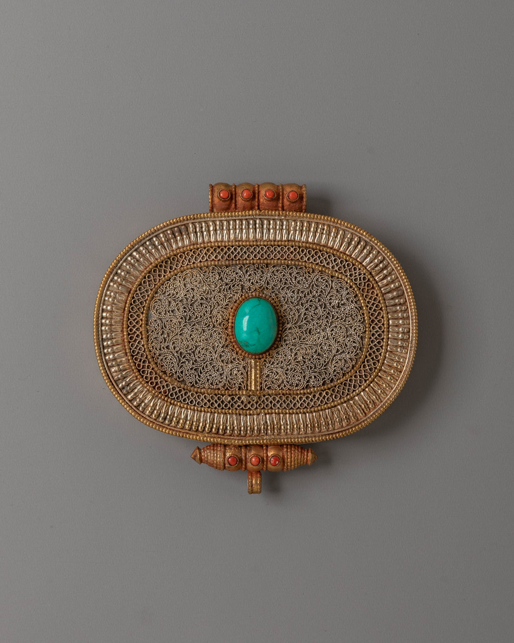 The edges of the pendant are adorned with warm coral stones, which have long been valued across Tibetan culture for their symbolic association with vitality and spiritual strength. The surrounding metalwork features intricate motifs inspired by ancient Tibetan artistry, representing compassion, protection, and spiritual guidance. These motifs are thoughtfully arranged to honor the heritage of the Ghau, a traditionally used vessel for holding prayer scrolls or small blessed items.