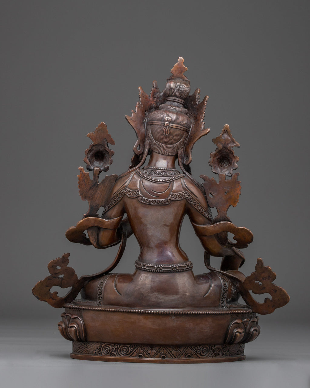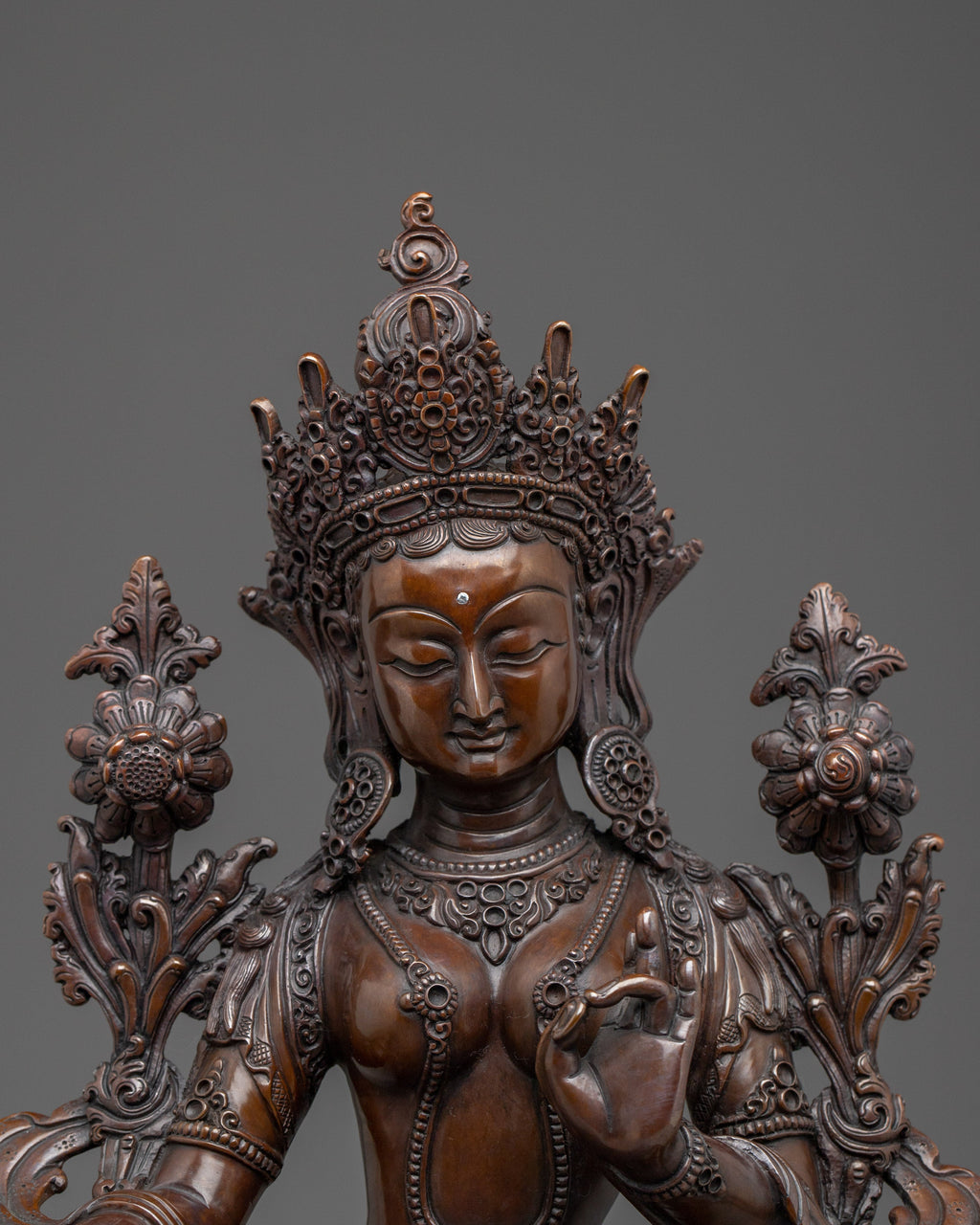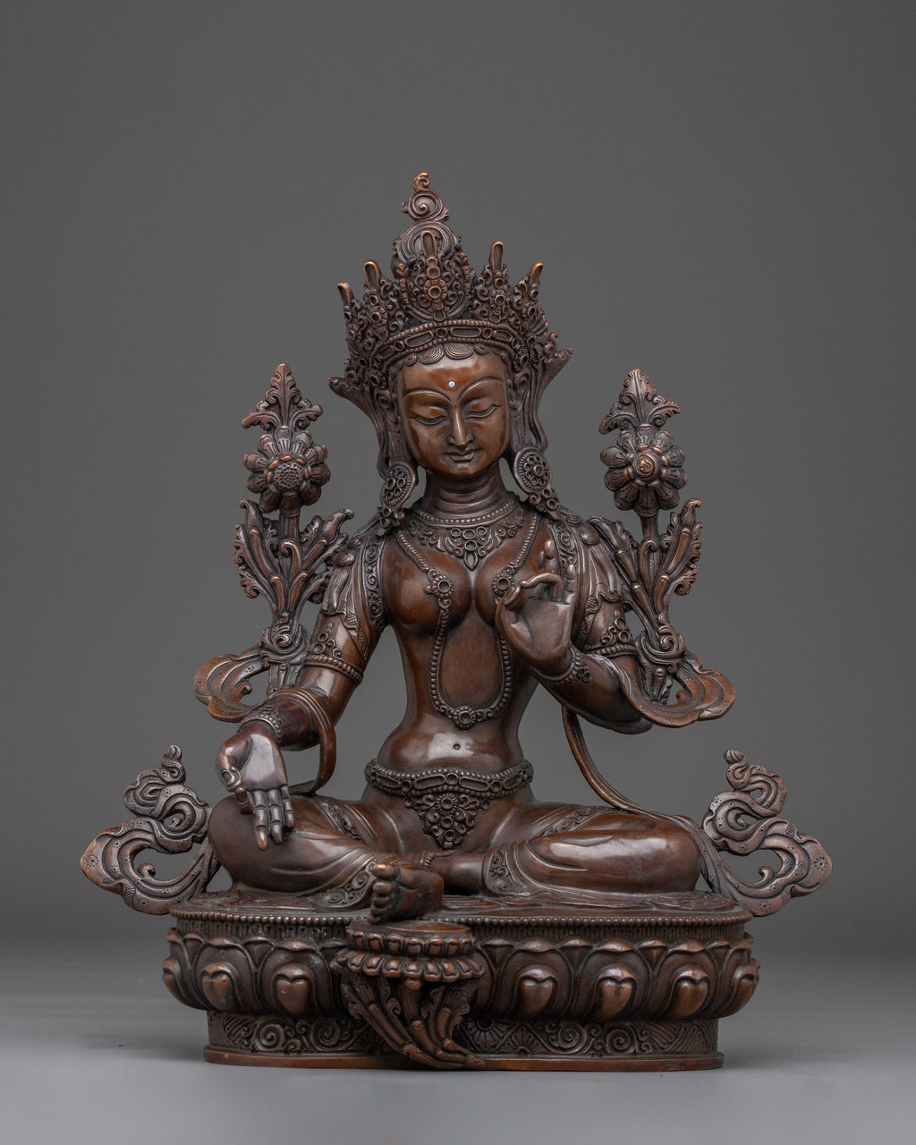 Tibetan Green Tara Artwork is meticulously handcrafted from an oxidized copper body, capturing the serene and compassionate essence of the beloved Tibetan deity. Measuring 13.4”/34cm in height and 11.6”/29.5cm at the base, it weighs 4.47 kg. Revered as the Mother of Liberation, Green Tara is known for her swift compassion and protection from fear and suffering. This statue is a meaningful addition to any spiritual space, altar, or meditation area.